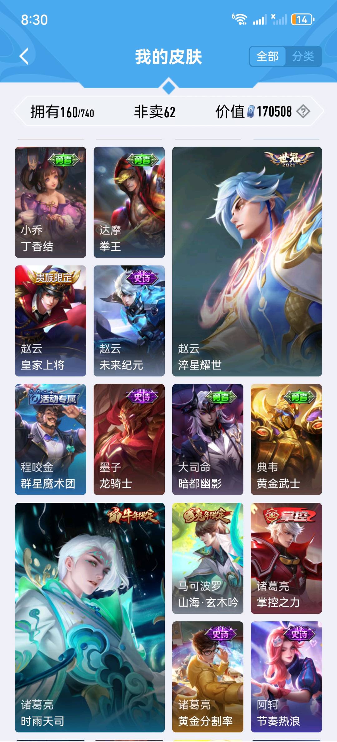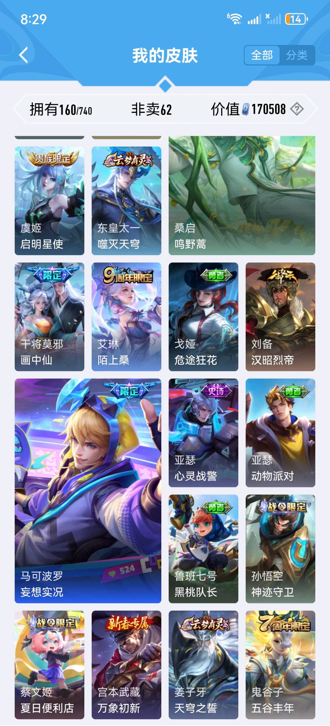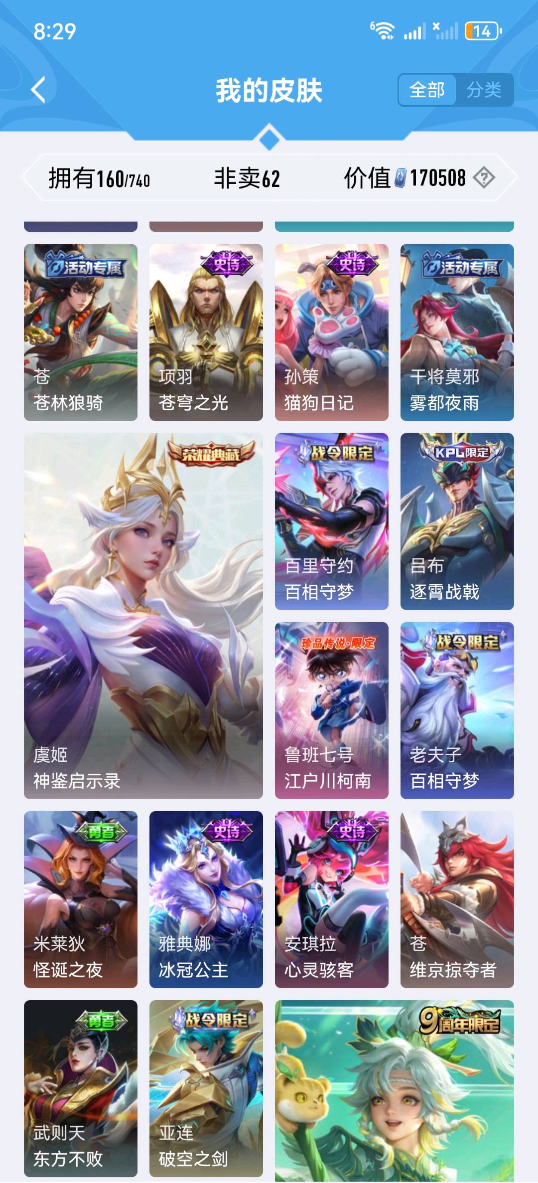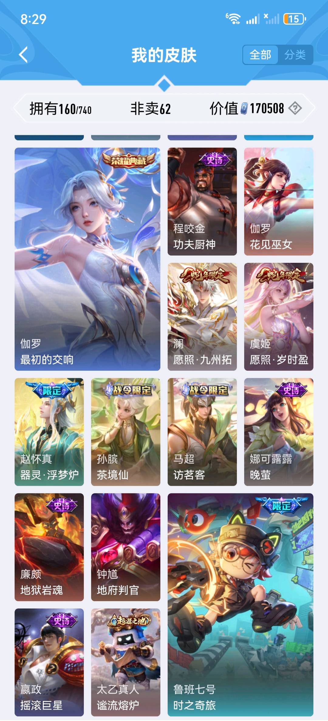 贵族等级:v8皮肤数:160传说品质19 情人节限定2 生肖限定6 荣耀典藏2 珍品传说1 英雄数:125