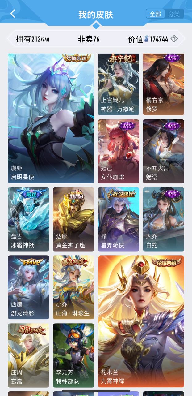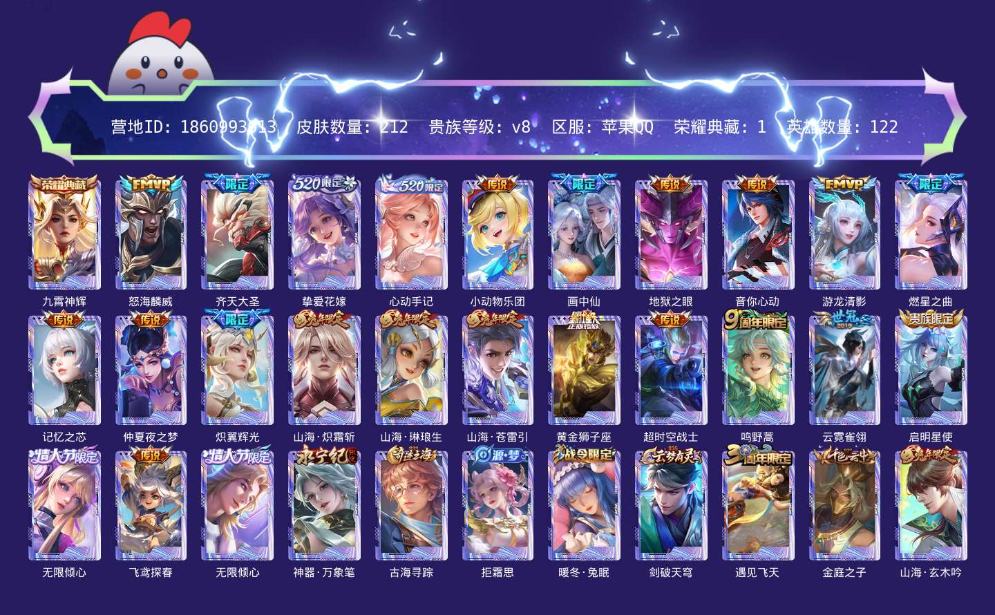 贵族等级:v8皮肤数:212生肖限定6 传说品质24 情人节限定3 荣耀典藏1 英雄数:122