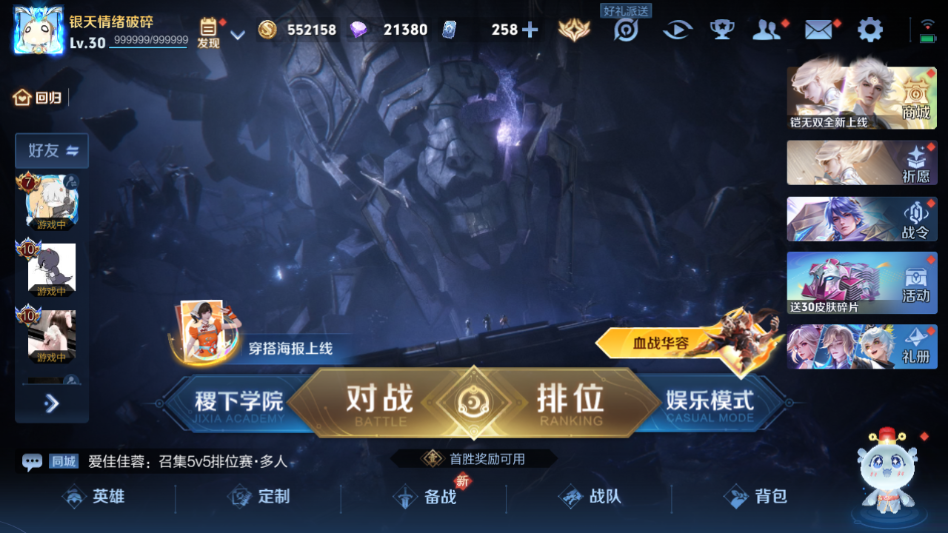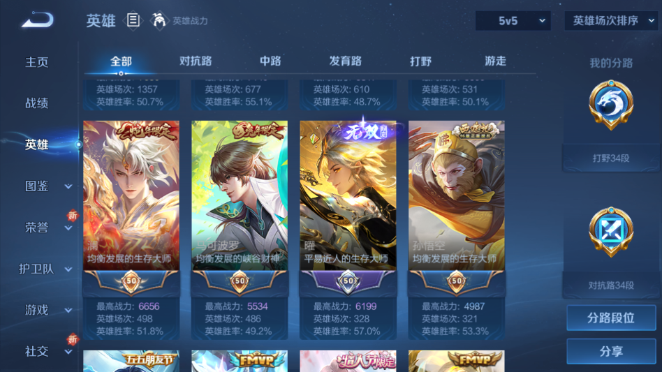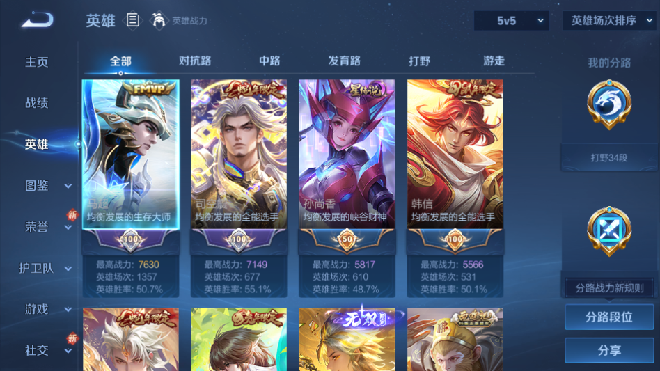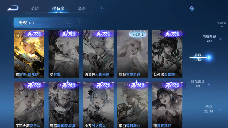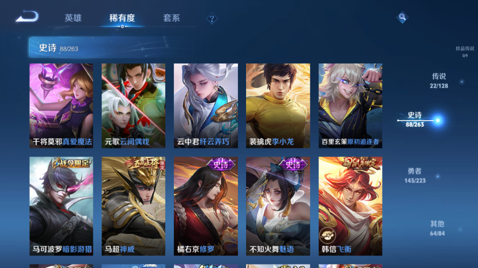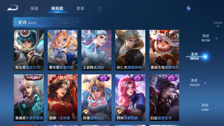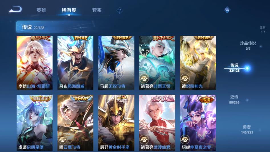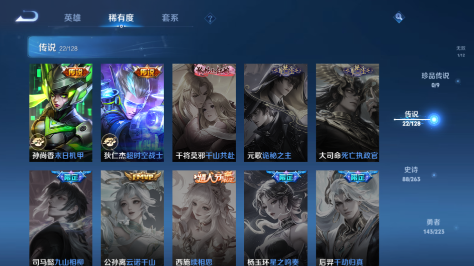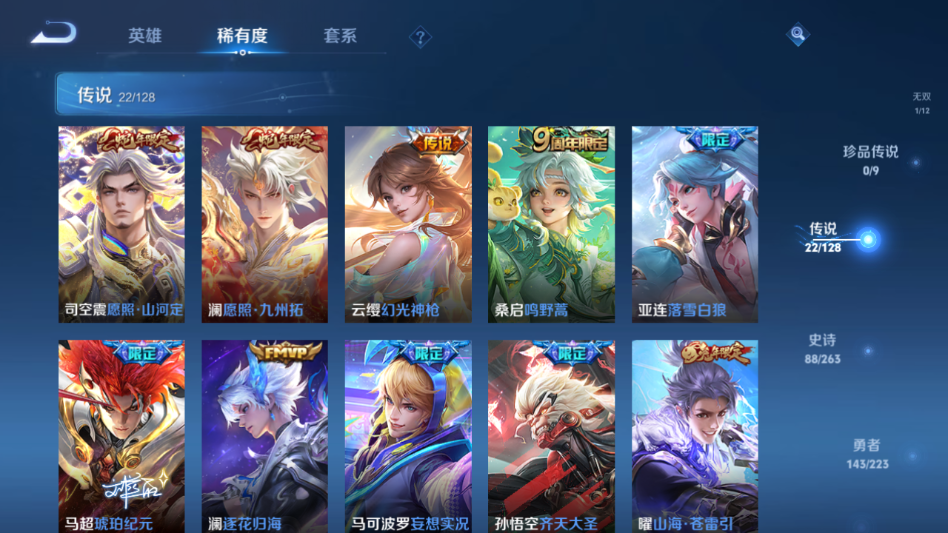 贵族等级:v8皮肤数:320传说品质22 生肖限定7 情人节限定2 荣耀典藏2 无双1 英雄数:125