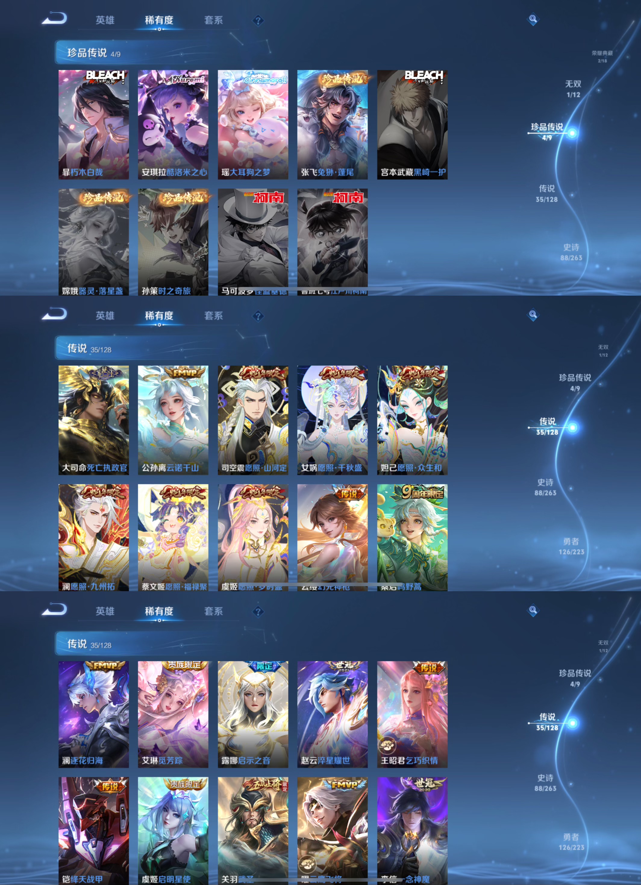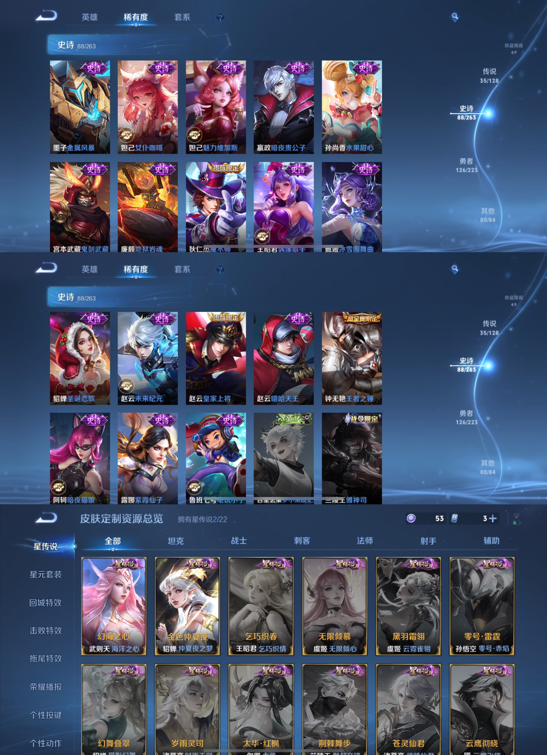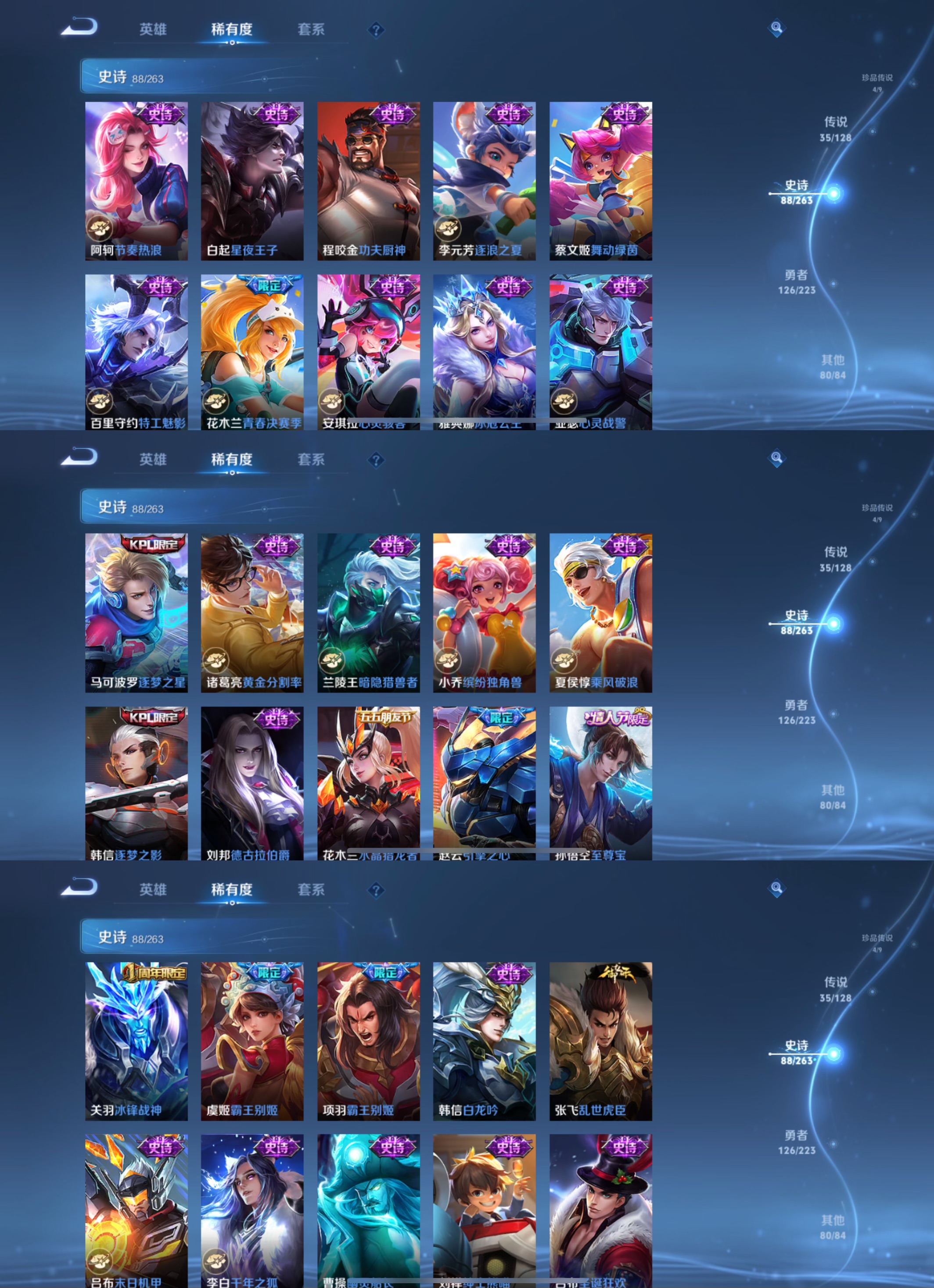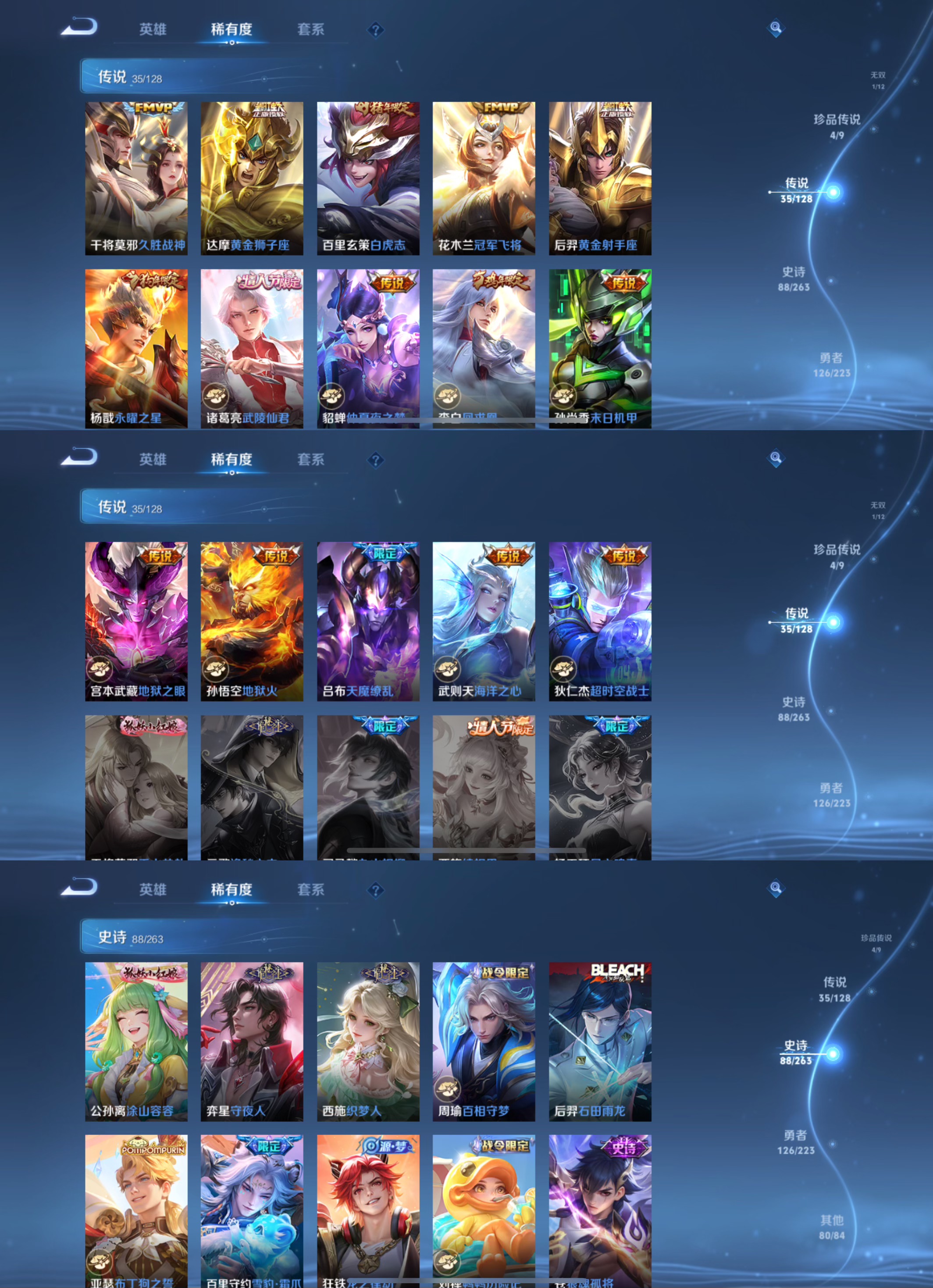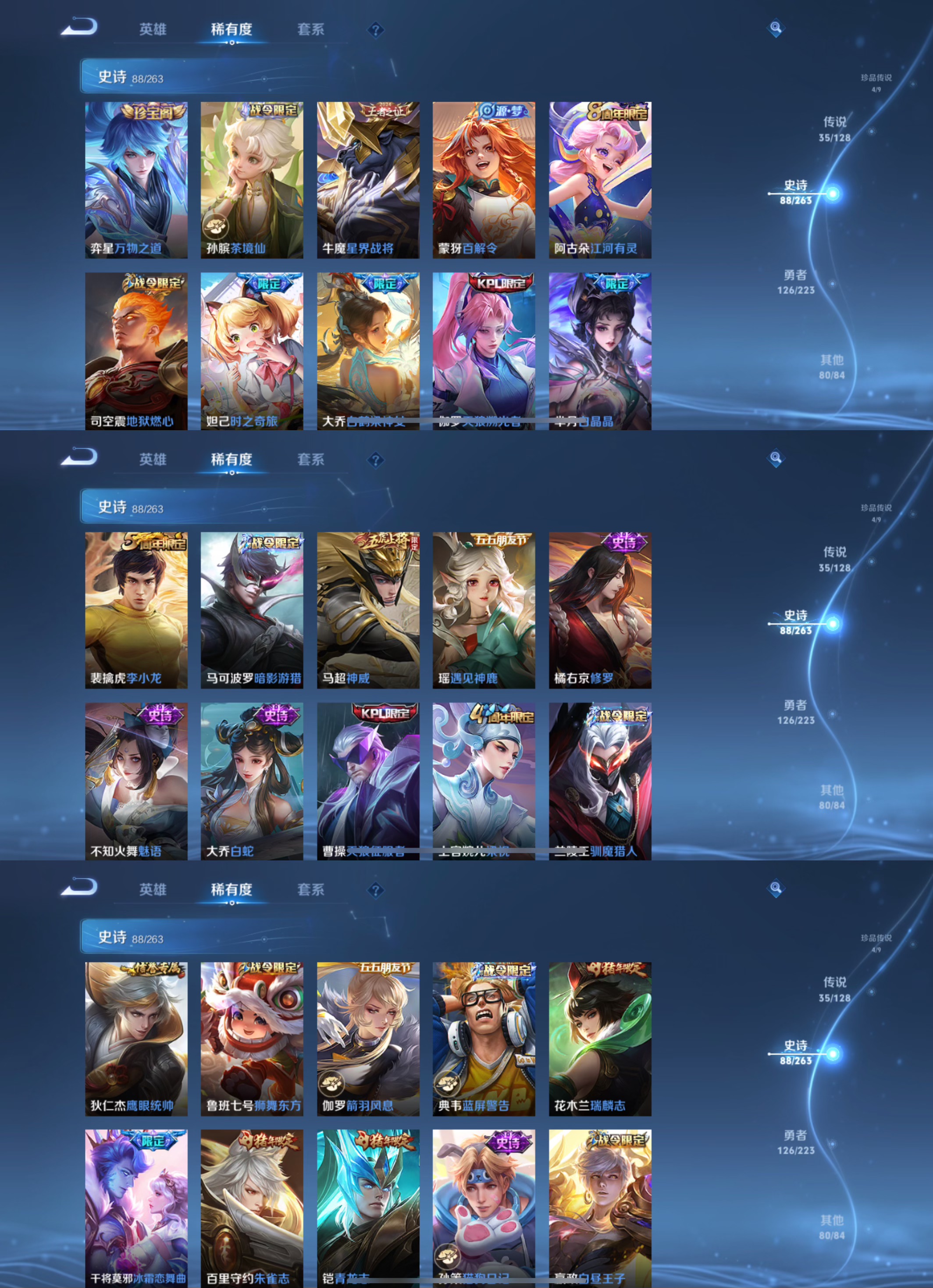 传说品质_后羿_黄金射手座传说品质_艾琳_觅芳踪传说品质_司空震_愿照·山河定传说品质_关羽_武圣传说品质_澜_逐花归海传说品质_澜_愿照·九州拓传说品质_女娲_愿照·千秋盛传说品质_诸葛亮_武陵仙君传说品质_吕布_天魔缭乱传说品质_孙悟空_地狱火传说品质_妲己_愿照·众生和传说品质_云缨_幻光神枪传说品质_李白_凤求凰传说品质_武则天_海洋之心传说品质_蔡文姬_愿照·福禄聚传说品质_杨戬_永曜之星传说品质_干将莫邪_久胜战神传说品质_宫本武藏_地狱之眼传说品质_花木兰_冠军飞将传说品质_大司命_死亡执政官传说品质_公孙离_云诺千山传说品质_貂蝉_仲夏夜之梦传说品质_李信_一念神魔传说品质_孙尚香_末日机甲传说品质_曜_云鹰飞将传说品质_达摩_黄金狮子座传说品质_狄仁杰_超时空战士传说品质_桑启_鸣野蒿传说品质_露娜_启示之音传说品质_铠_绛天战甲传说品质_虞姬_启明星使传说品质_虞姬_愿照·岁时盈传说品质_百里玄策_白虎志传说品质_赵云_淬星耀世传说品质_王昭君_乞巧织情