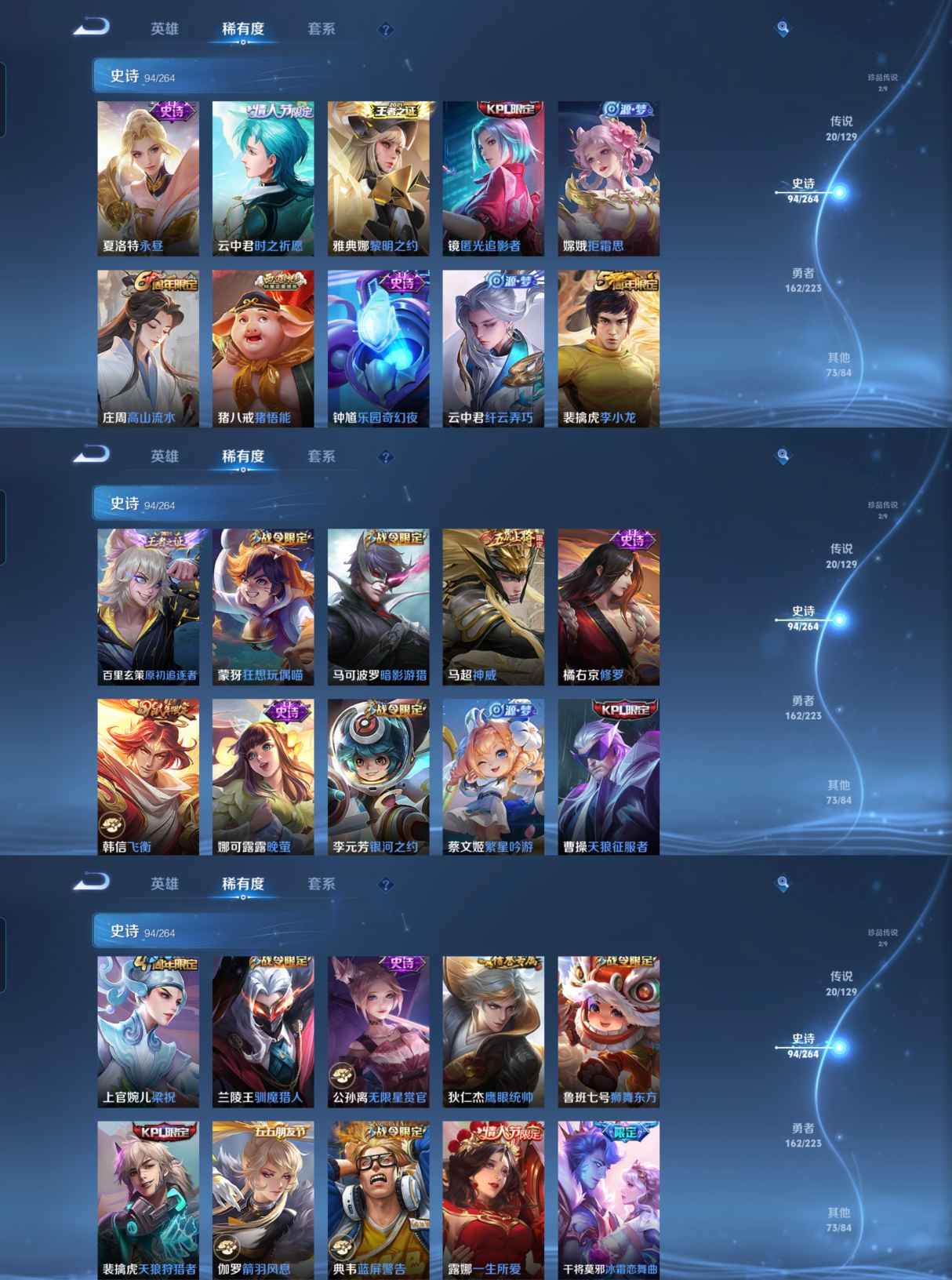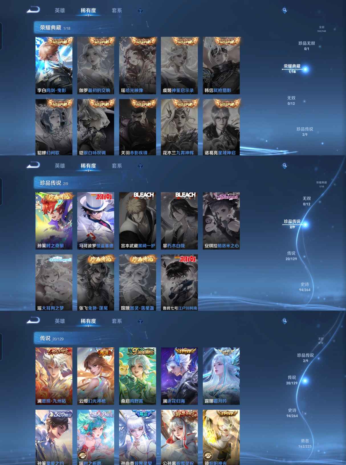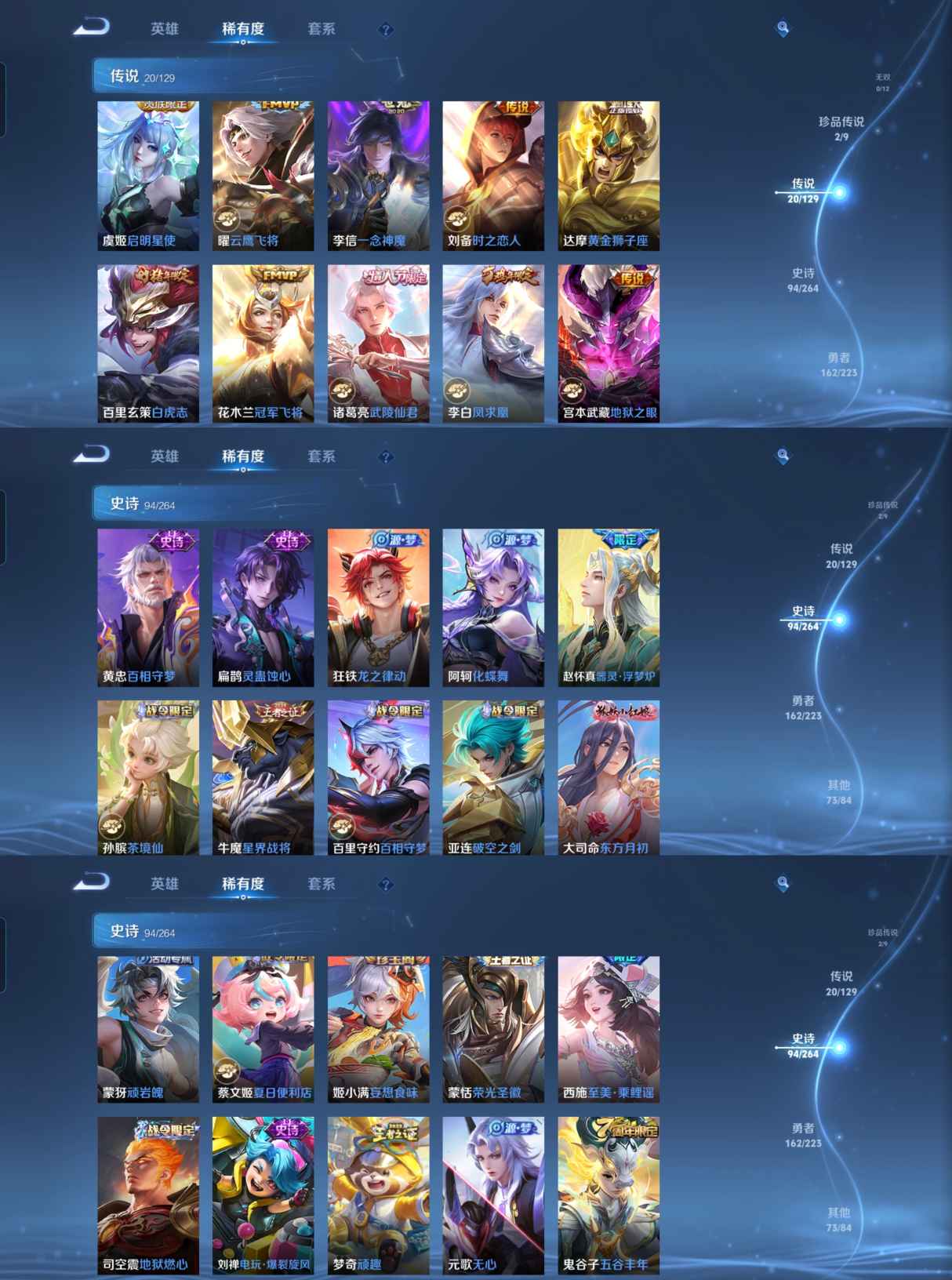 贵族等级:v8皮肤数:352情人节限定4 传说品质20 生肖限定7 珍品传说2 荣耀典藏1 英雄数:126