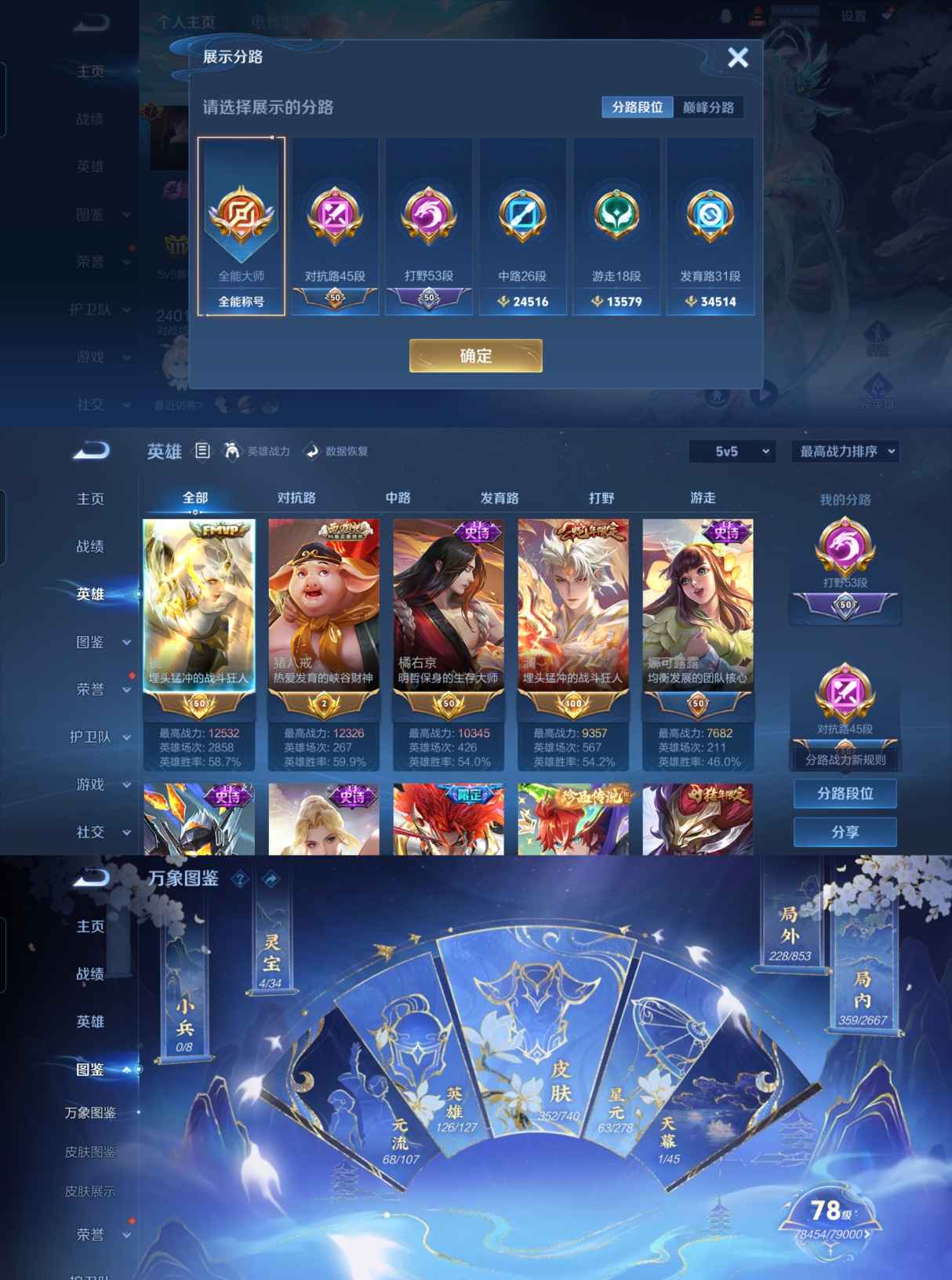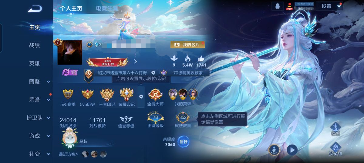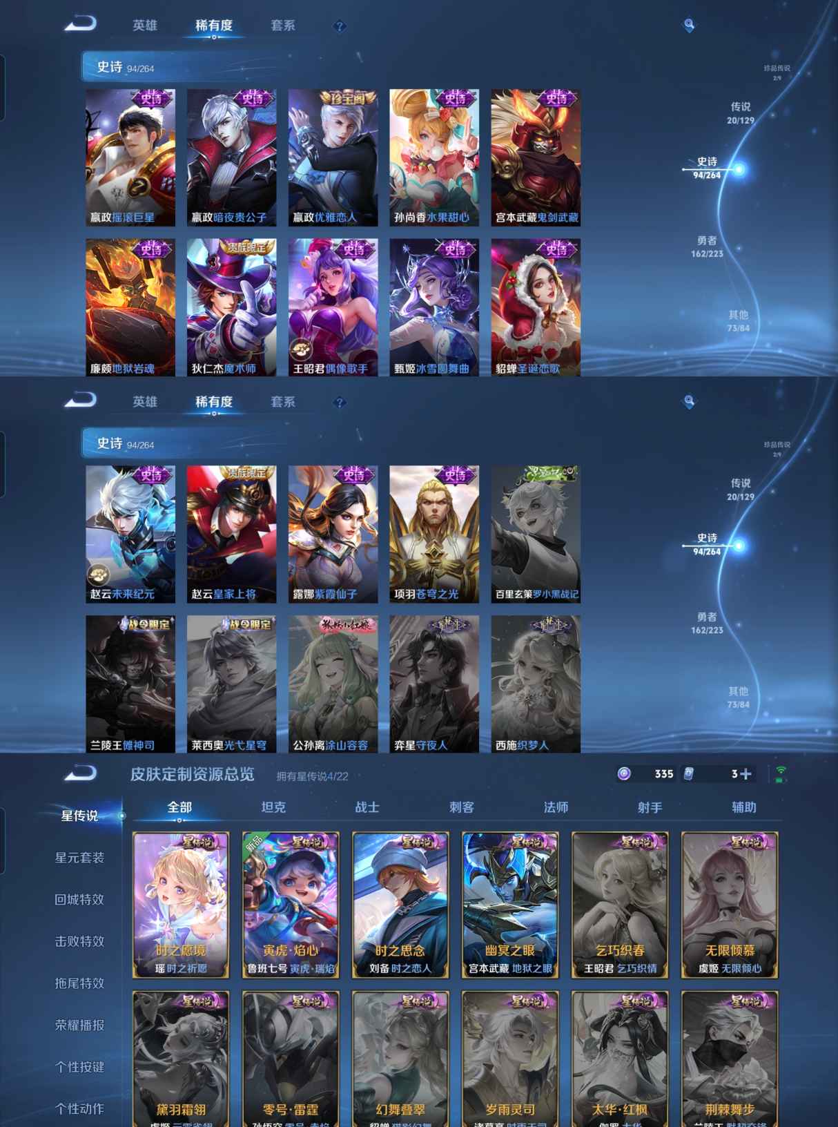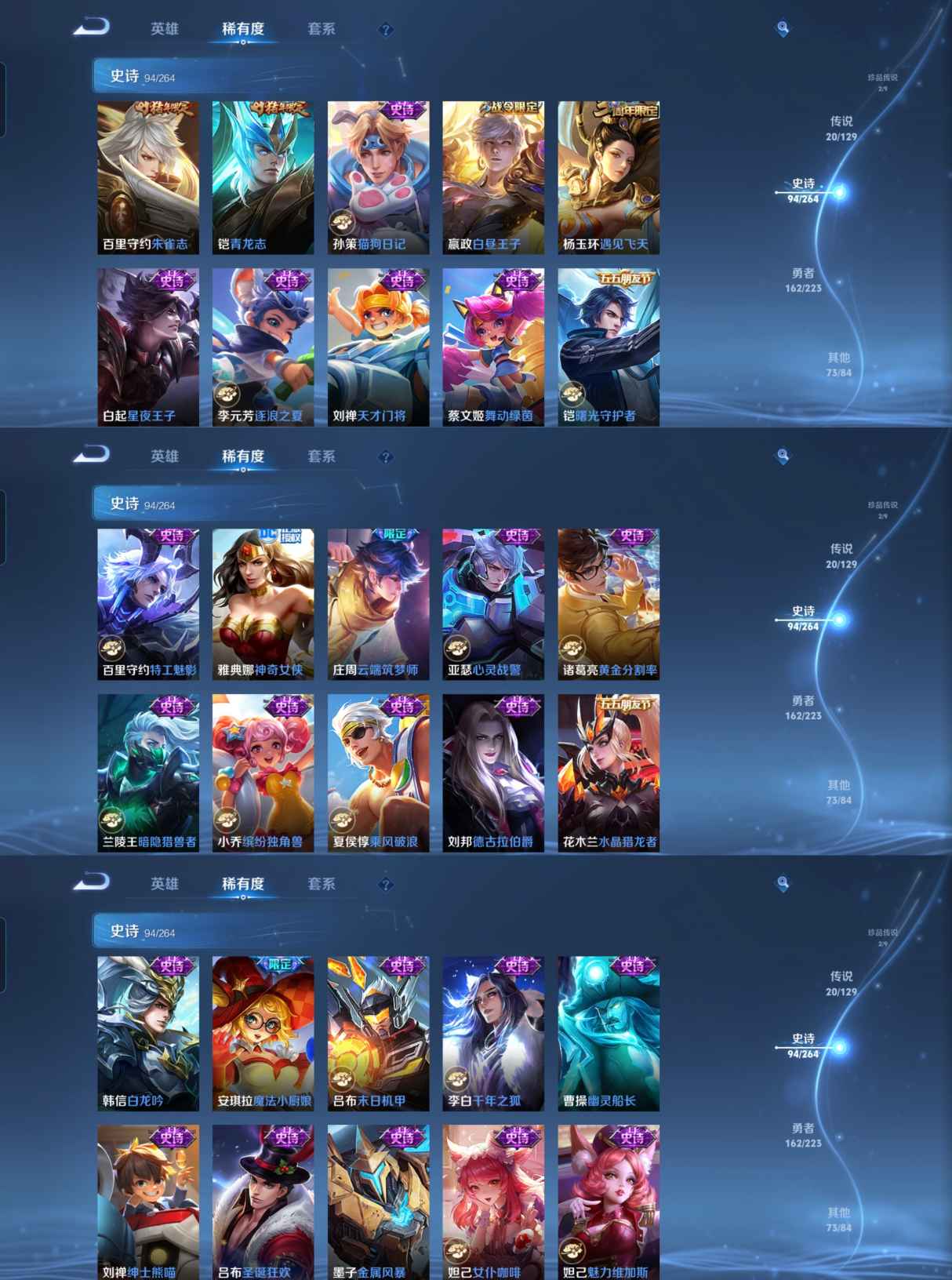 贵族等级:v8皮肤数:352情人节限定4 传说品质20 生肖限定7 珍品传说2 荣耀典藏1 英雄数:126