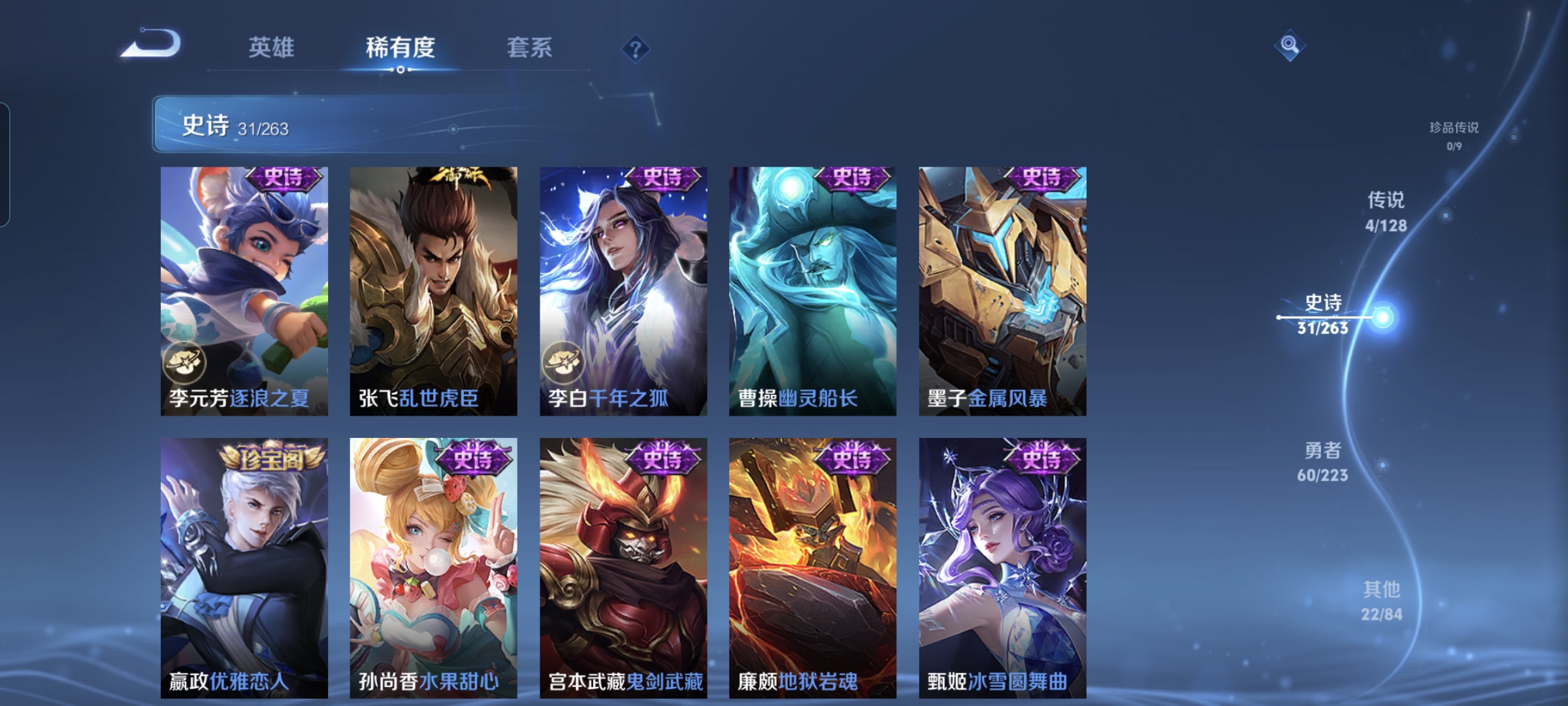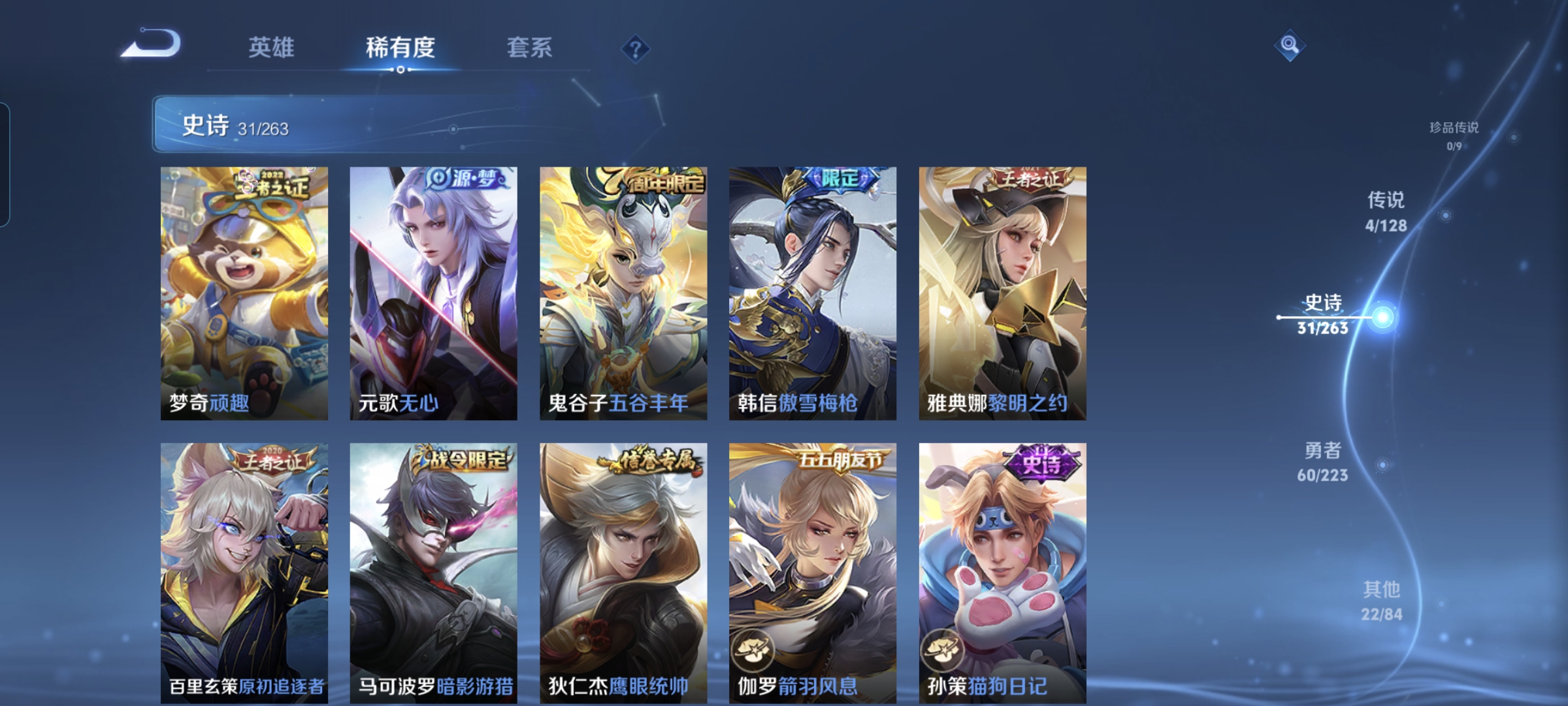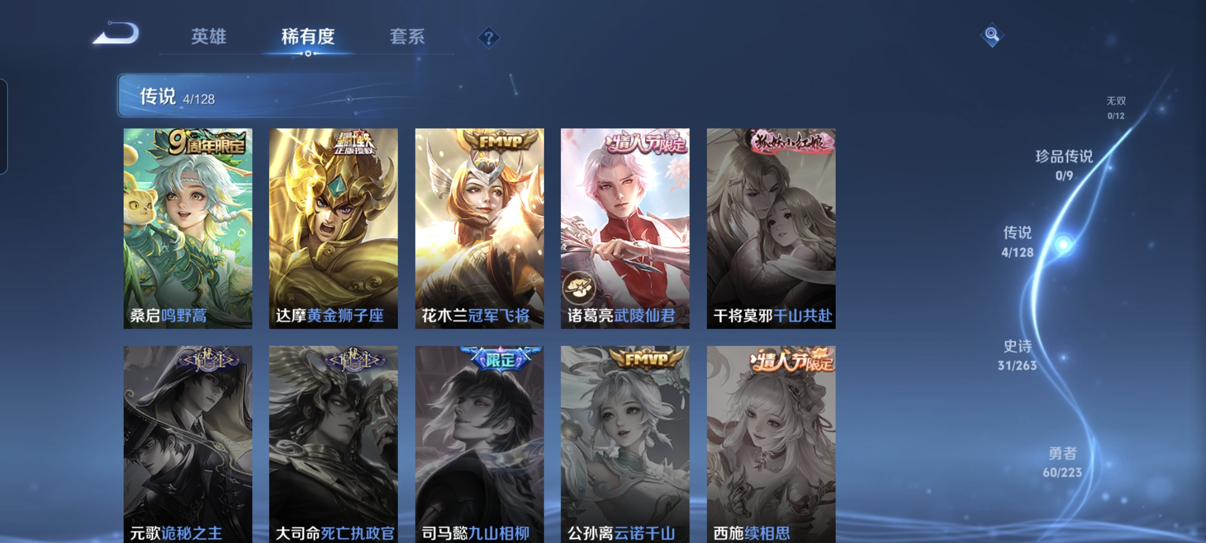 贵族等级:v2皮肤数:117传说品质4 情人节限定1 生肖限定1 英雄数:121