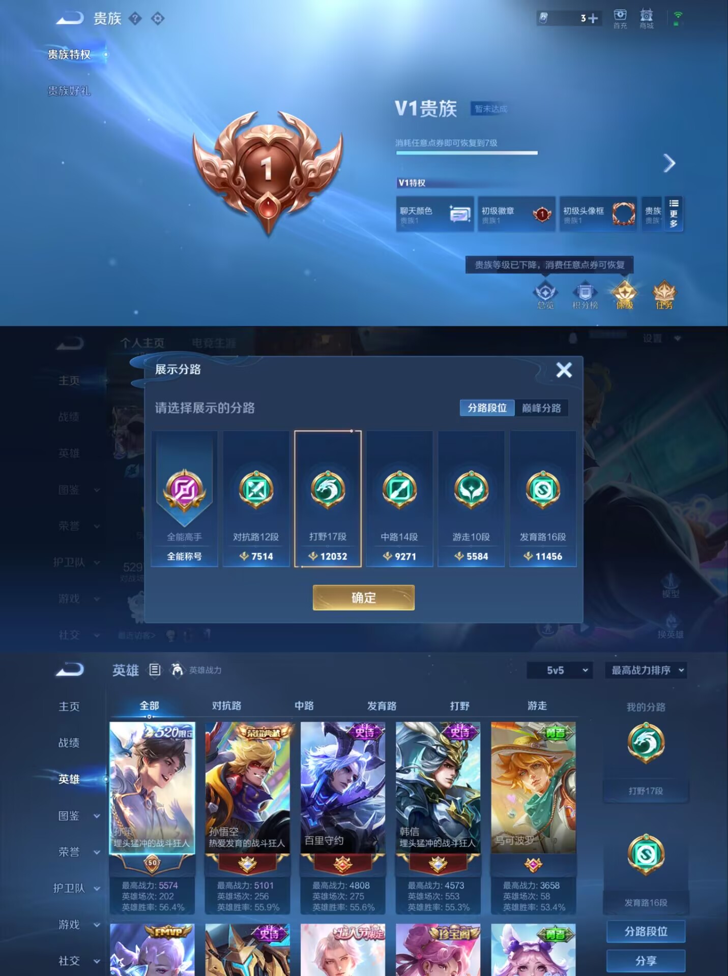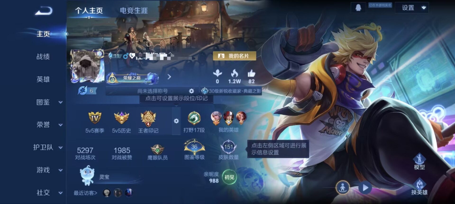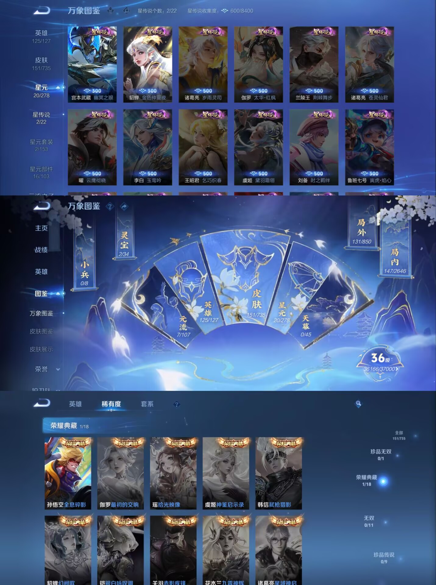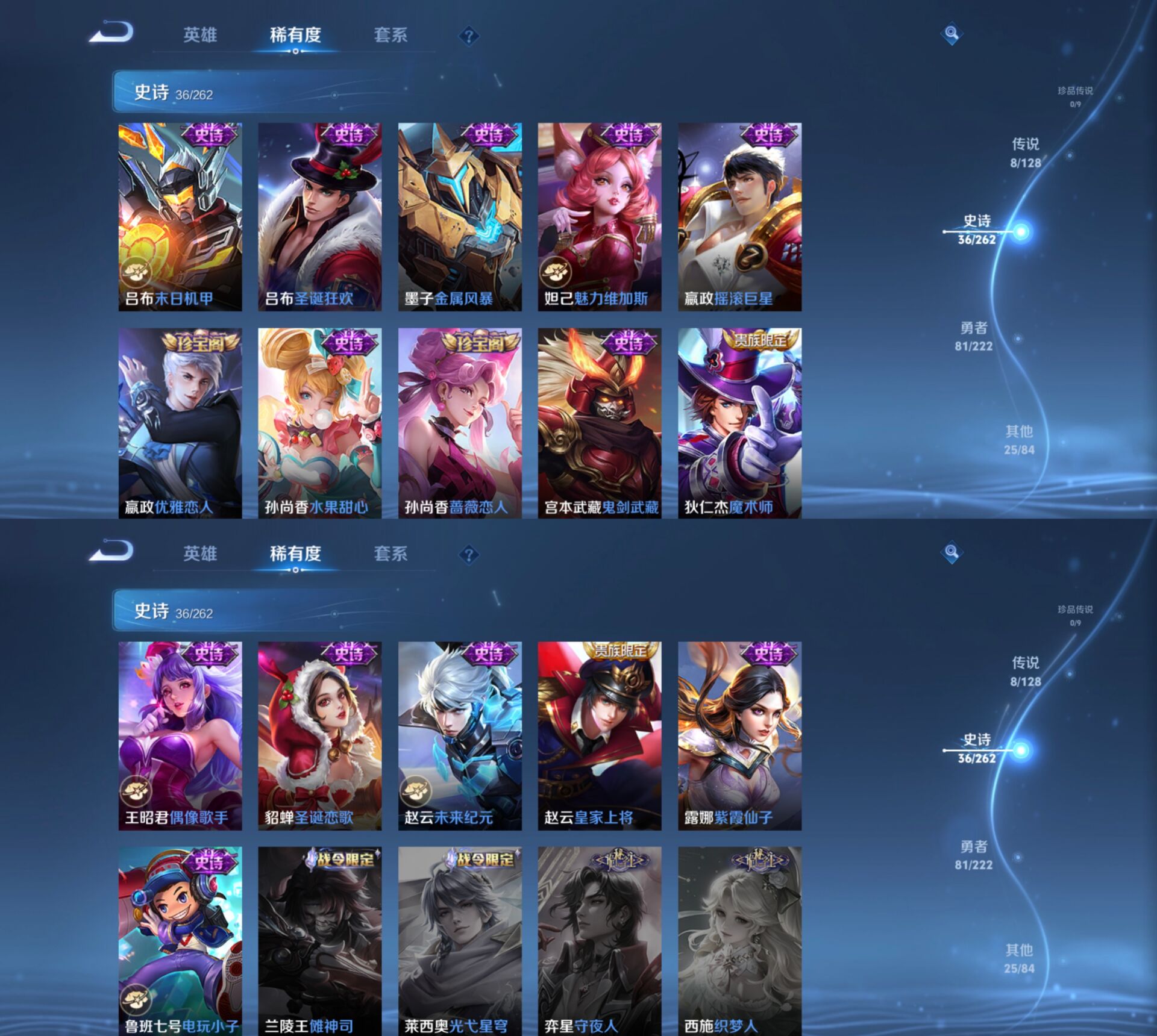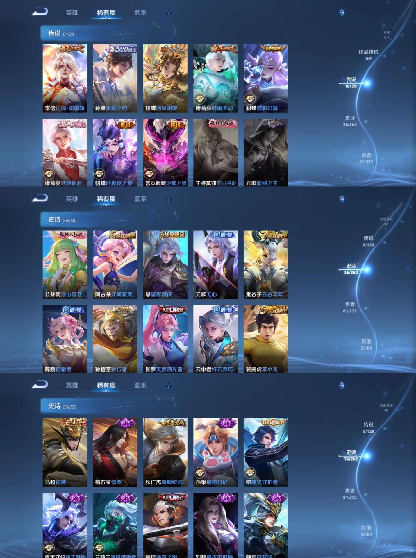 贵族等级:v7皮肤数:151传说品质8 情人节限定1 生肖限定2 荣耀典藏1 英雄数:125