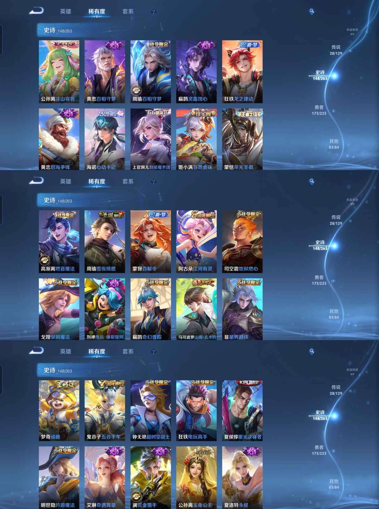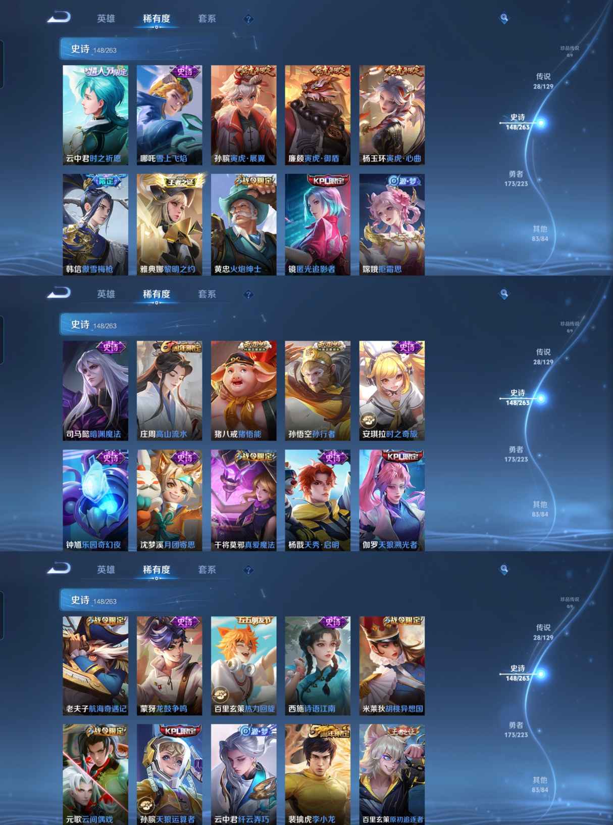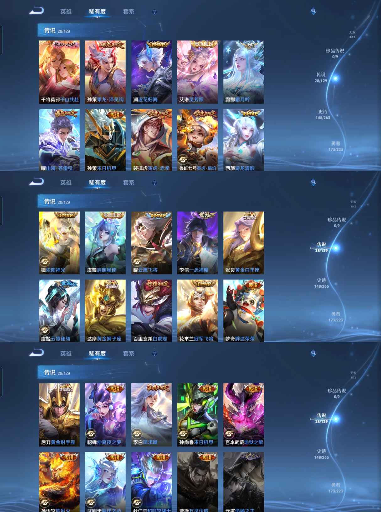 传说品质_后羿_黄金射手座传说品质_张良_黄金白羊座传说品质_艾琳_觅芳踪传说品质_澜_逐花归海传说品质_孙悟空_地狱火传说品质_李白_凤求凰传说品质_武则天_海洋之心传说品质_干将莫邪_千山共赴传说品质_宫本武藏_地狱之眼传说品质_西施_游龙清影传说品质_花木兰_冠军飞将传说品质_镜_炽阳神光传说品质_貂蝉_仲夏夜之梦传说品质_李信_一念神魔传说品质_孙尚香_末日机甲传说品质_曜_云鹰飞将传说品质_曜_山海·苍雷引传说品质_梦奇_胖达荣荣传说品质_孙策_末日机甲传说品质_孙策_乘龙·淬吴钩传说品质_达摩_黄金狮子座传说品质_狄仁杰_超时空战士传说品质_露娜_霜月吟传说品质_鲁班七号_寅虎·瑞焰传说品质_虞姬_云霓雀翎传说品质_虞姬_启明星使传说品质_百里玄策_白虎志传说品质_裴擒虎_寅虎·赤拳