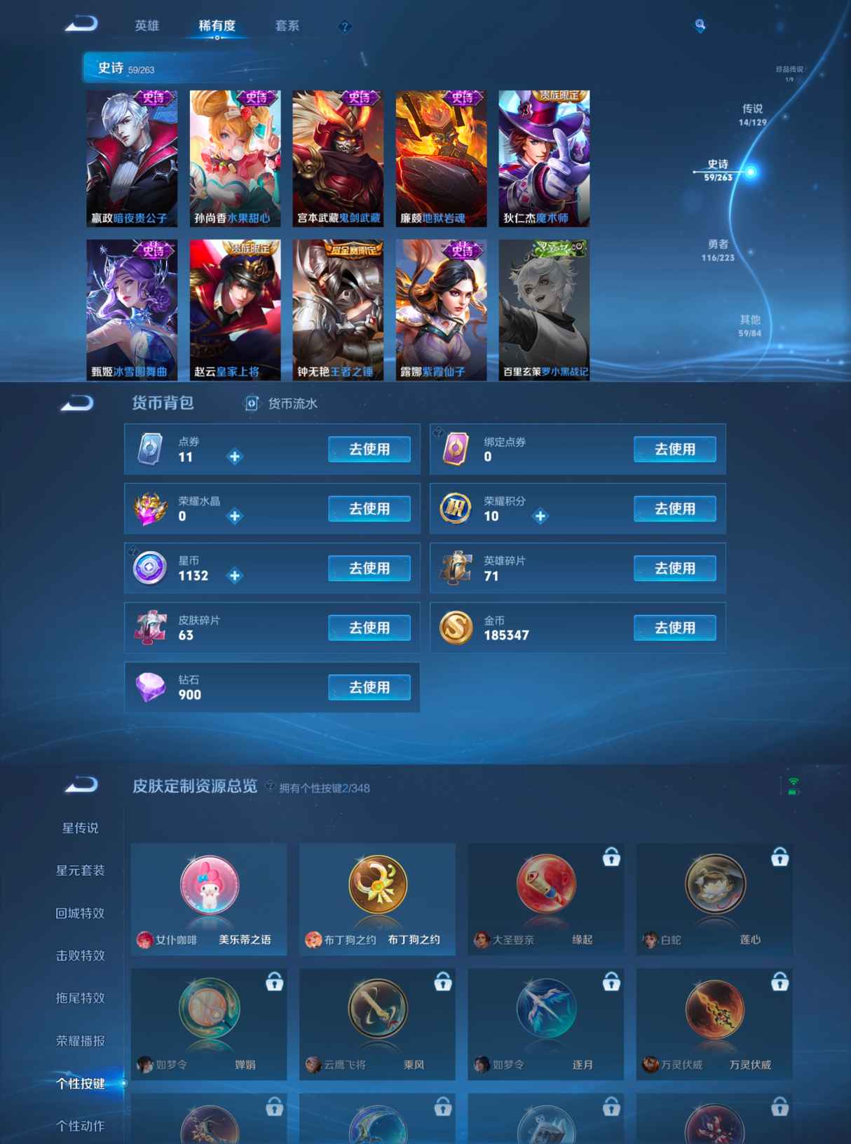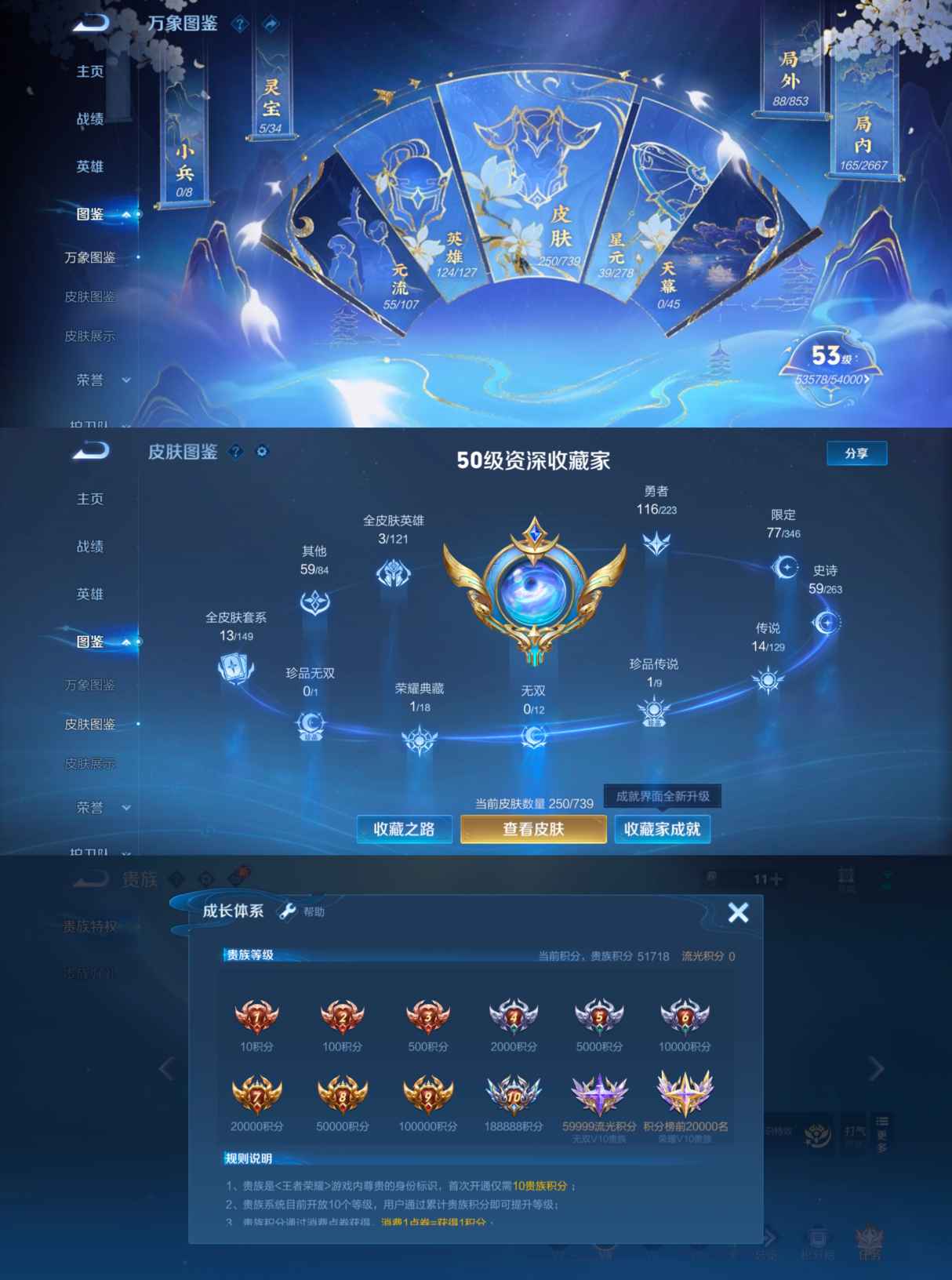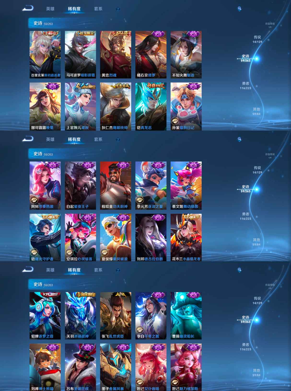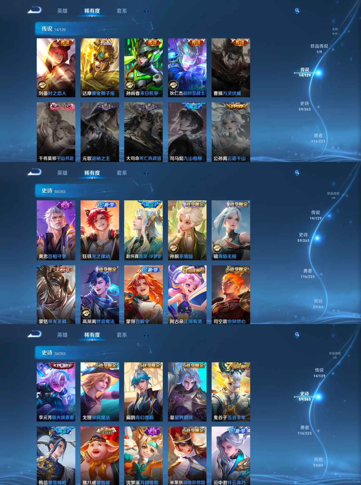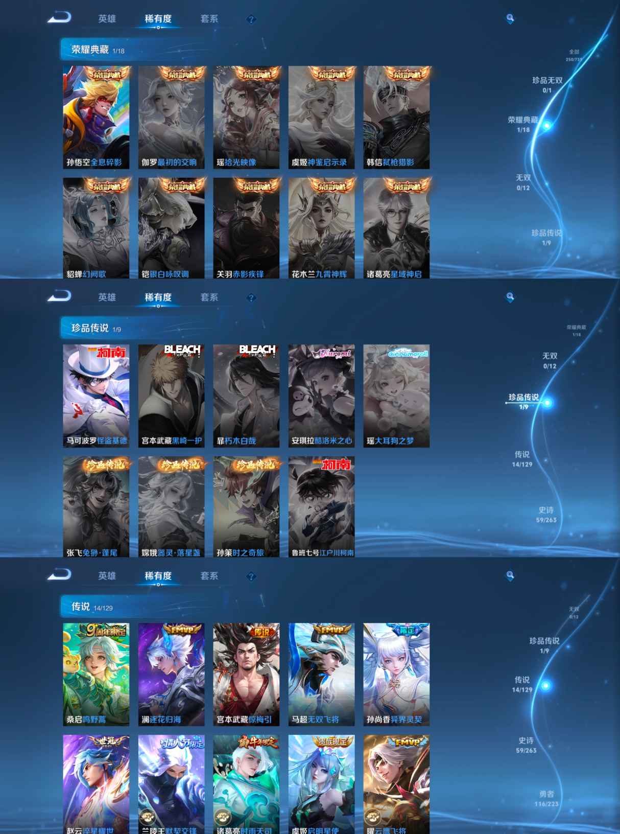 贵族等级:v8皮肤数:250传说品质14 生肖限定2 情人节限定1 珍品传说1 荣耀典藏1 英雄数:124