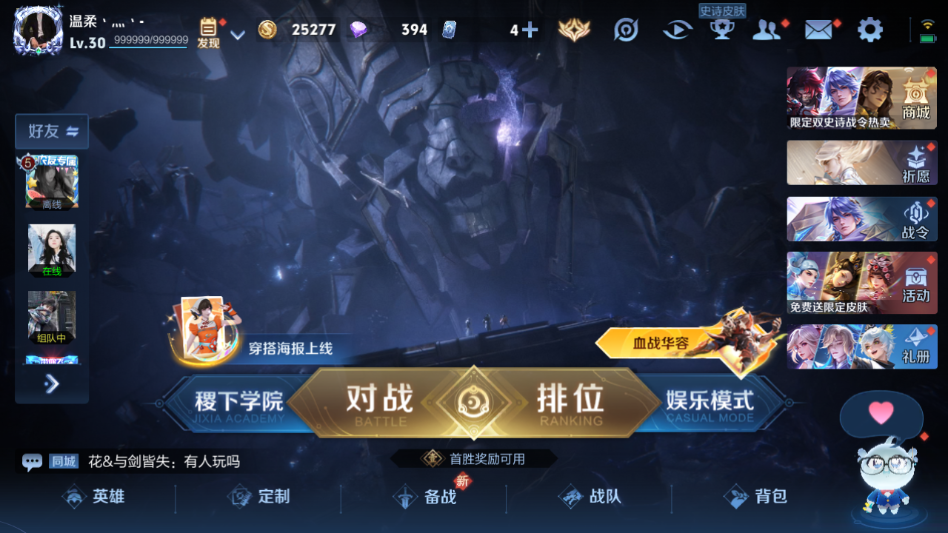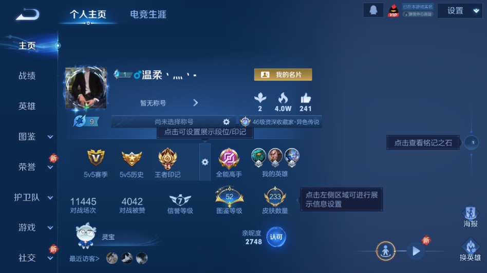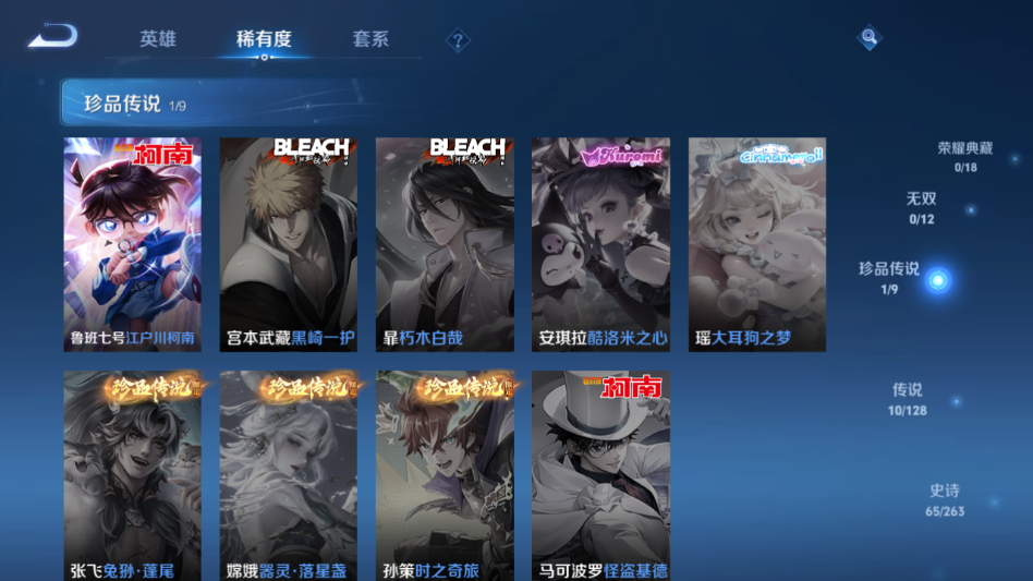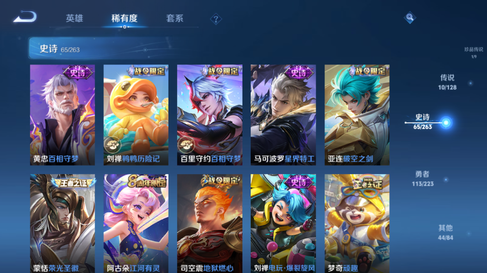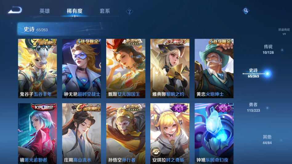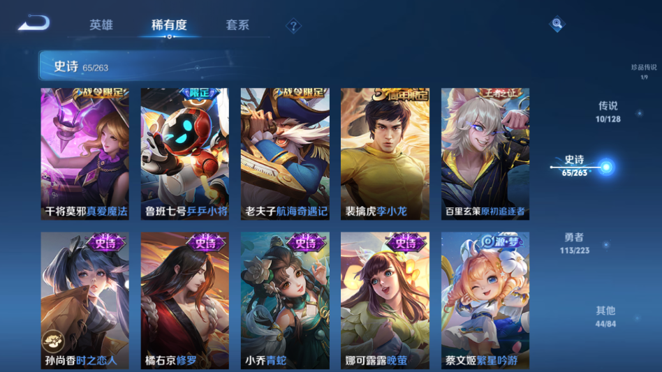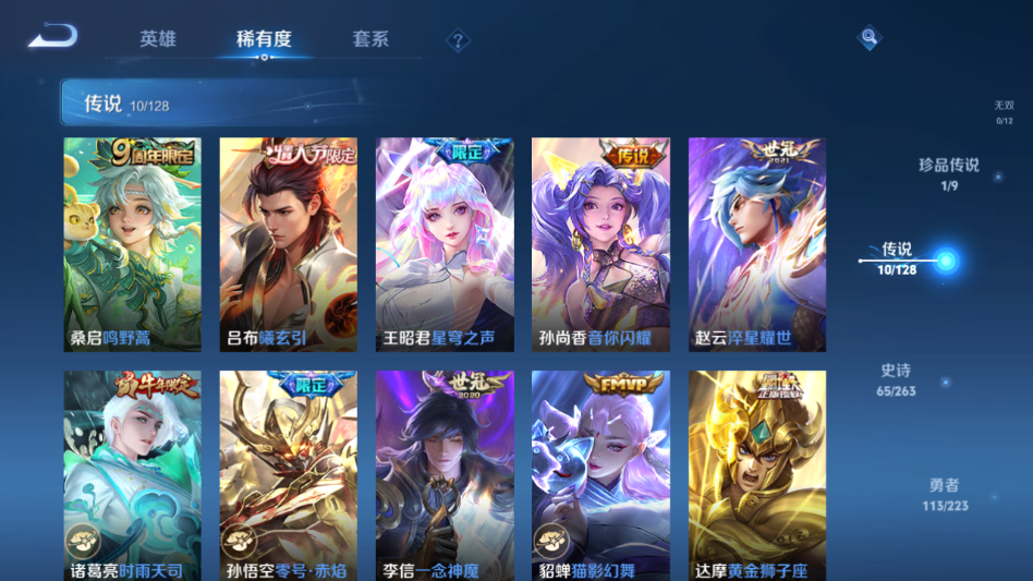 贵族等级:v7皮肤数:233传说品质10 生肖限定1 情人节限定1 珍品传说1 英雄数:122
