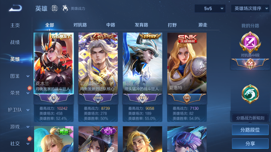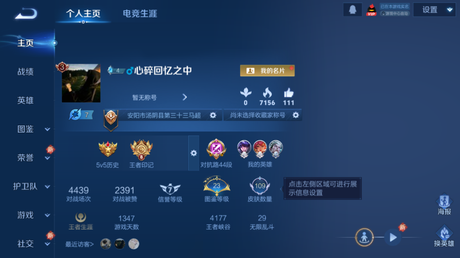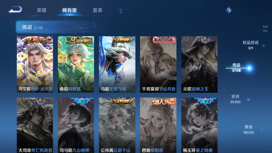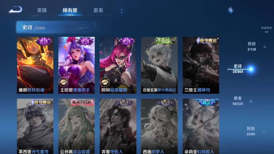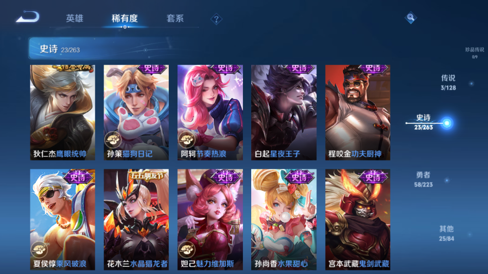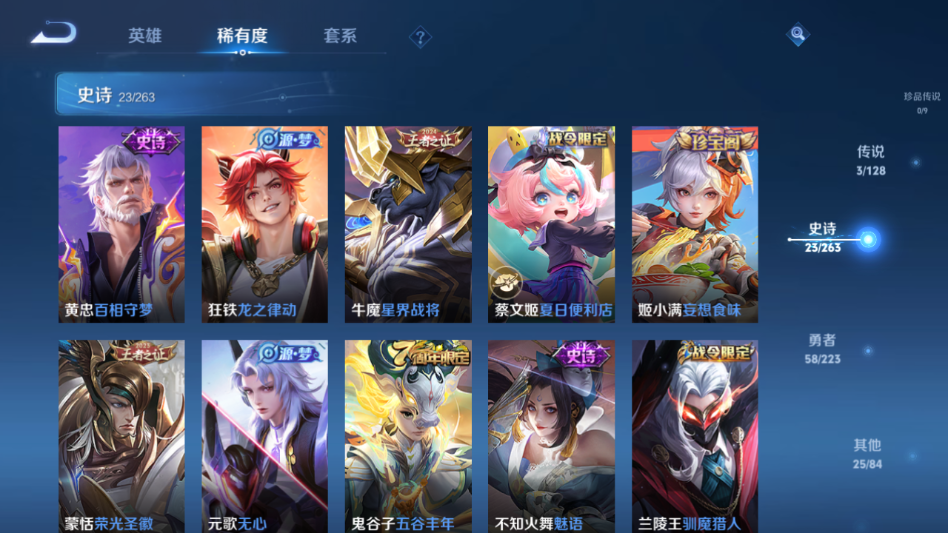 贵族等级:v4皮肤数:109传说品质3 生肖限定1 英雄数:121