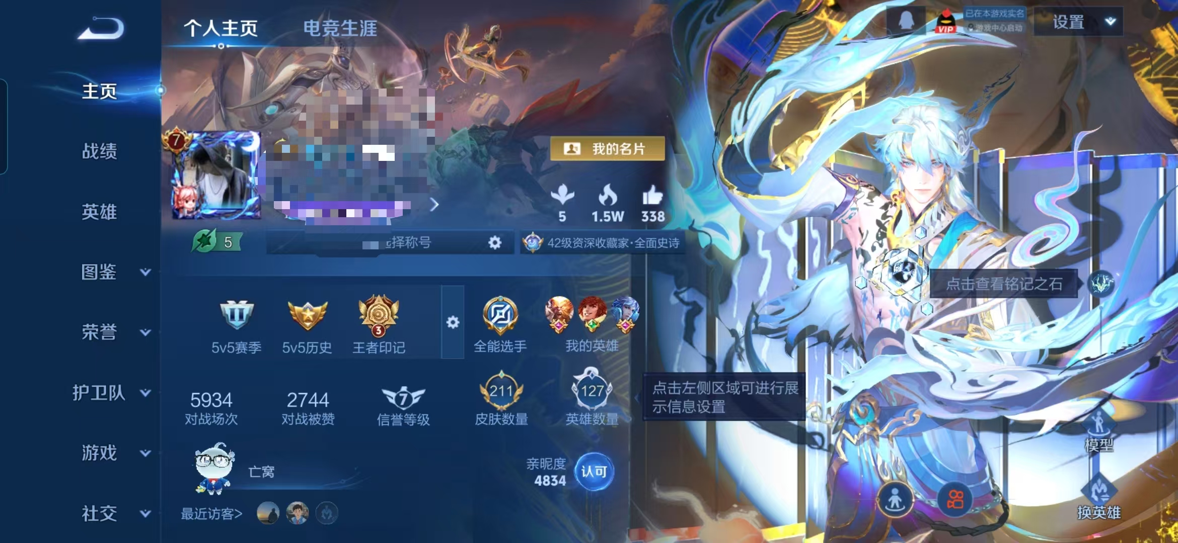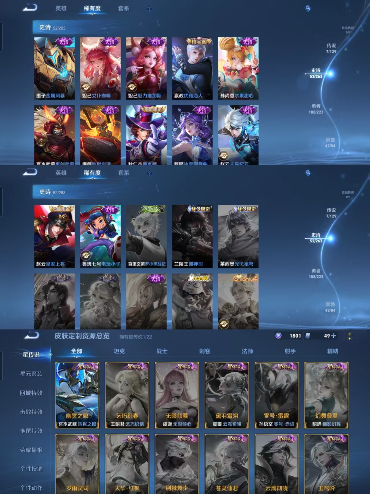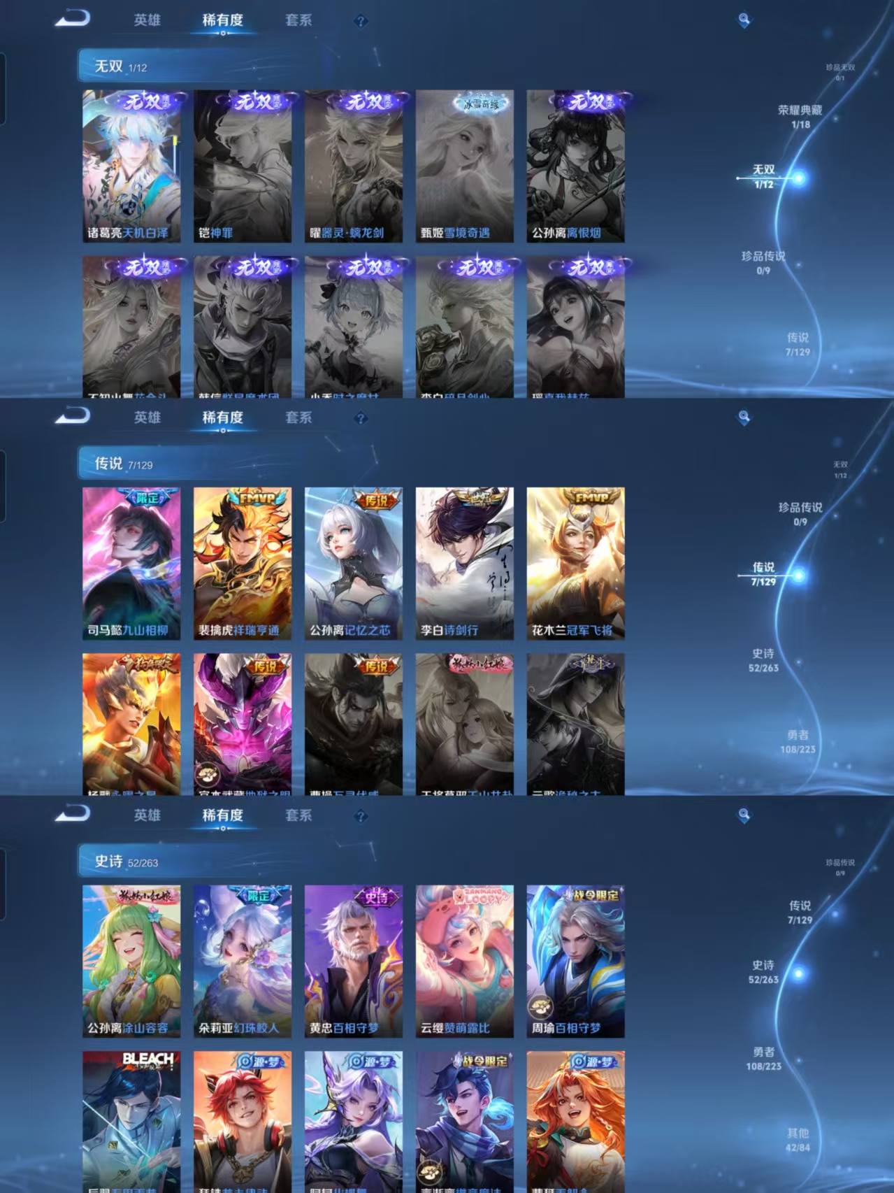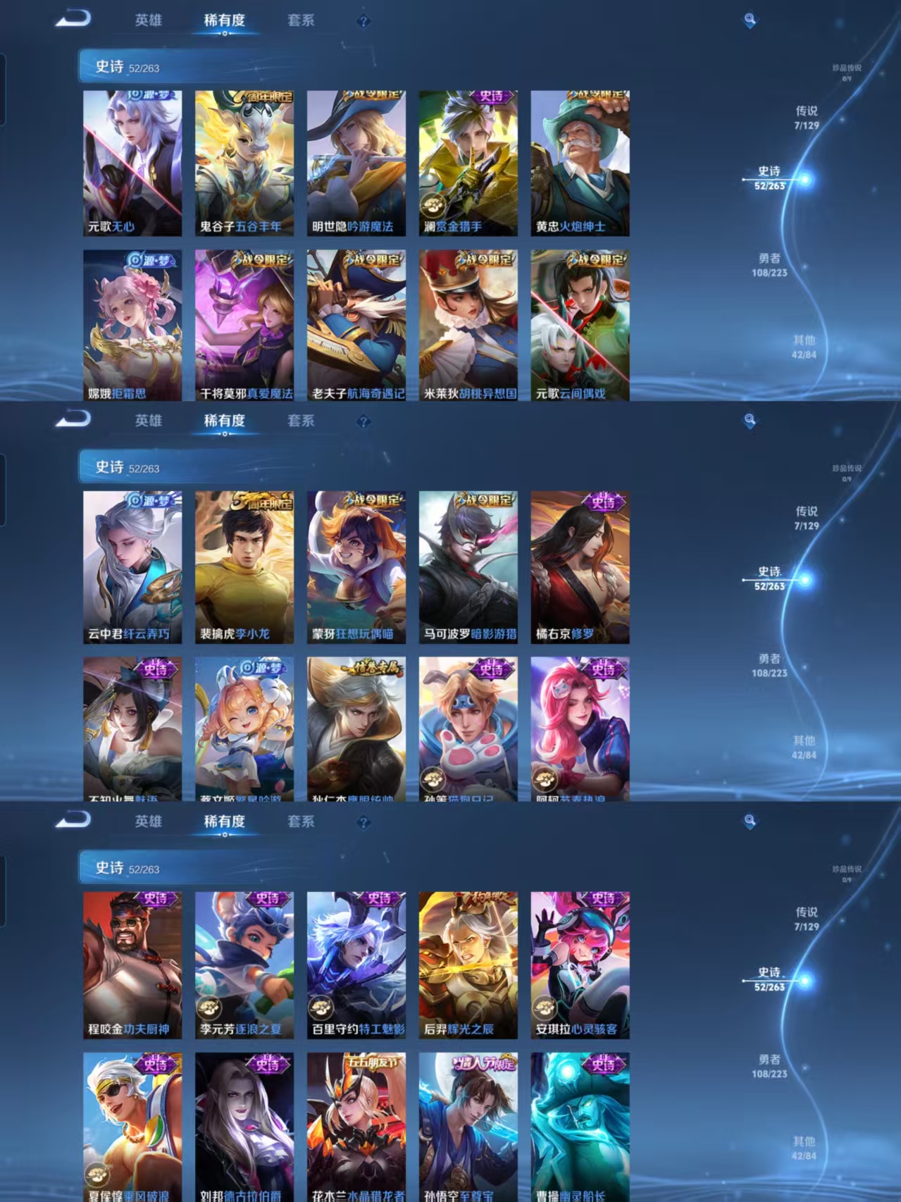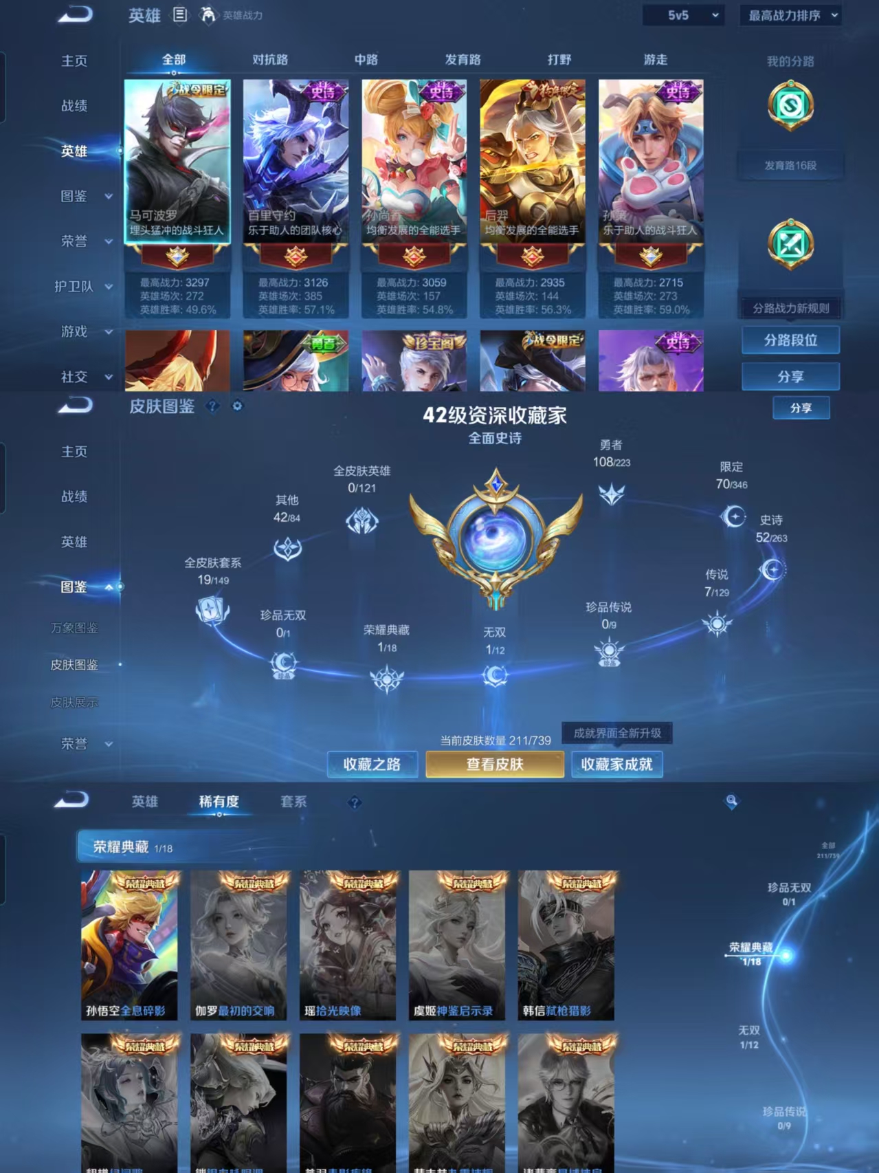 贵族等级:v7皮肤数:211生肖限定2 无双1 情人节限定1 荣耀典藏1 传说品质7 英雄数:127