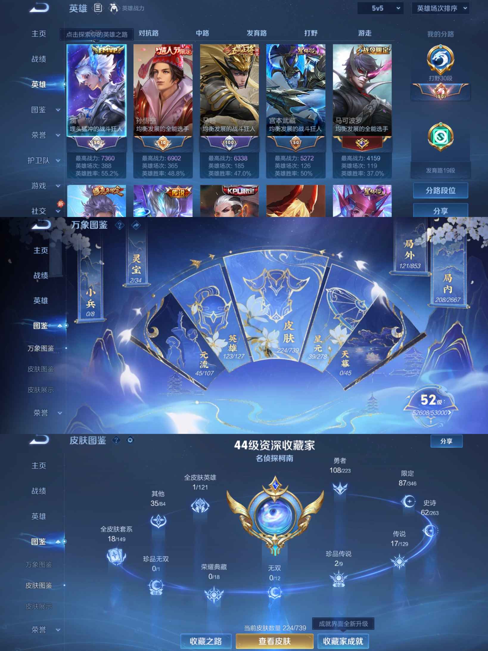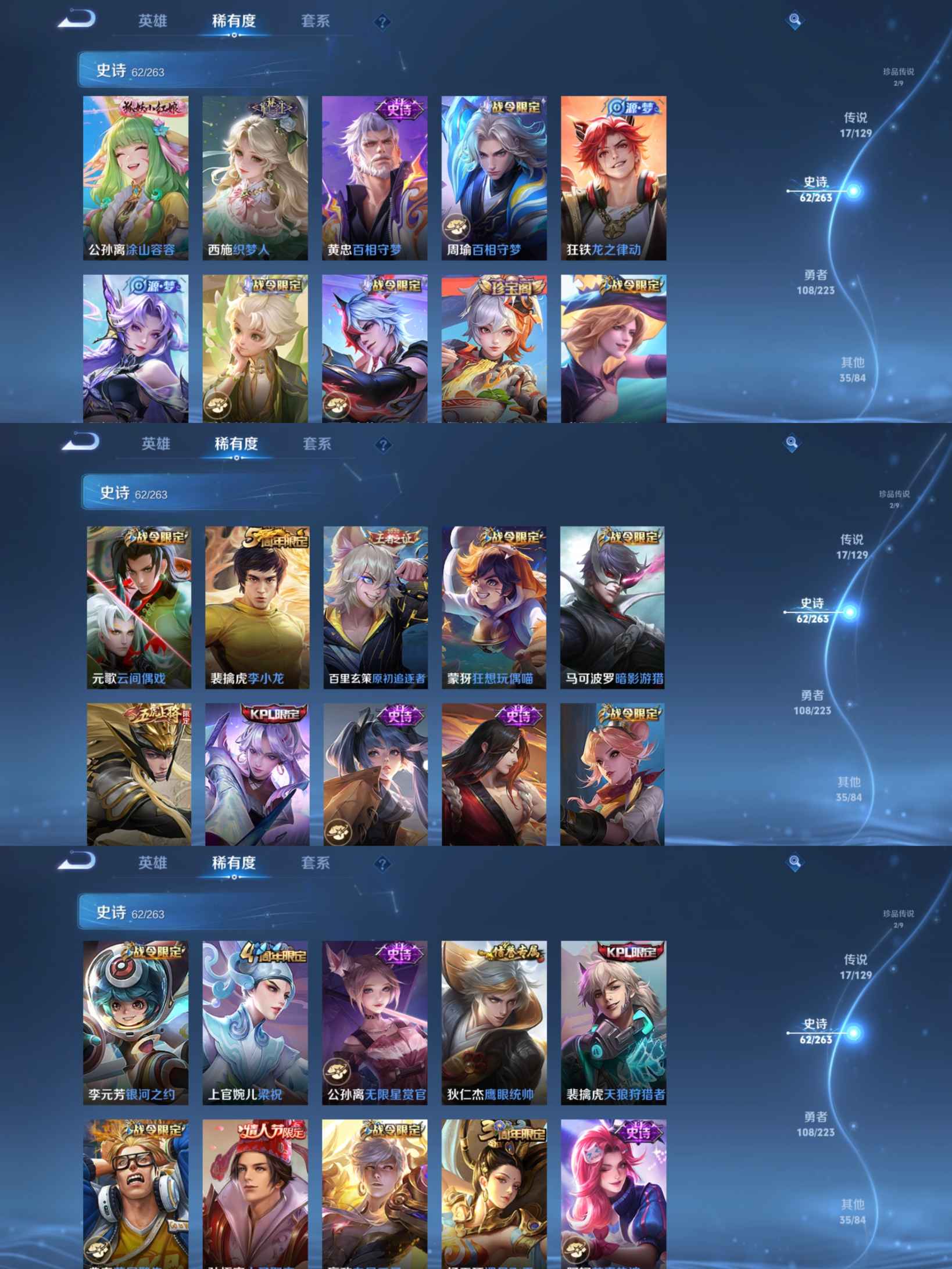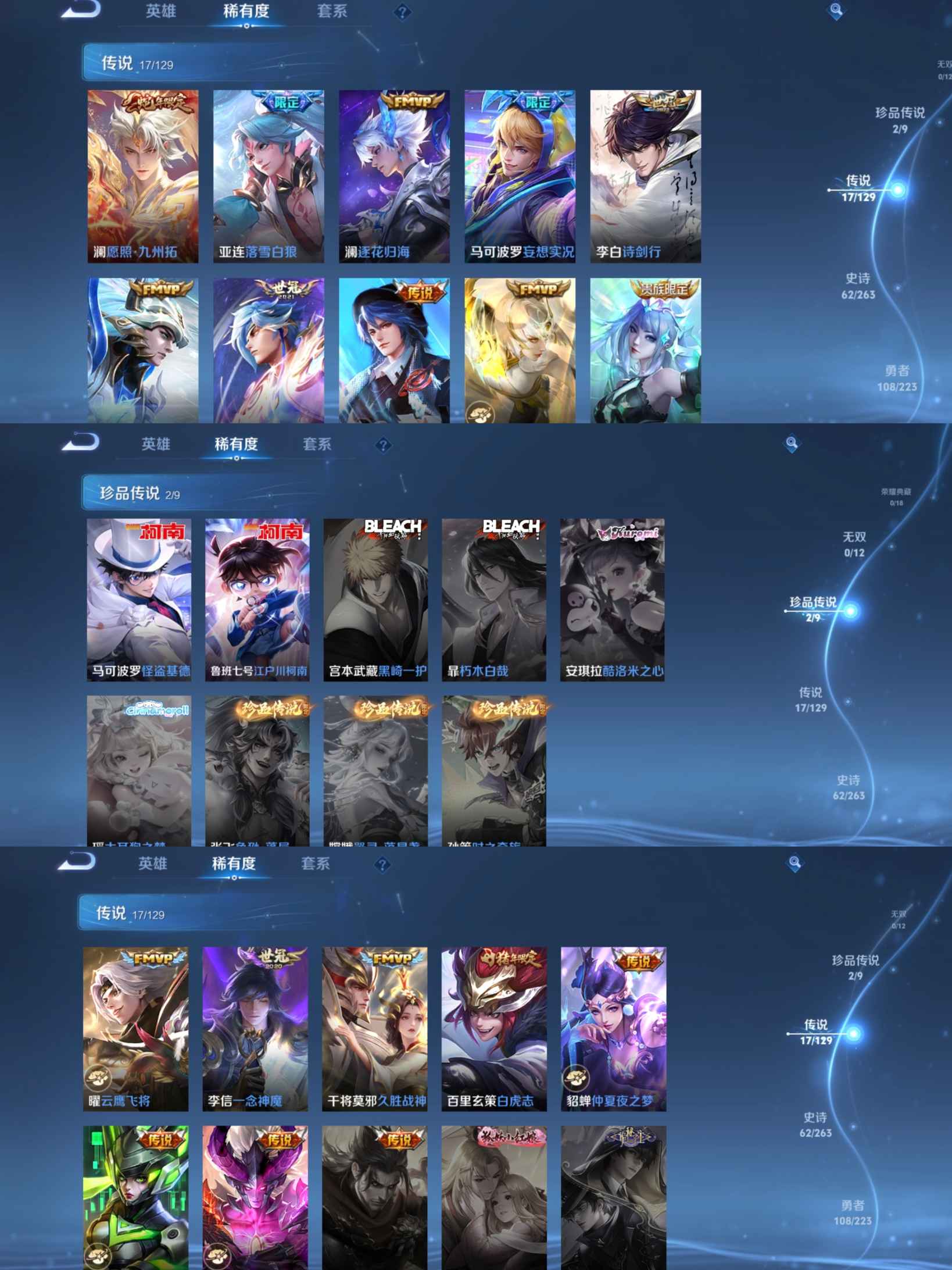 贵族等级:v8皮肤数:224生肖限定3 传说品质17 珍品传说2 情人节限定2 英雄数:123