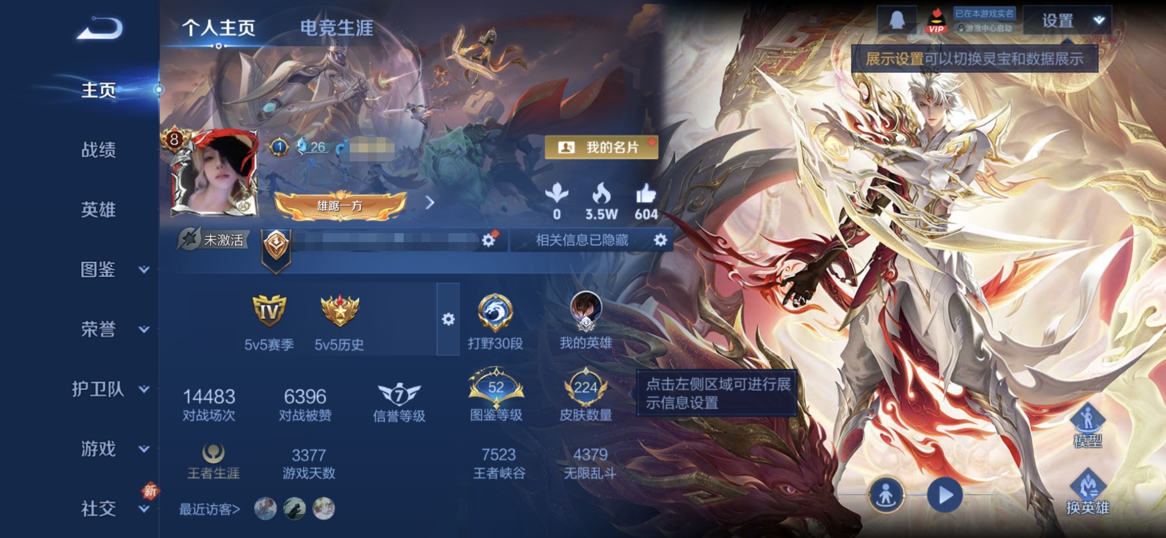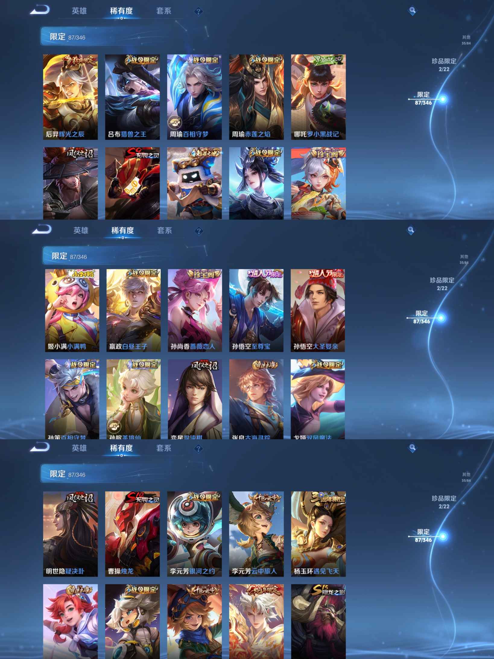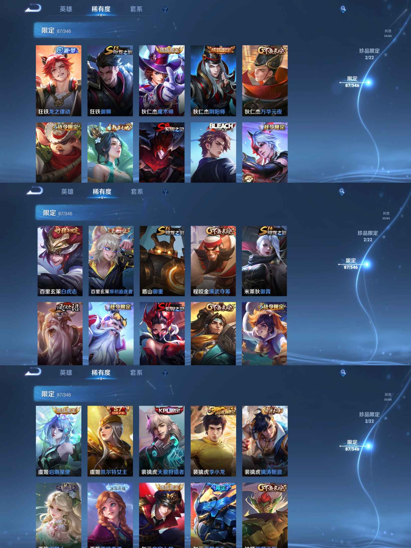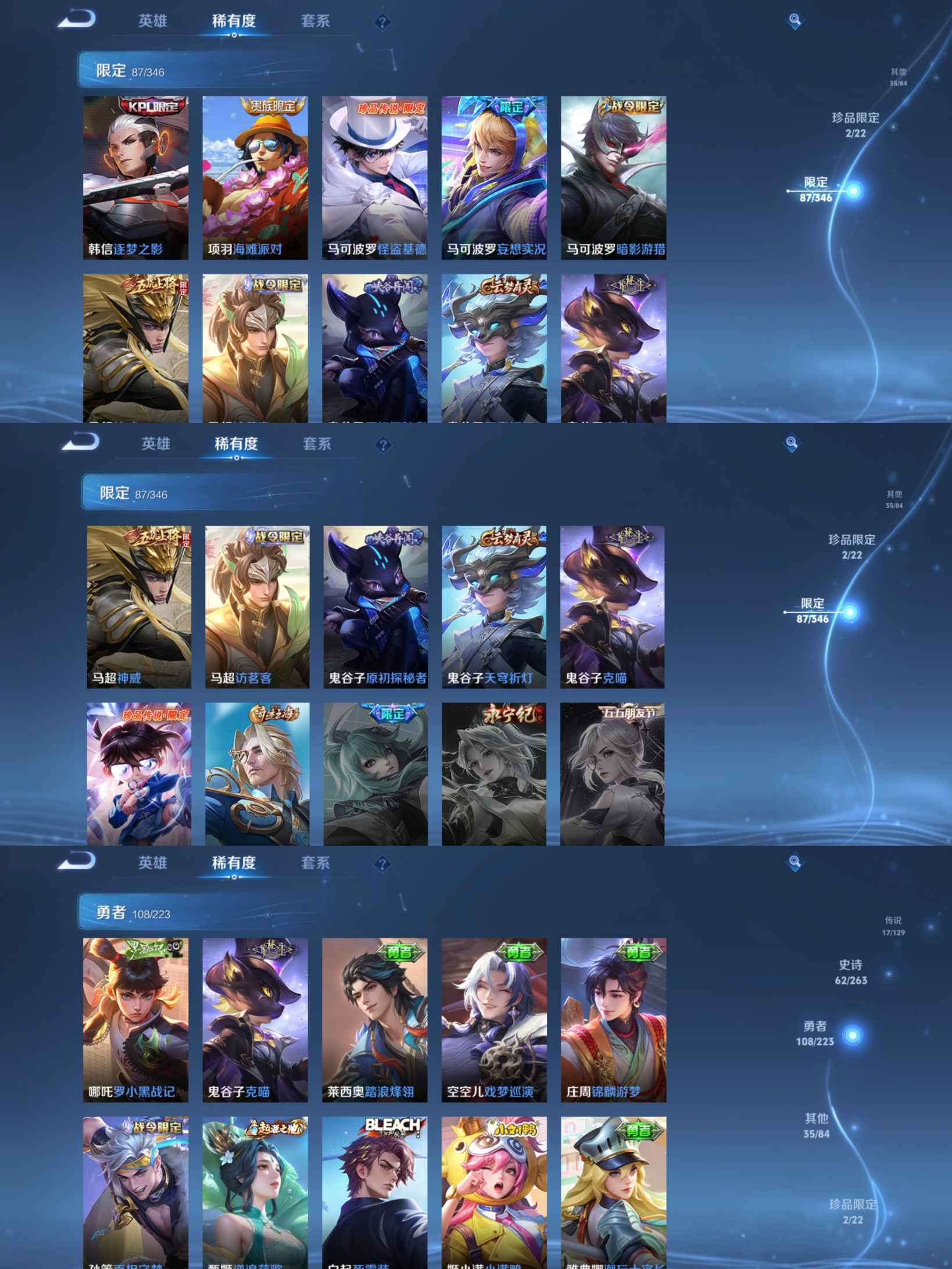 贵族等级:v8皮肤数:224生肖限定3 传说品质17 珍品传说2 情人节限定2 英雄数:123