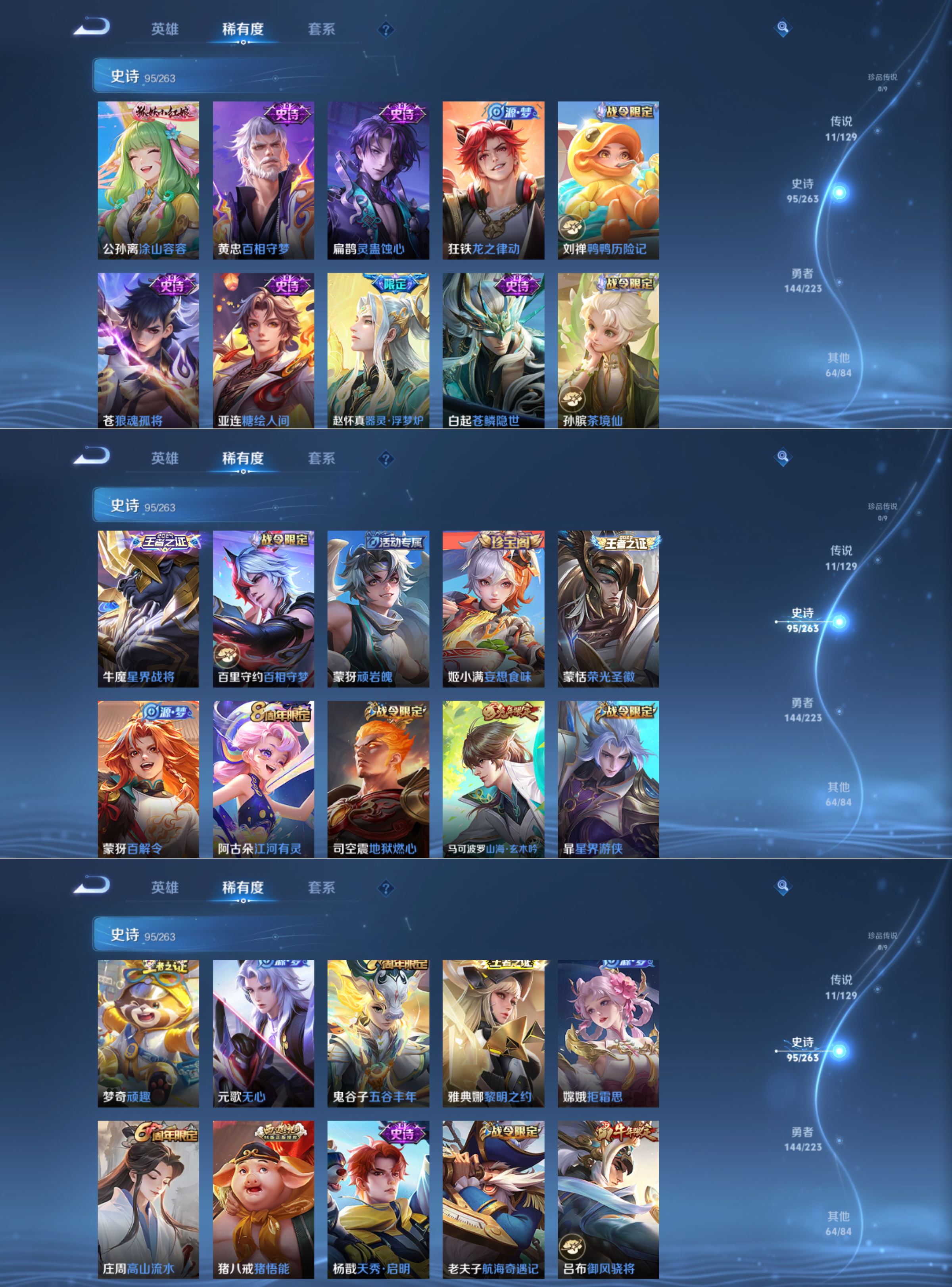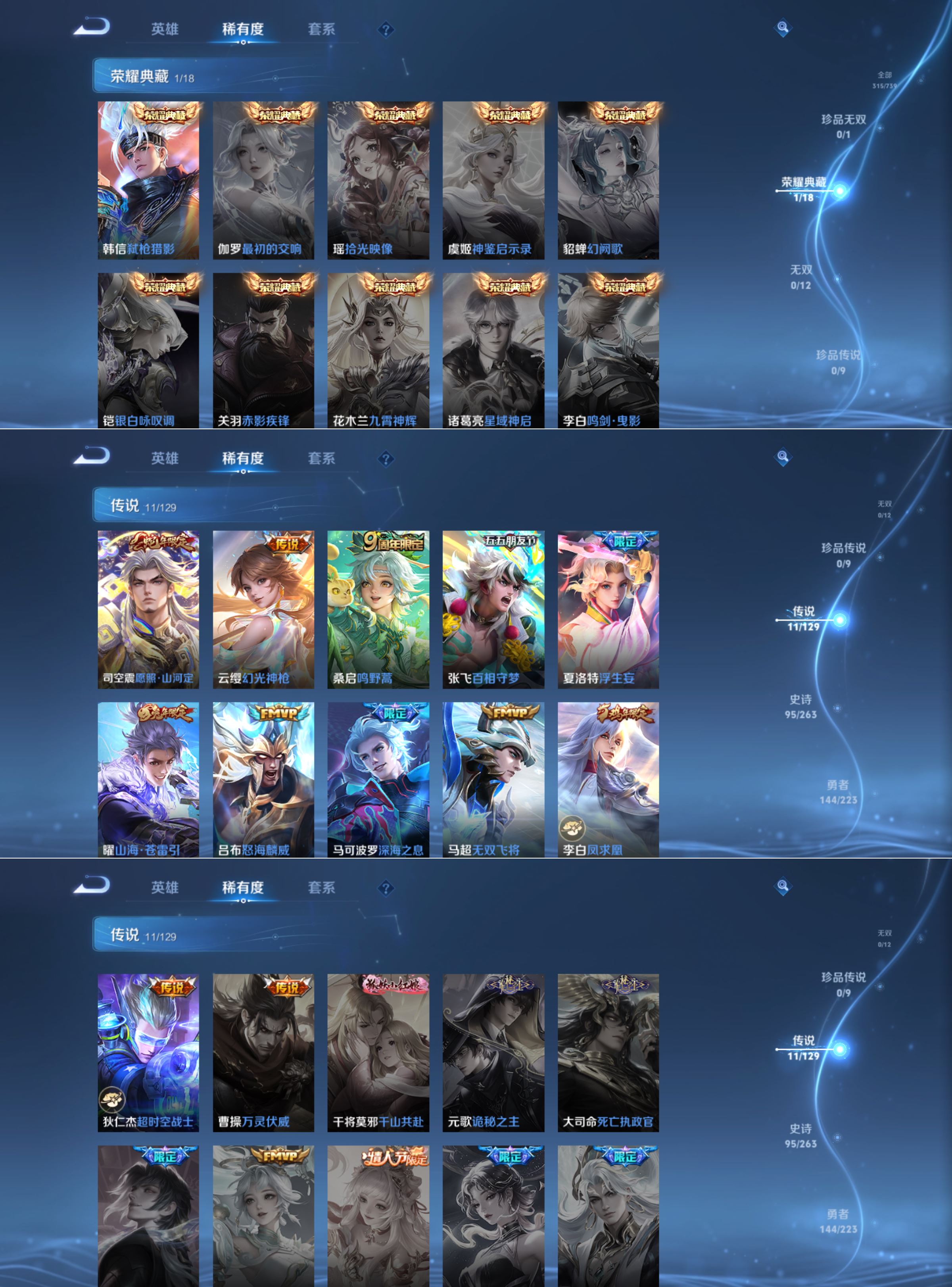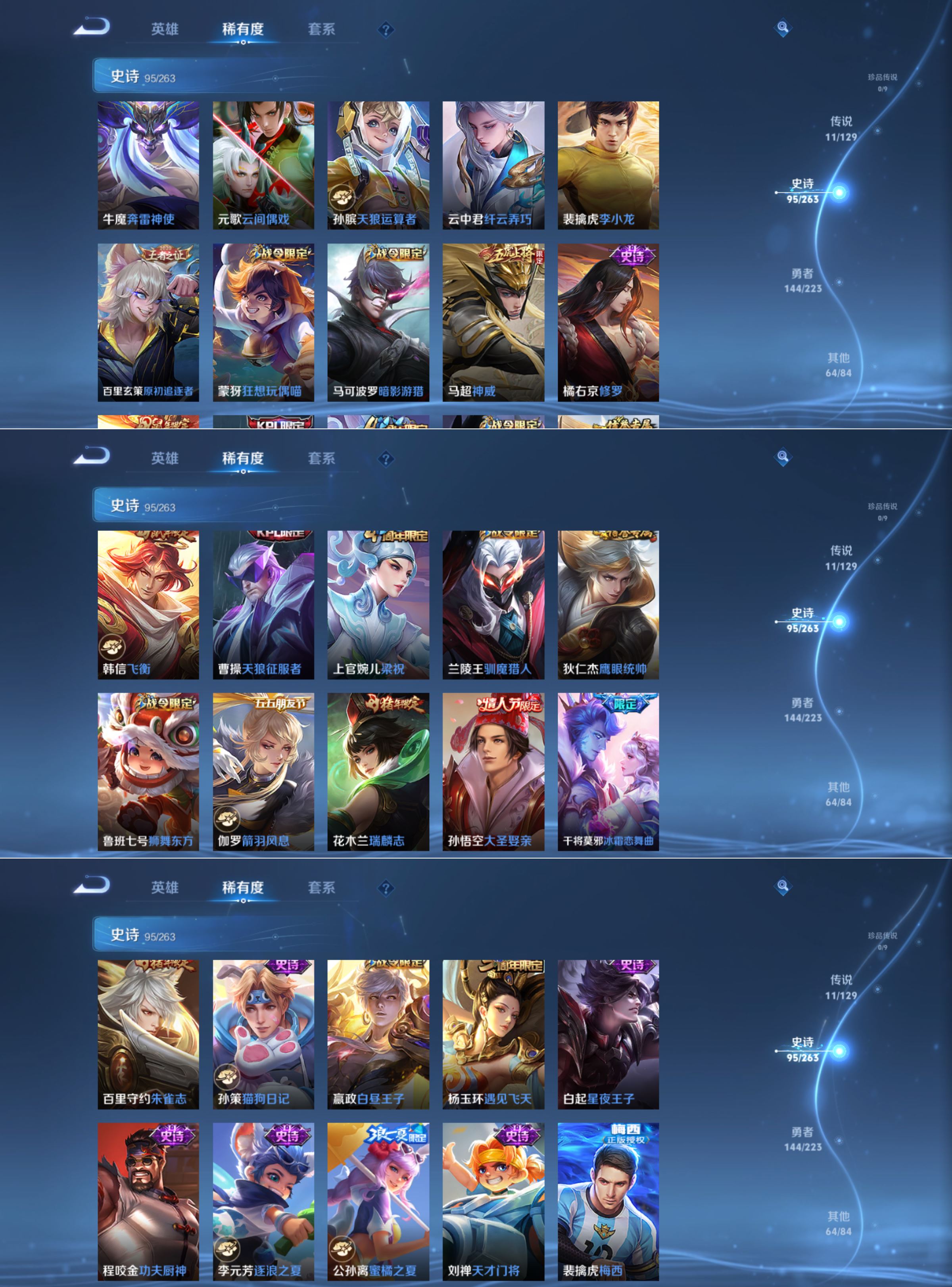 贵族等级:v7皮肤数:315传说品质11 生肖限定9 情人节限定1 荣耀典藏1 英雄数:125