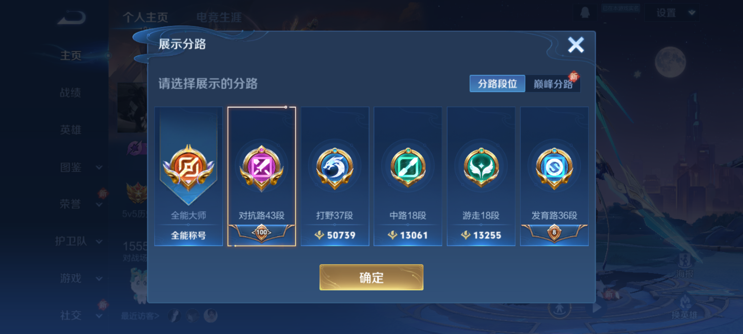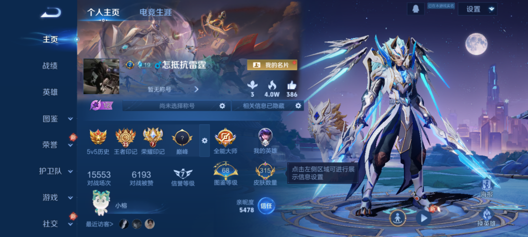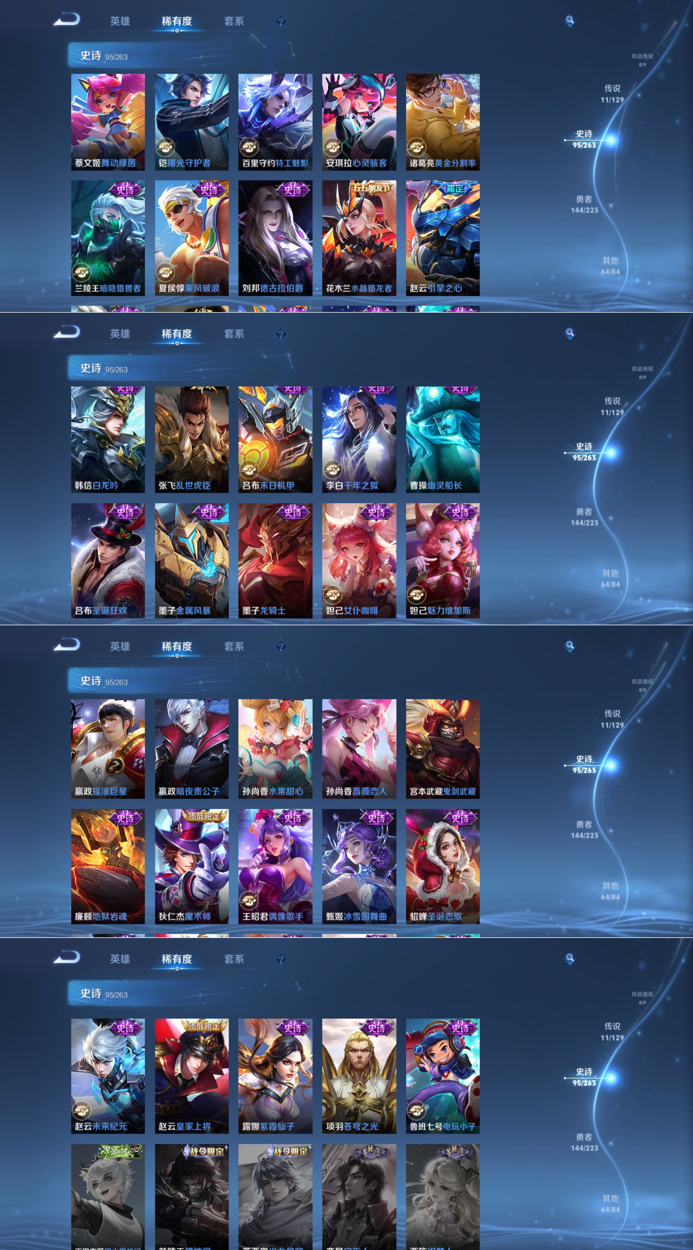 贵族等级:v7皮肤数:315传说品质11 生肖限定9 情人节限定1 荣耀典藏1 英雄数:125