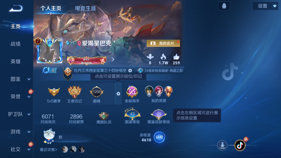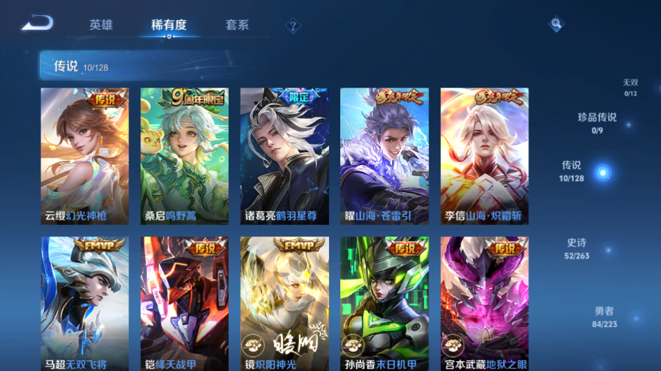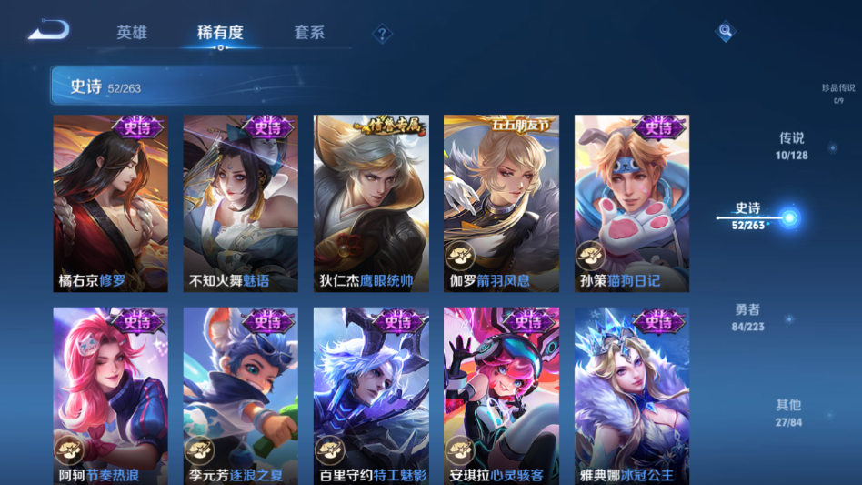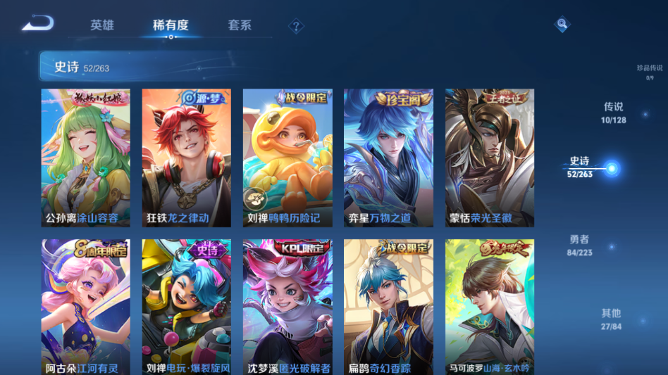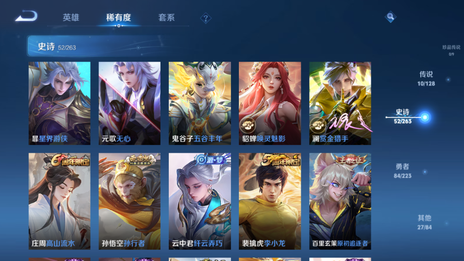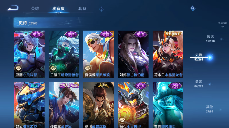 贵族等级:v7皮肤数:174传说品质10 生肖限定3 情人节限定1 荣耀典藏1 英雄数:125