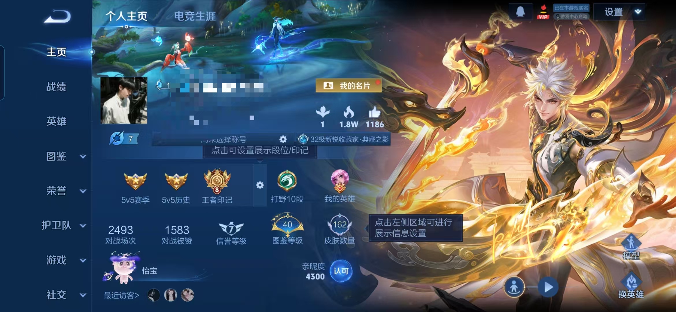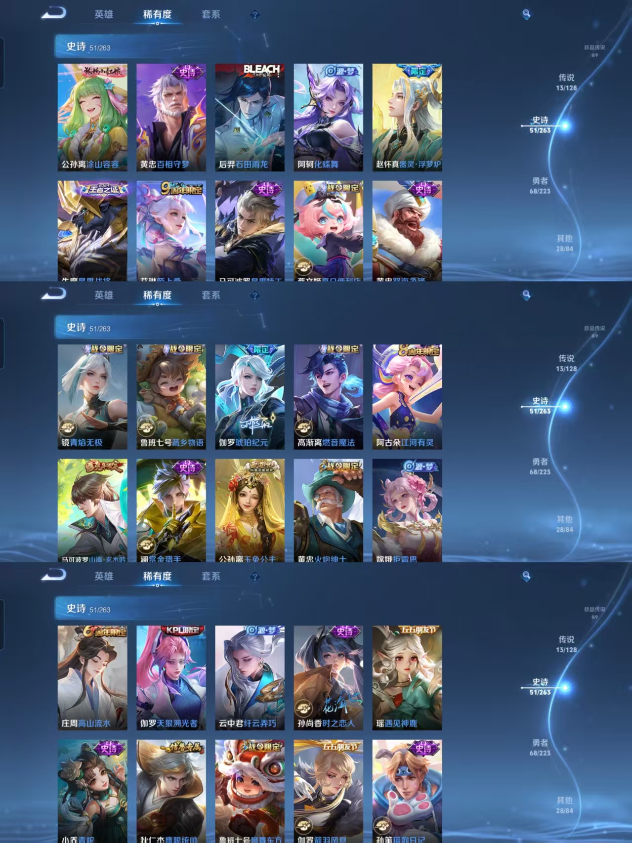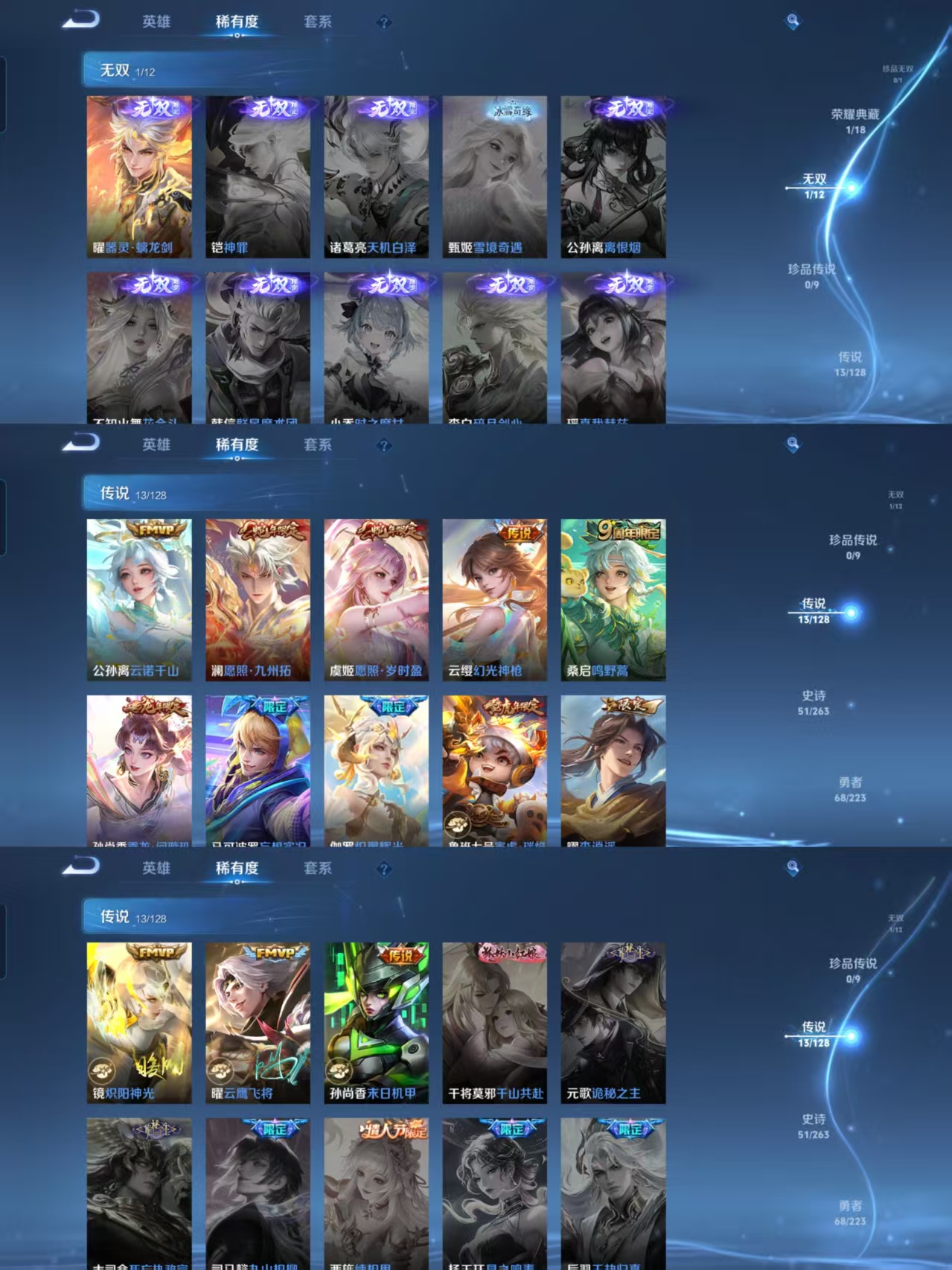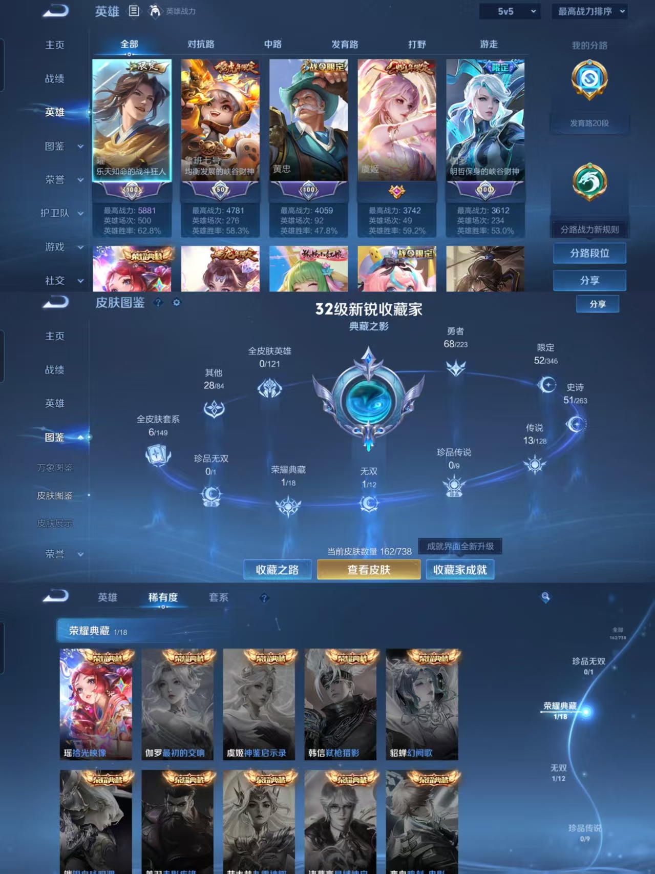 贵族等级:v7皮肤数:162传说品质13 生肖限定5 荣耀典藏1 无双1 英雄数:123