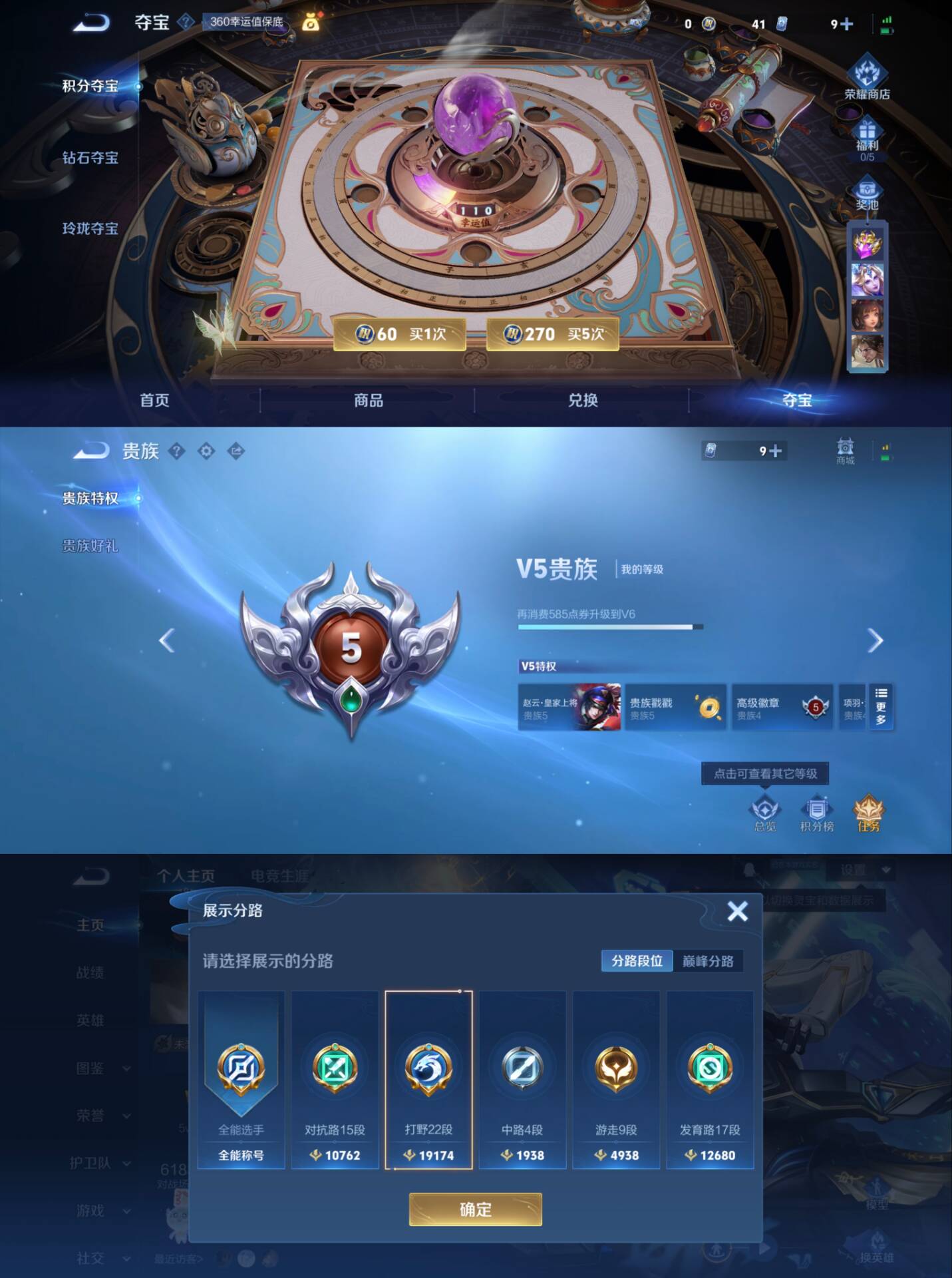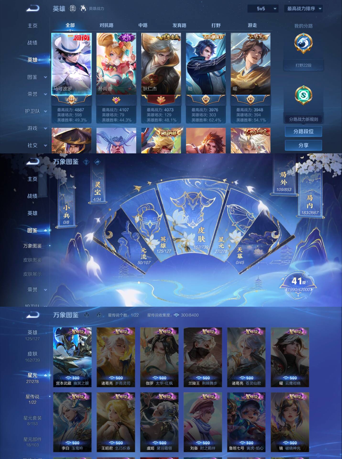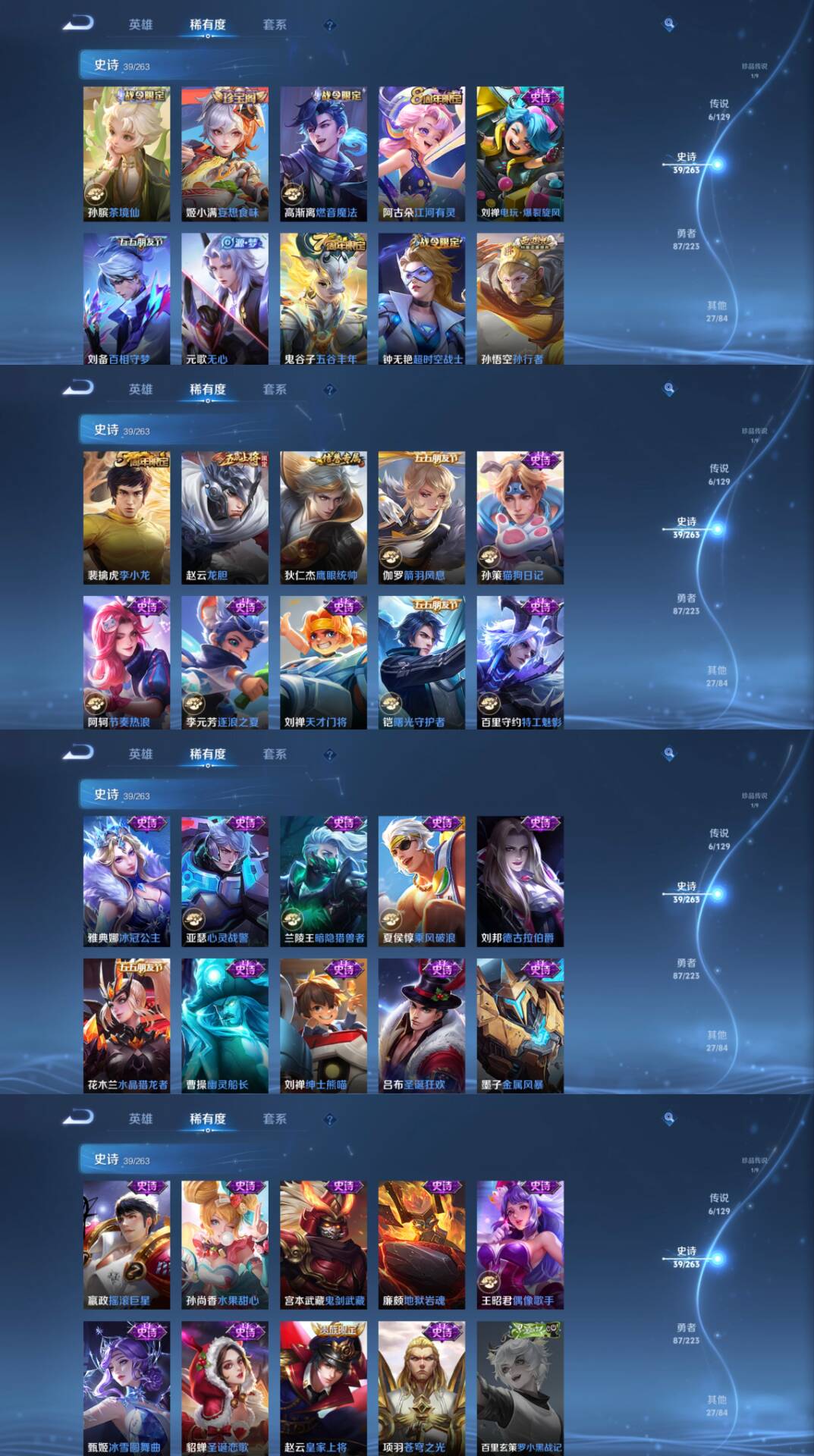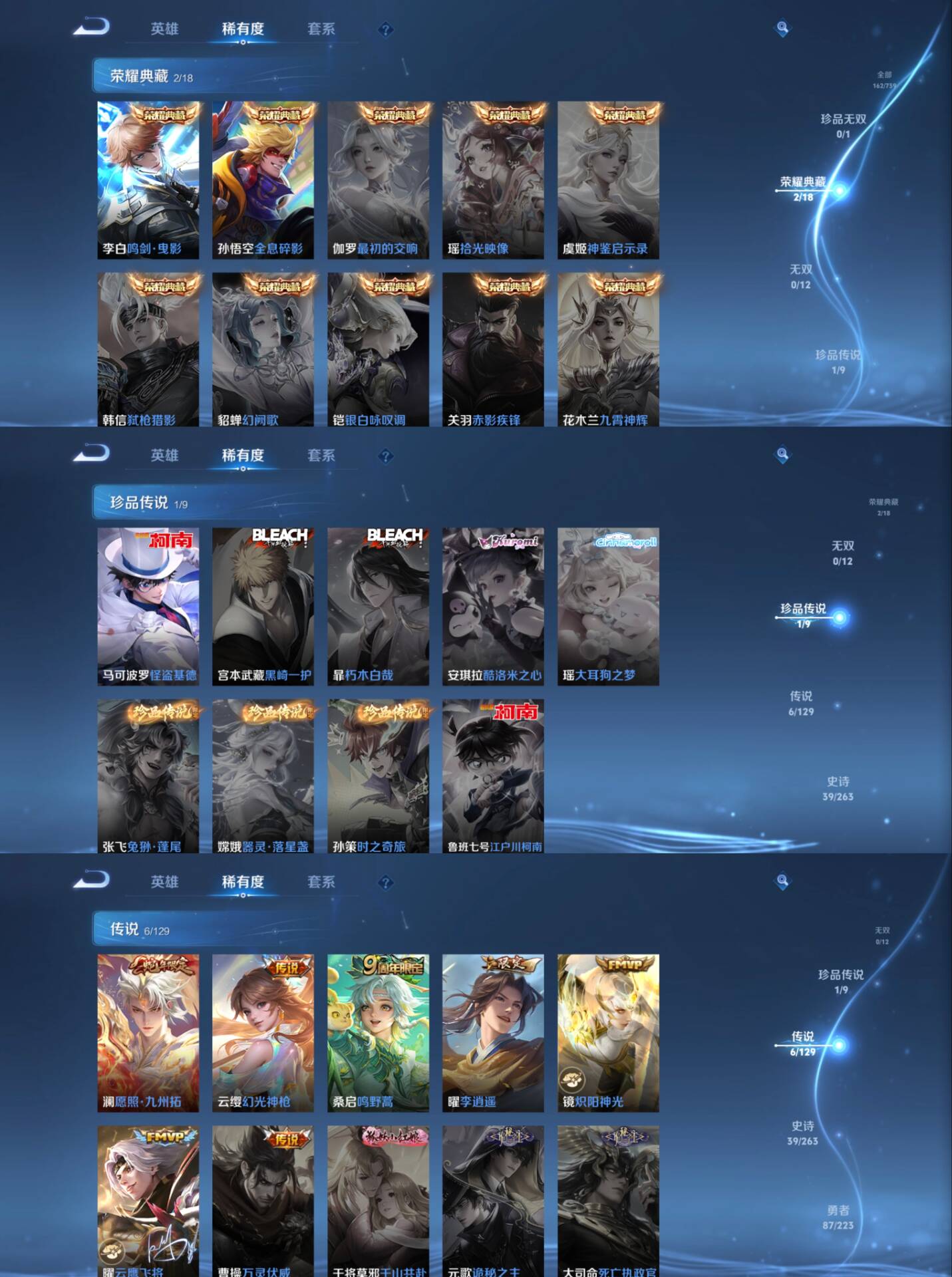 贵族等级:v5皮肤数:162传说品质6 生肖限定1 珍品传说1 荣耀典藏2 英雄数:125