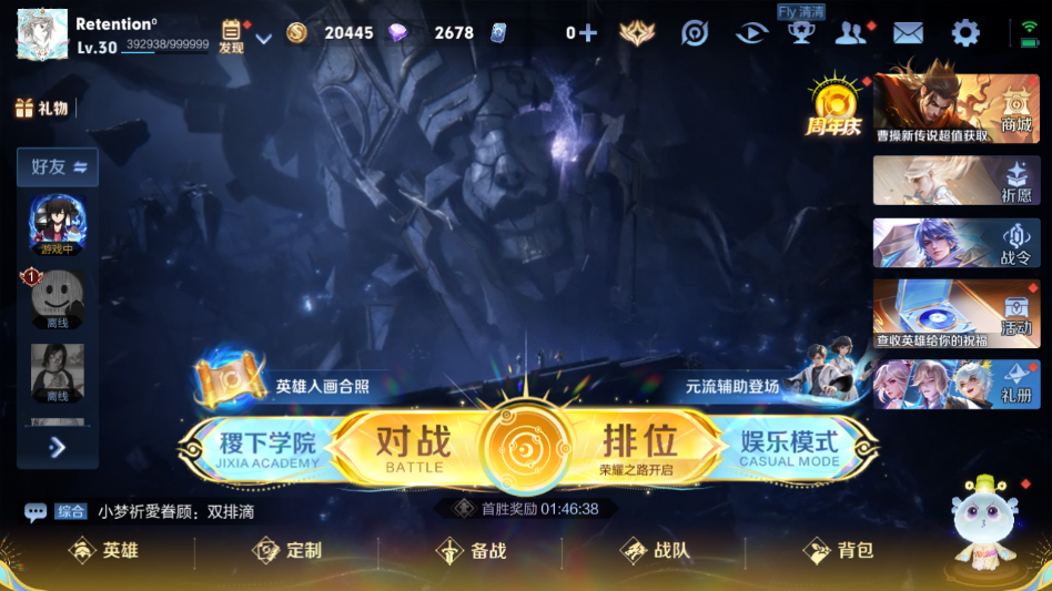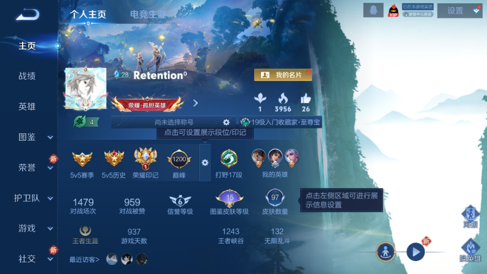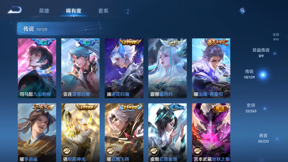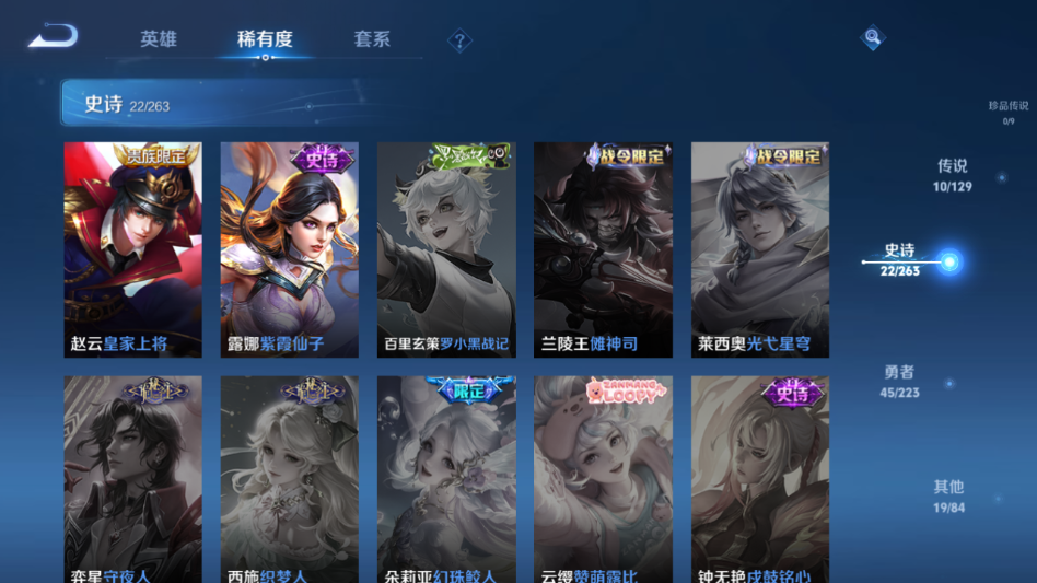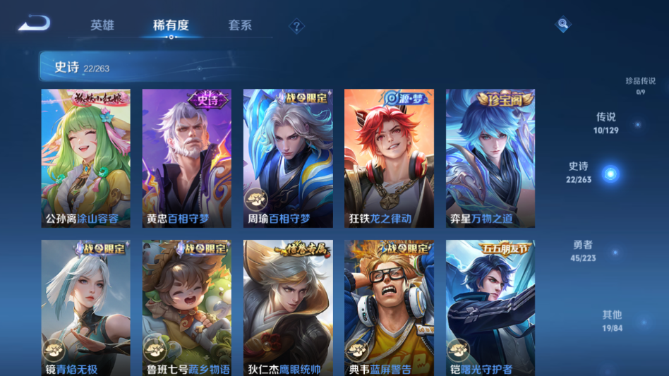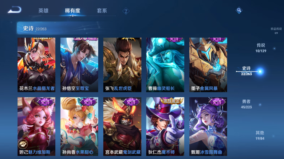 贵族等级:v6皮肤数:97传说品质10 荣耀典藏1 情人节限定1 生肖限定1 英雄数:101