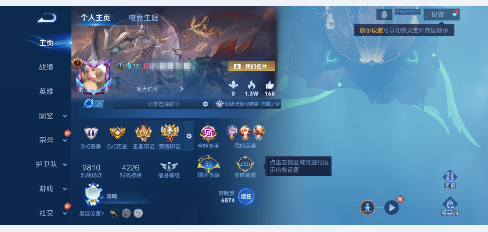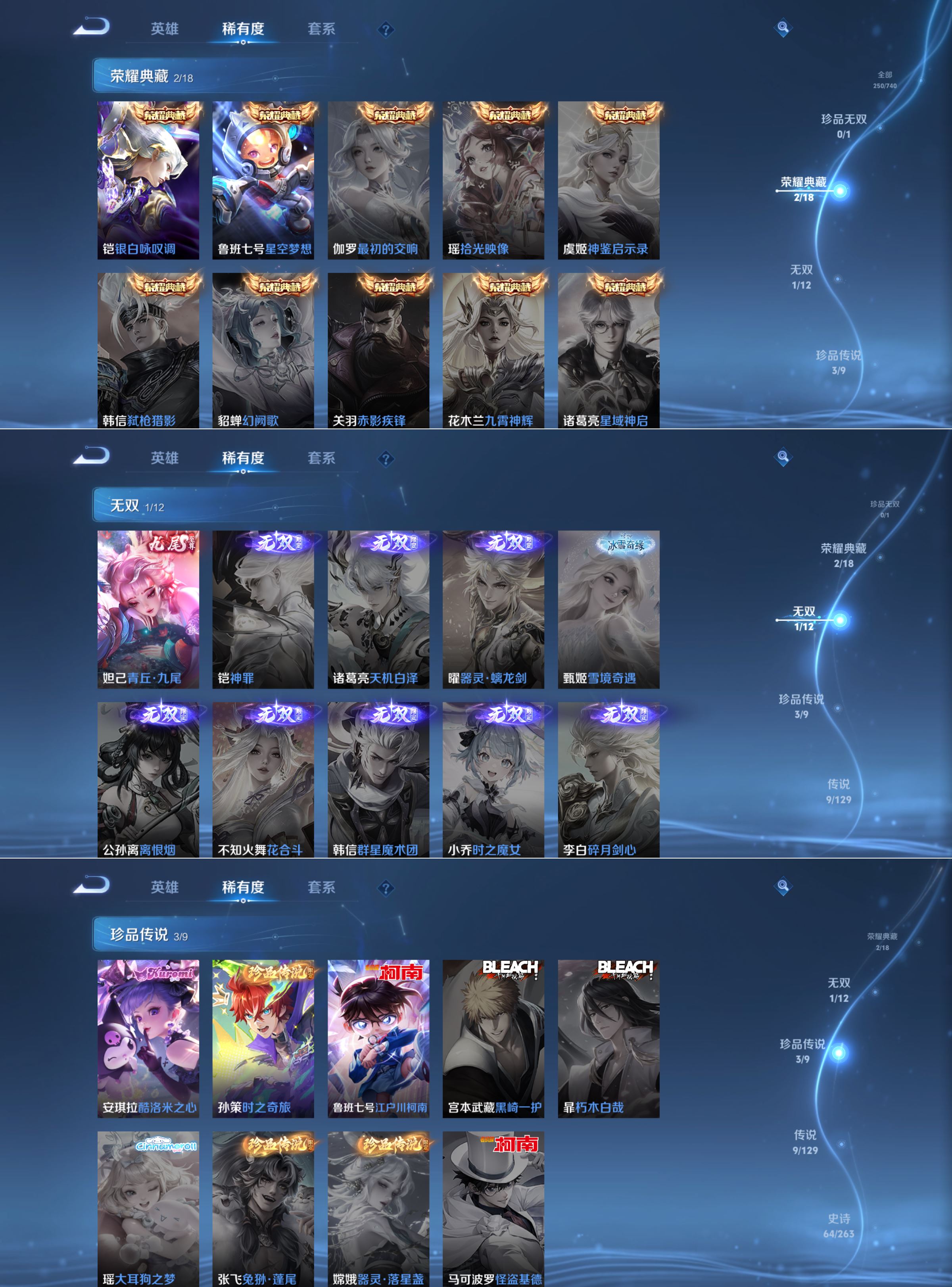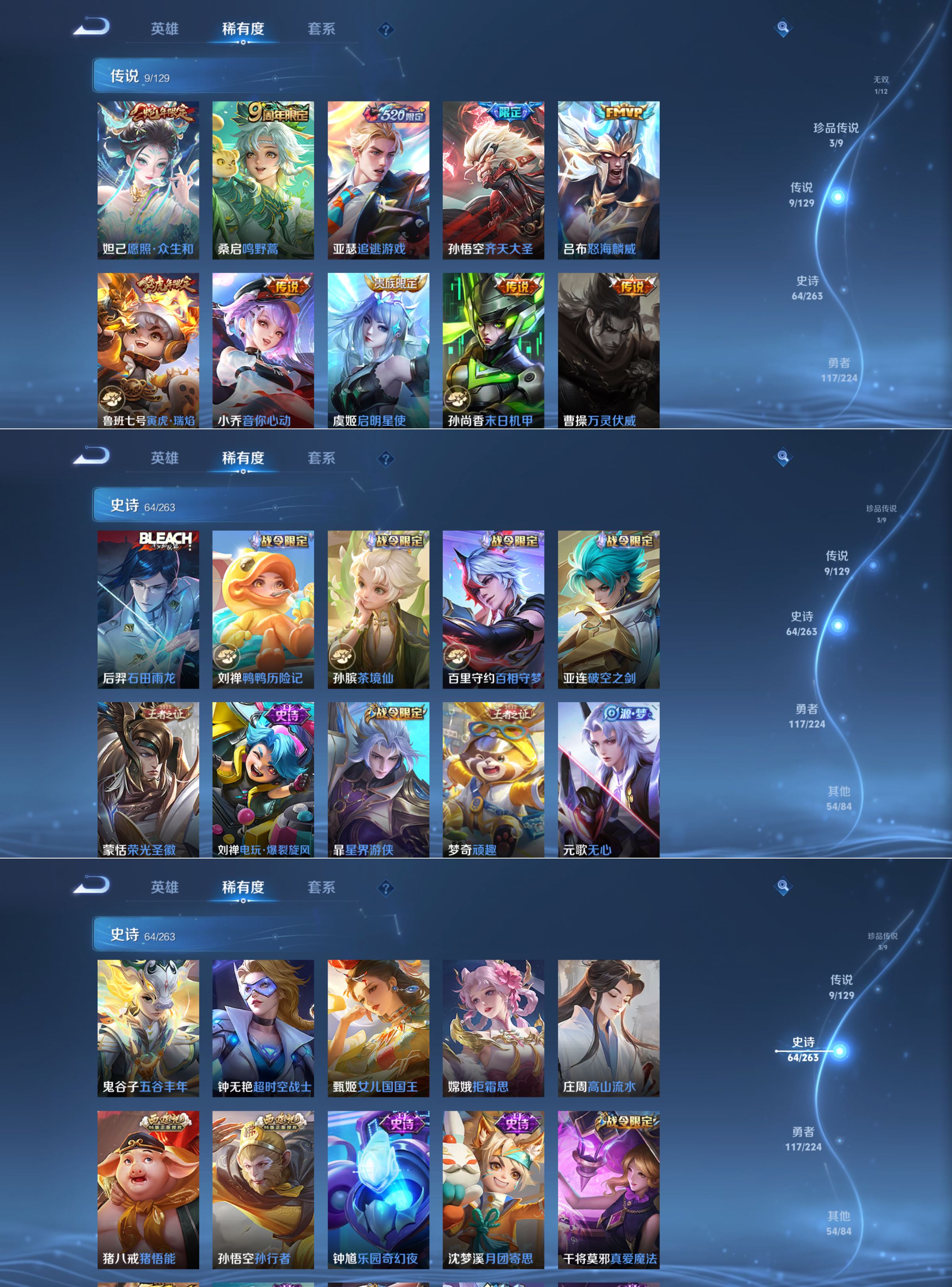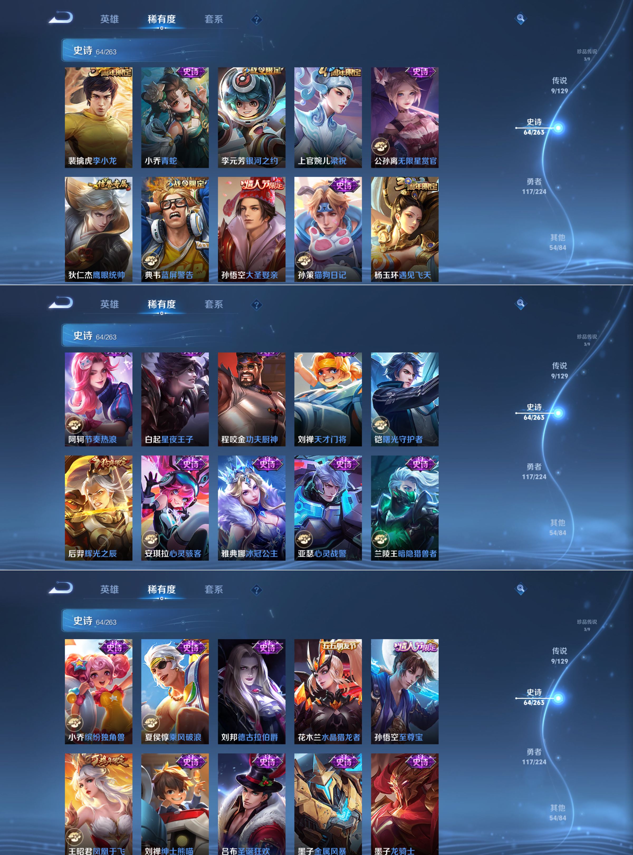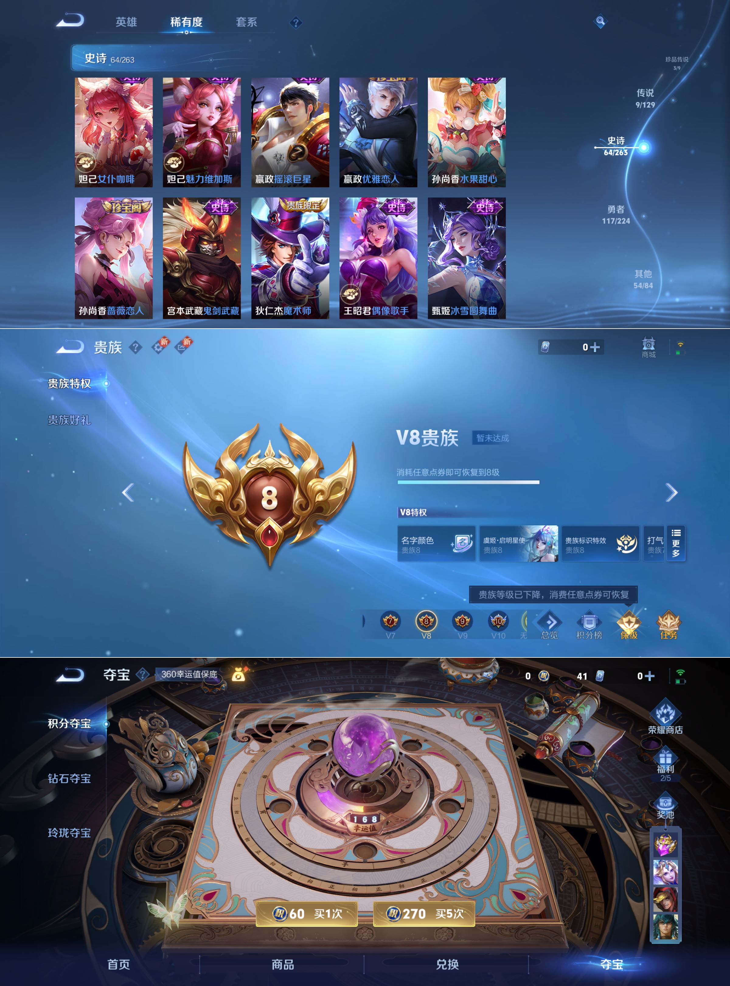 贵族等级:v8皮肤数:250生肖限定4 珍品传说3 传说品质9 情人节限定2 无双1 荣耀典藏2 英雄数:128
