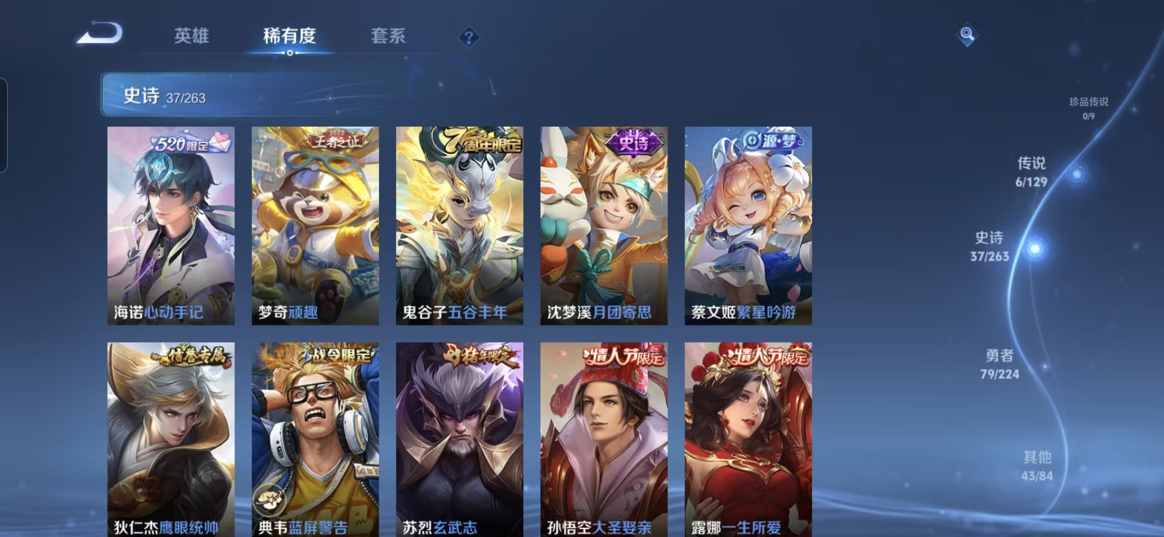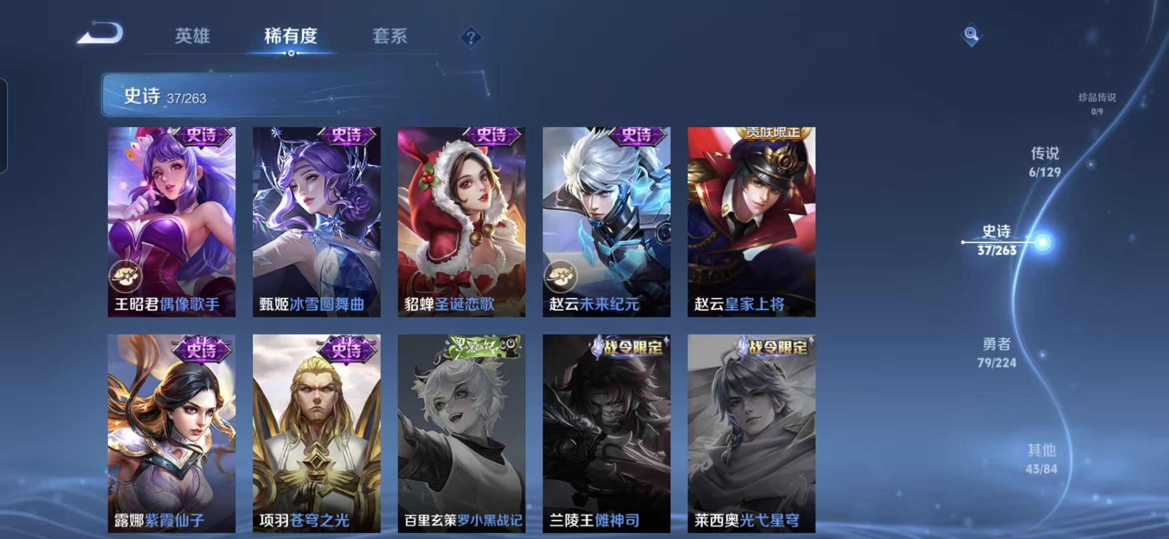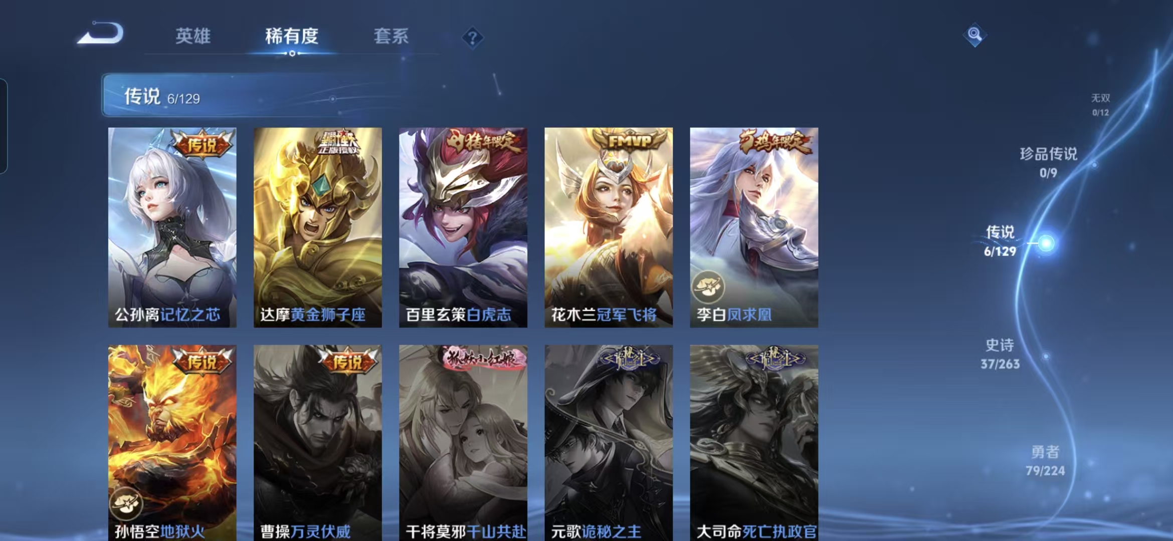 贵族等级:v7皮肤数:165生肖限定5 传说品质6 情人节限定2 英雄数:122