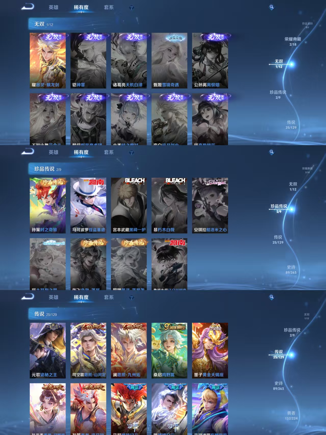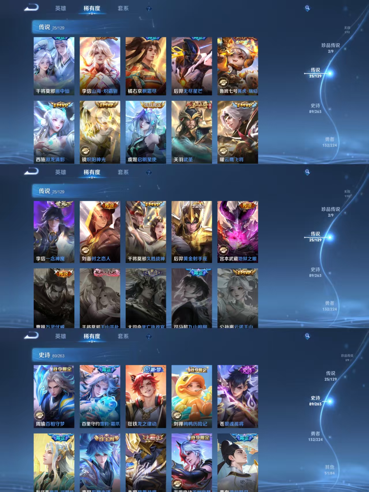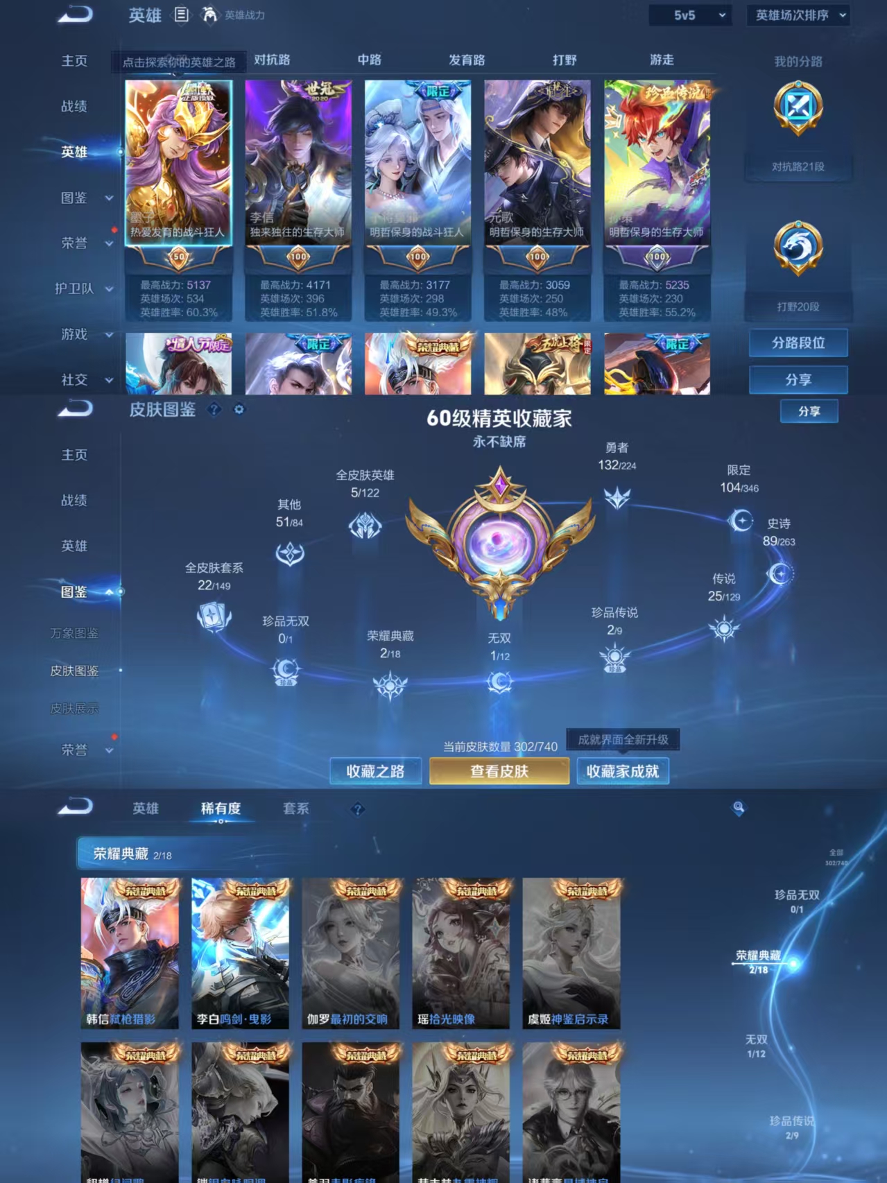 贵族等级:v8皮肤数:302传说品质25 生肖限定8 珍品传说2 情人节限定1 荣耀典藏2 无双1 英雄数:127