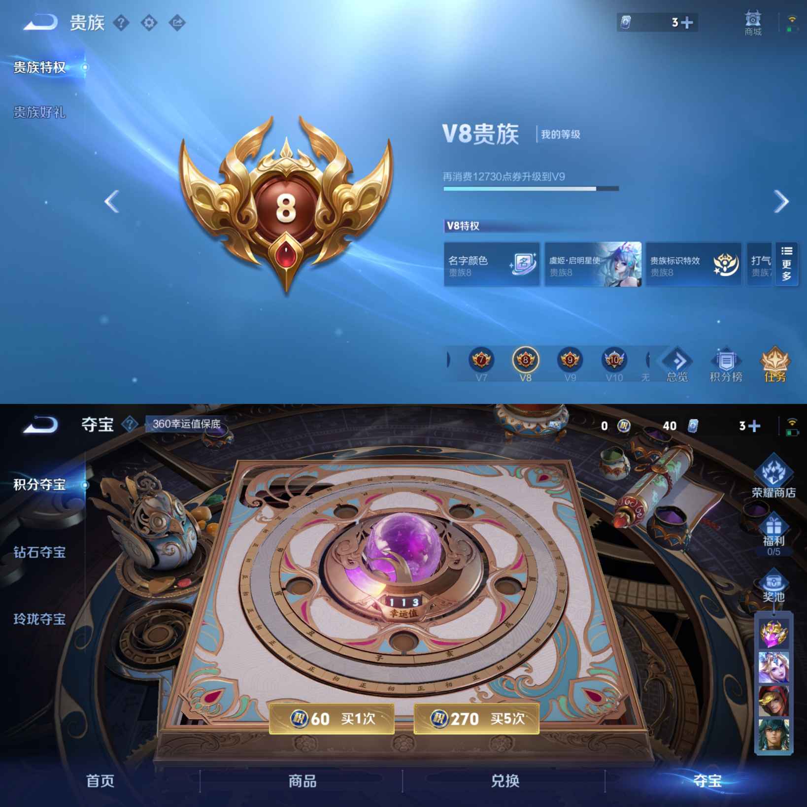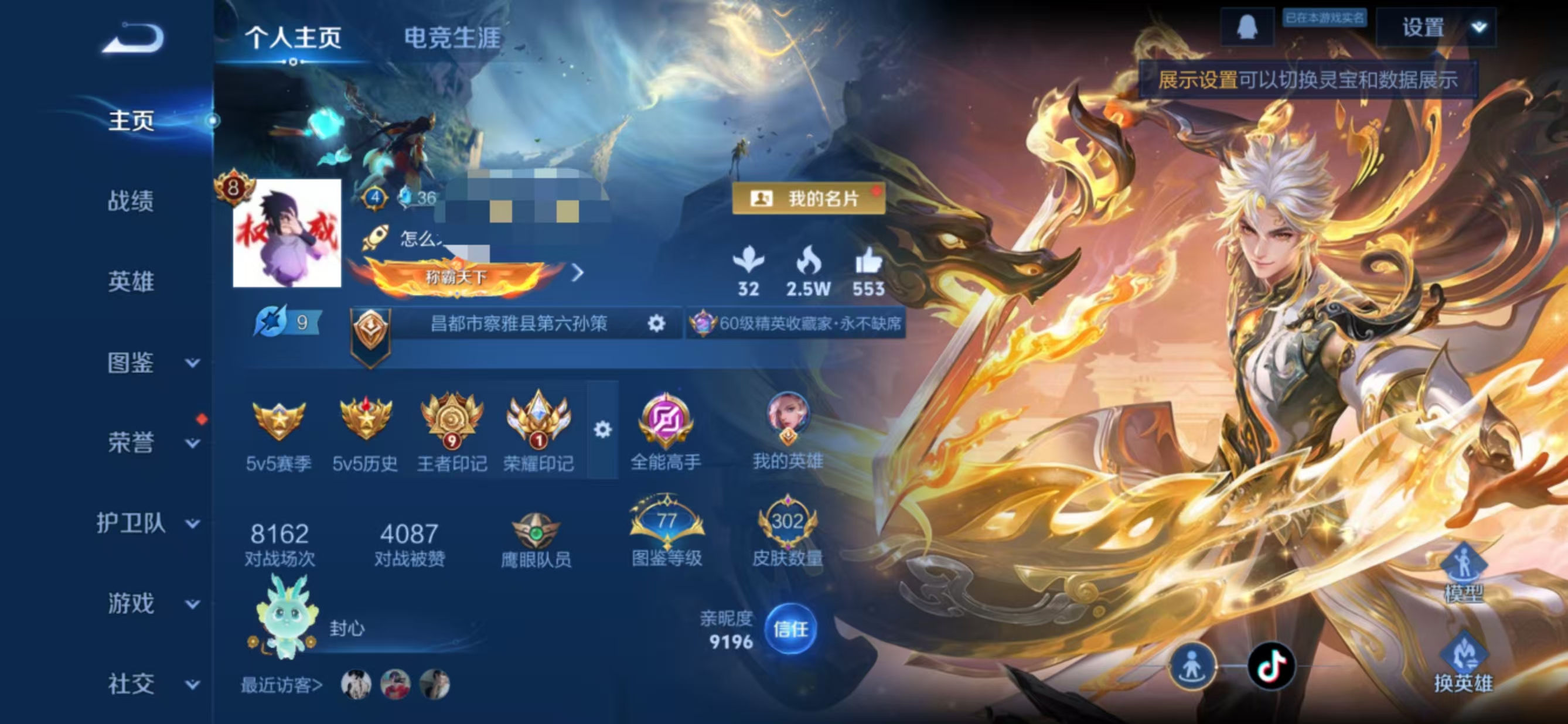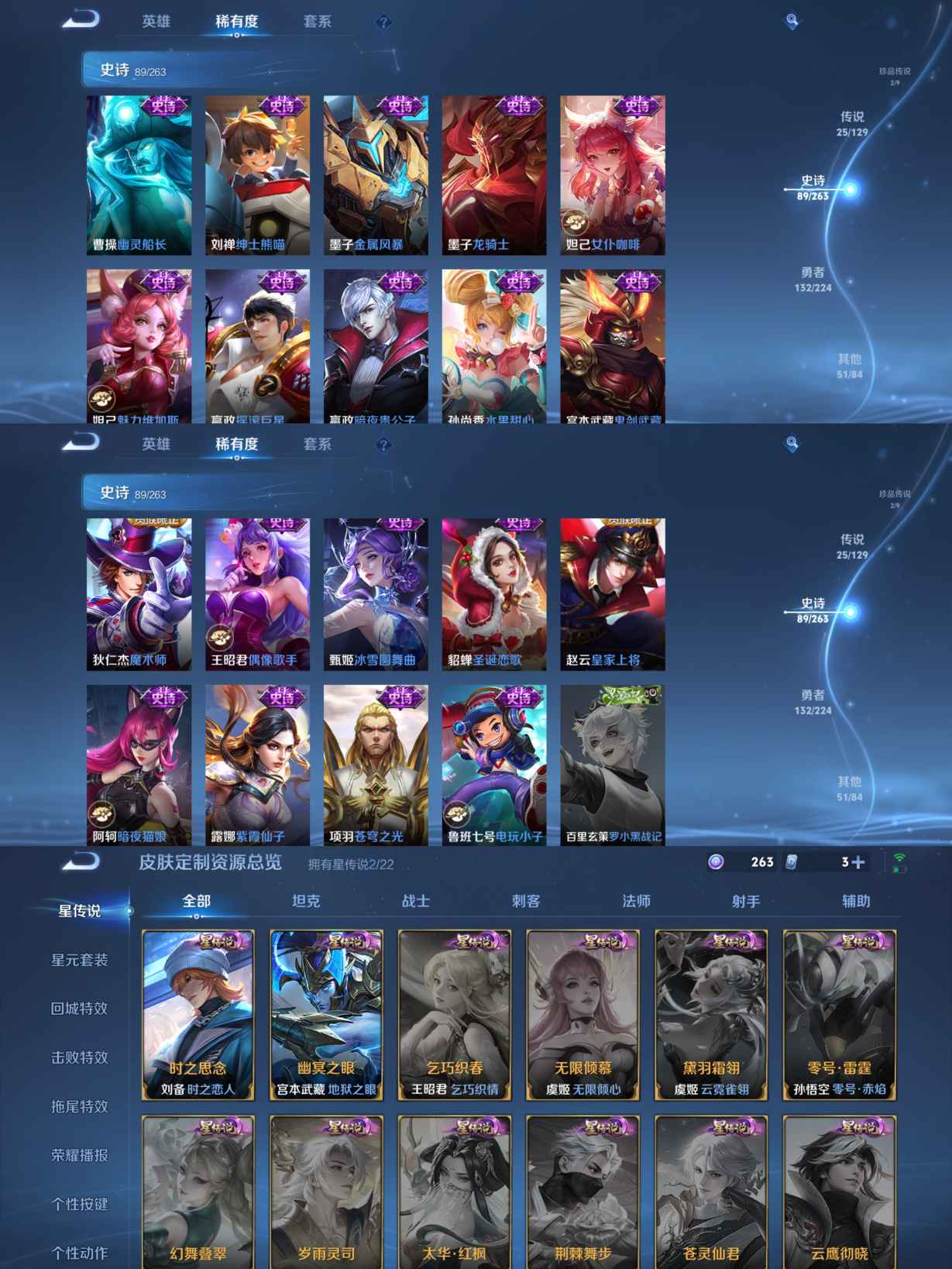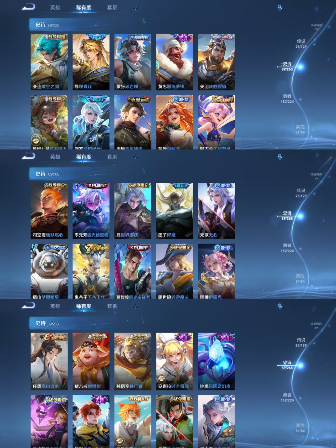 贵族等级:v8皮肤数:302传说品质25 生肖限定8 珍品传说2 情人节限定1 荣耀典藏2 无双1 英雄数:127