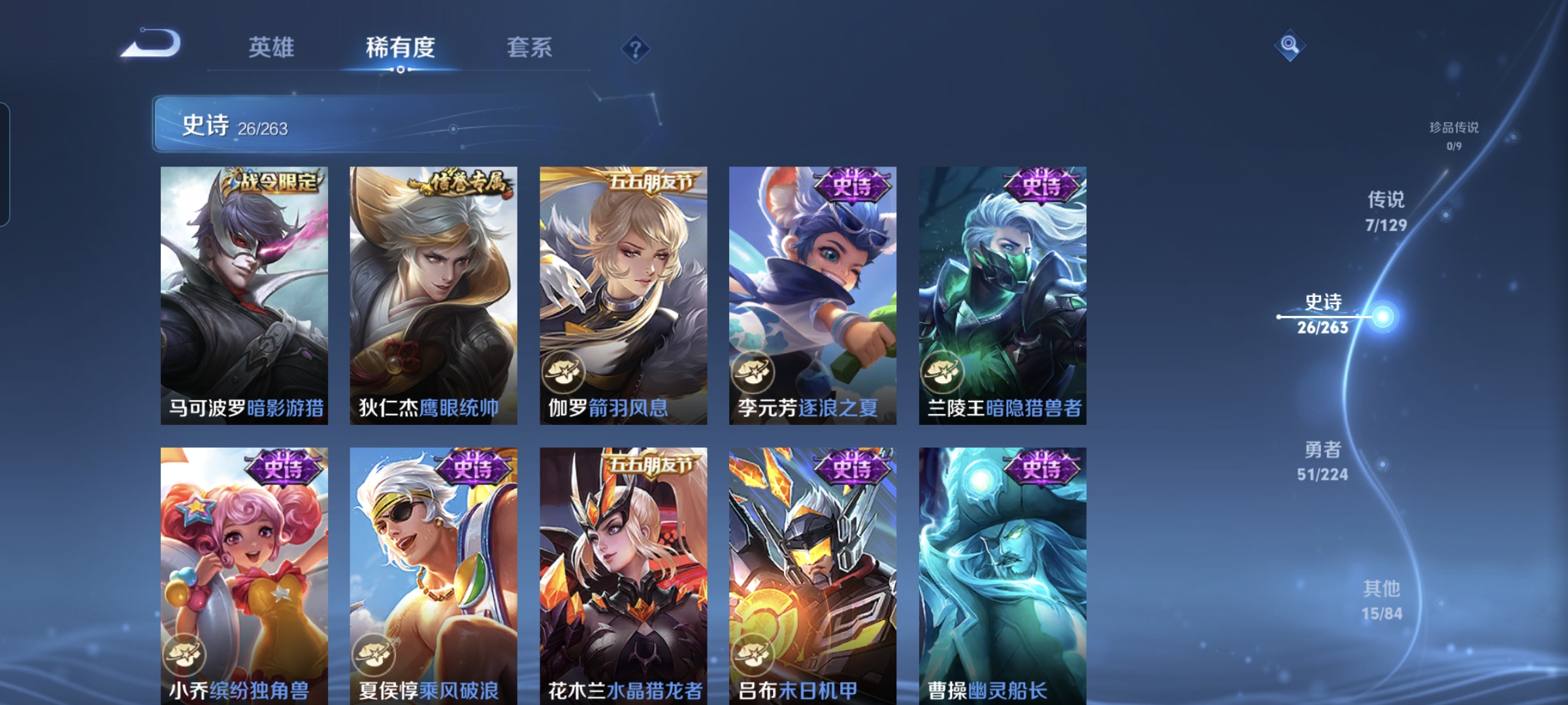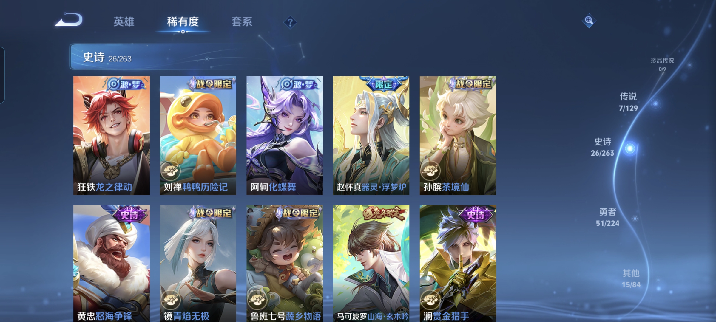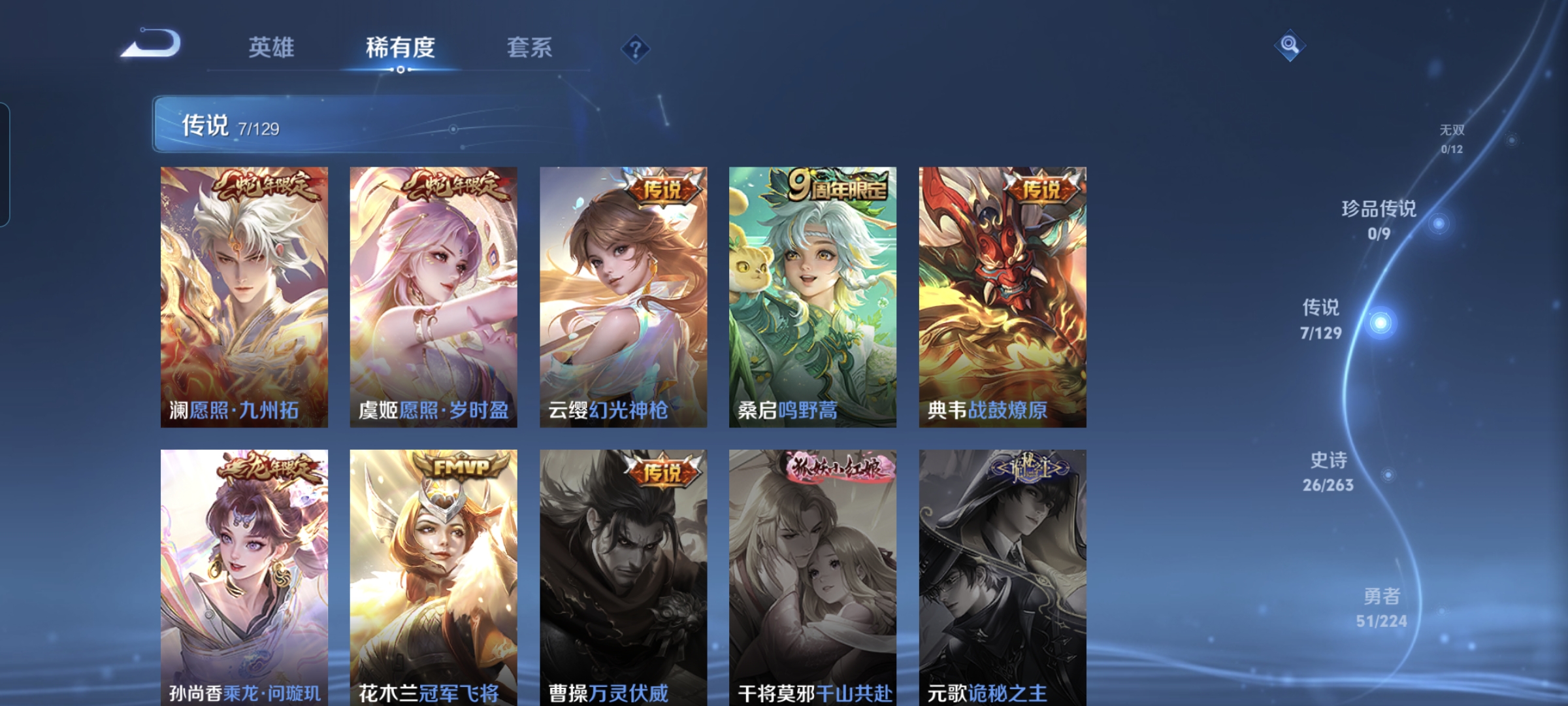 贵族等级:v5皮肤数:100传说品质7 生肖限定4 荣耀典藏1 英雄数:113