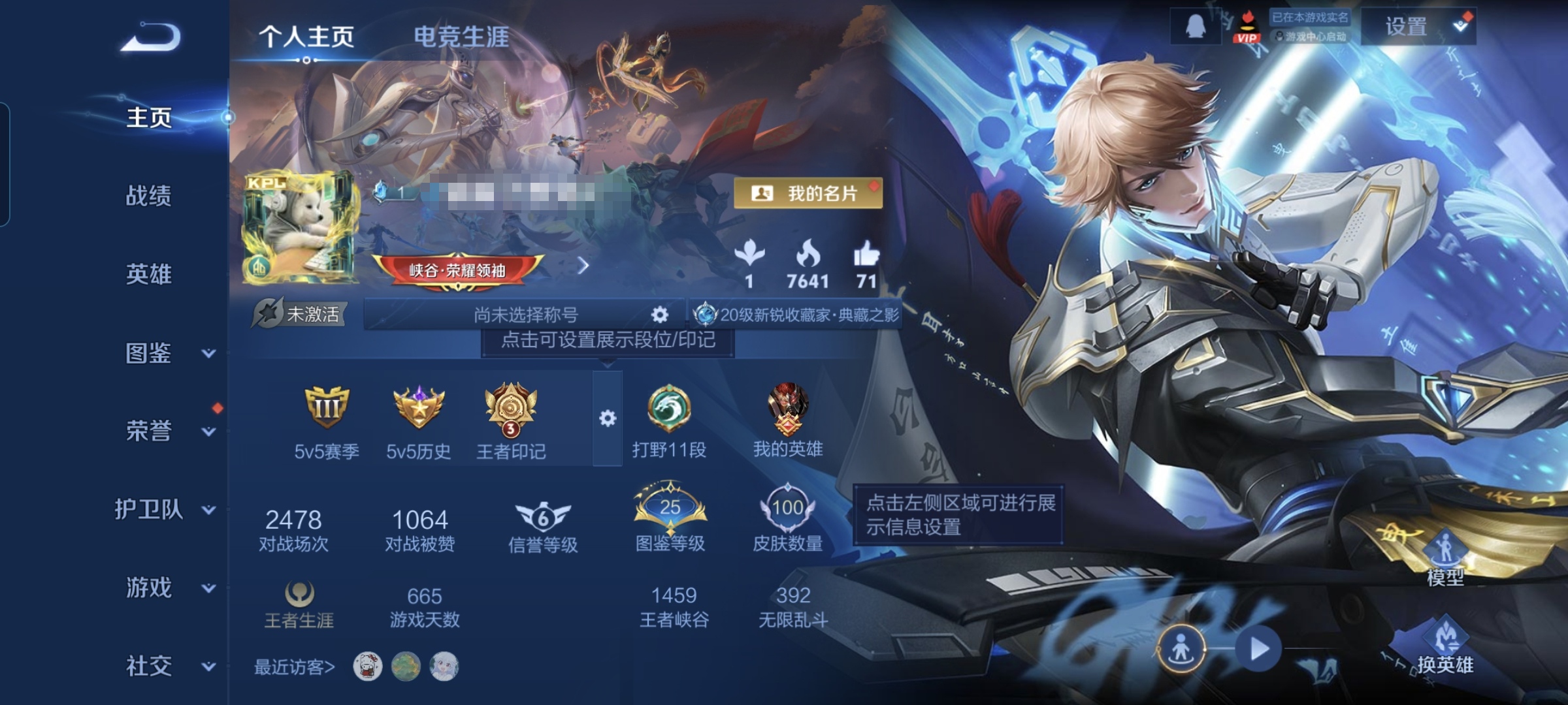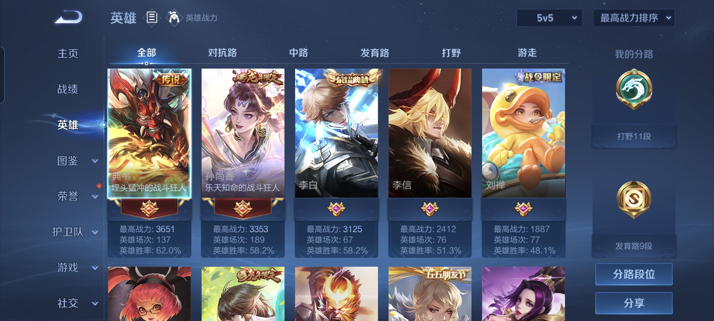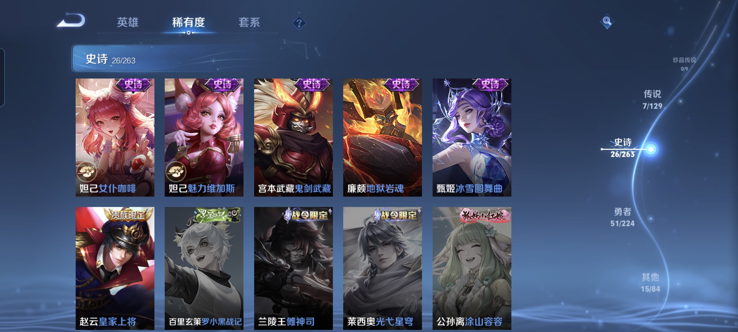 贵族等级:v5皮肤数:100传说品质7 生肖限定4 荣耀典藏1 英雄数:113
