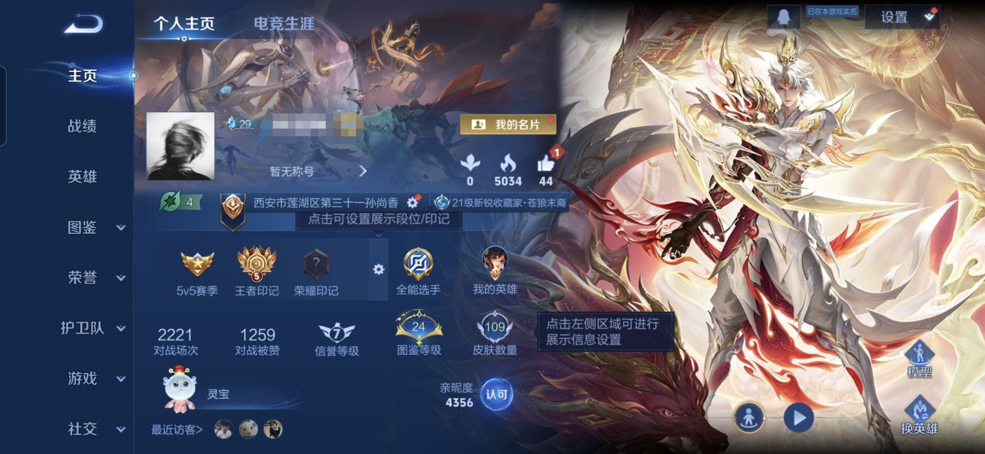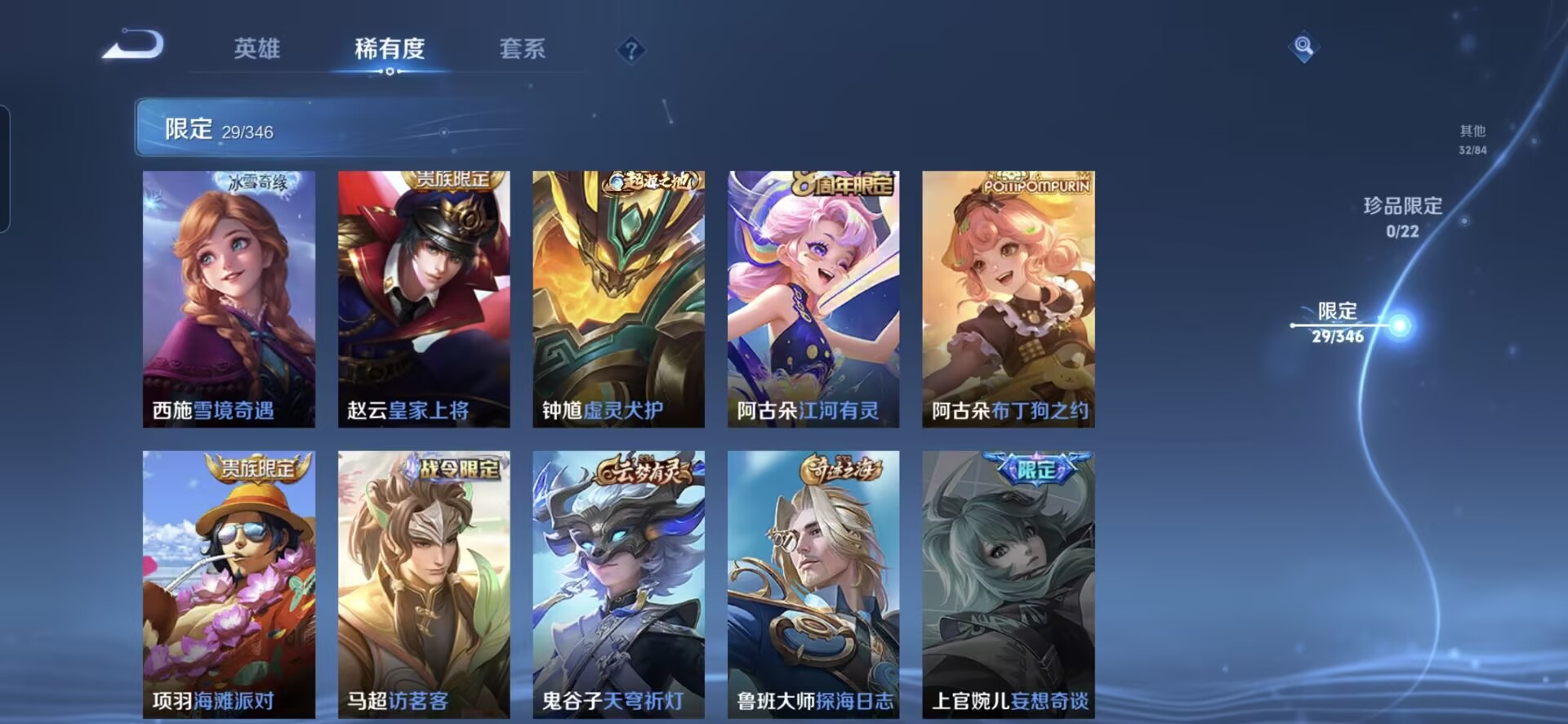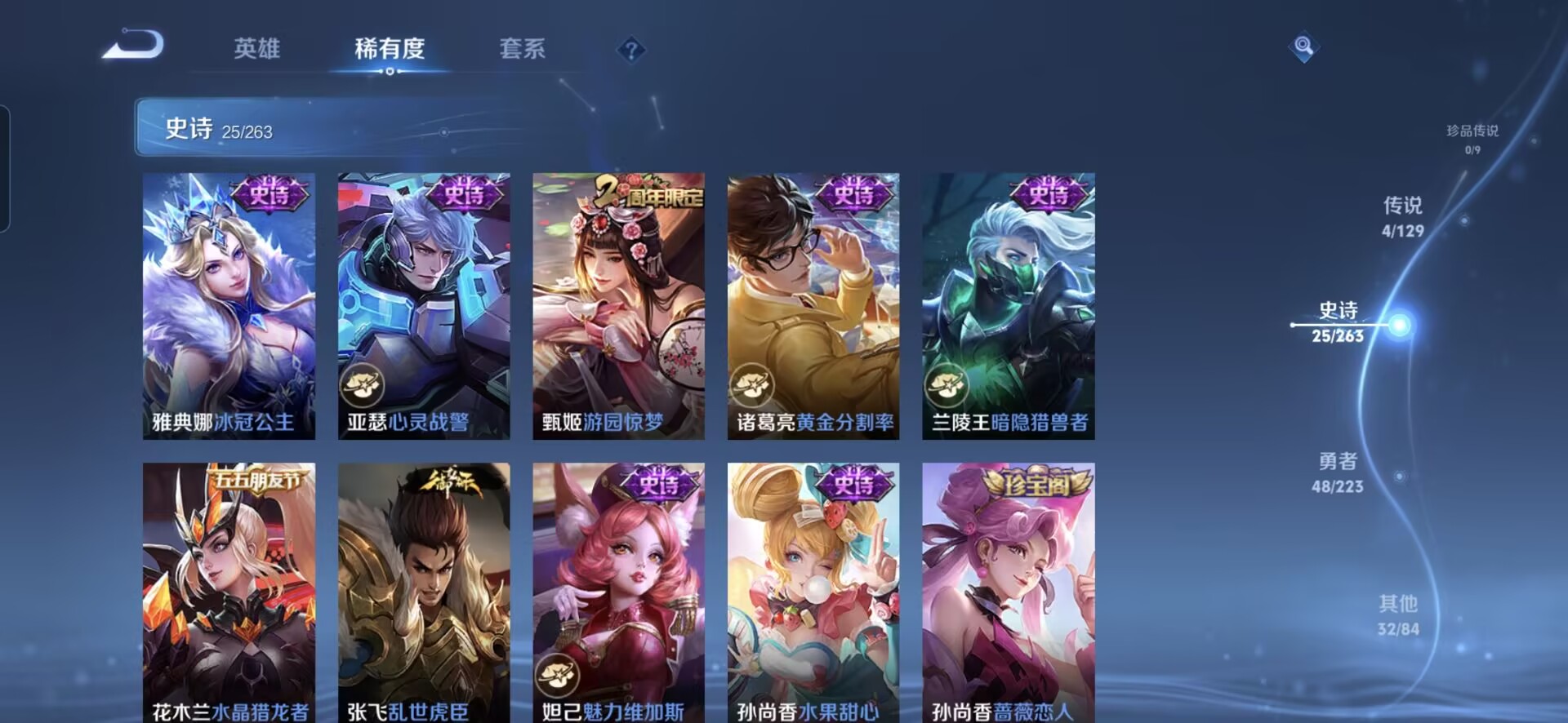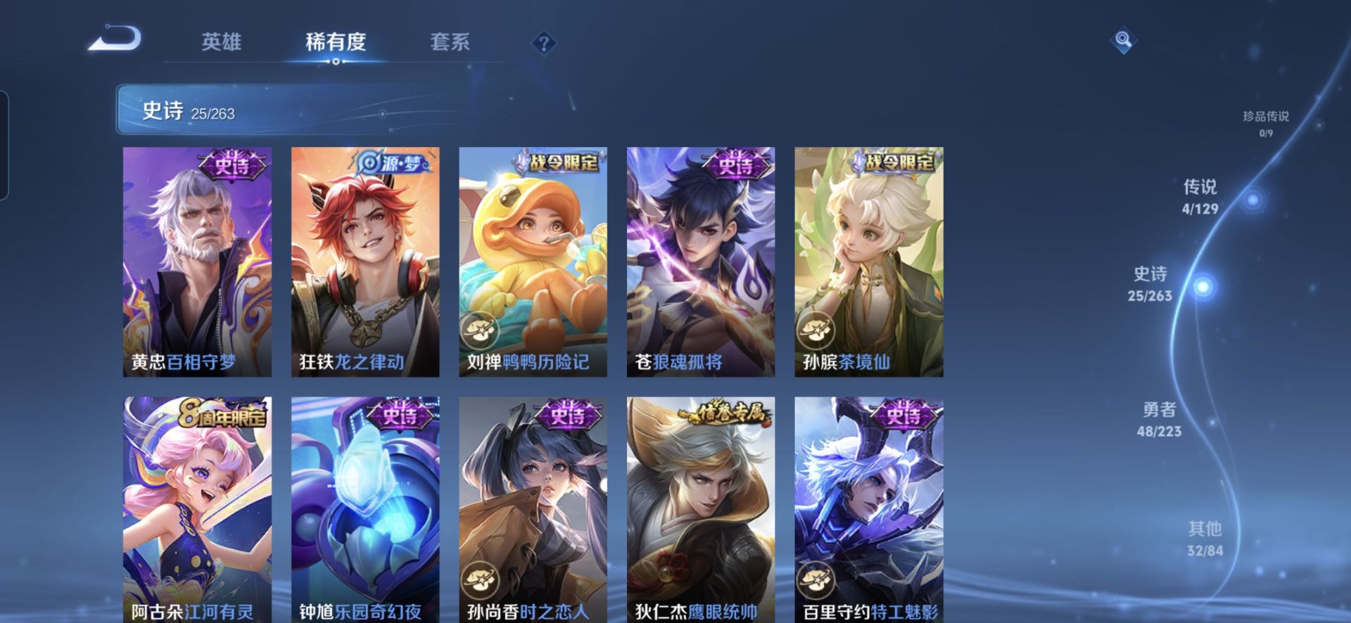 贵族等级:v6皮肤数:109传说品质4 生肖限定1 英雄数:110