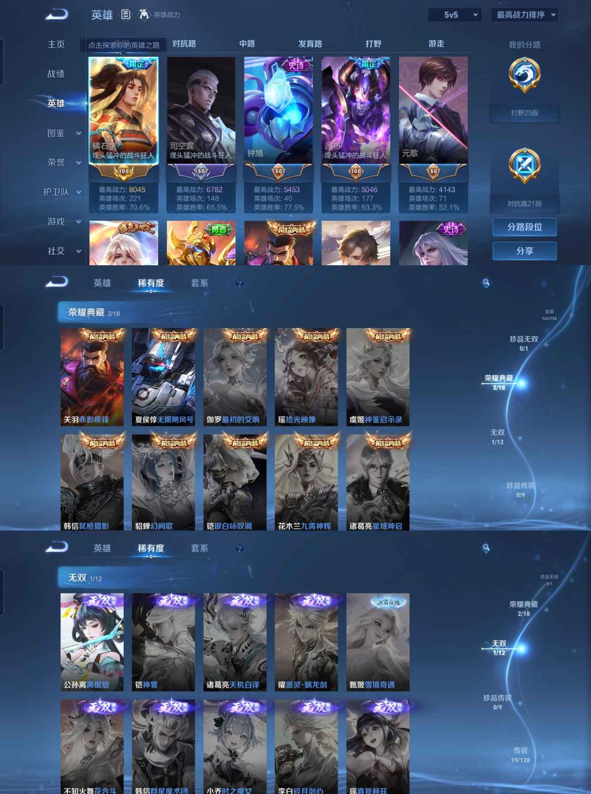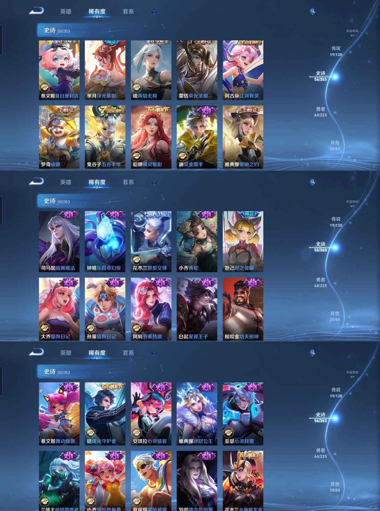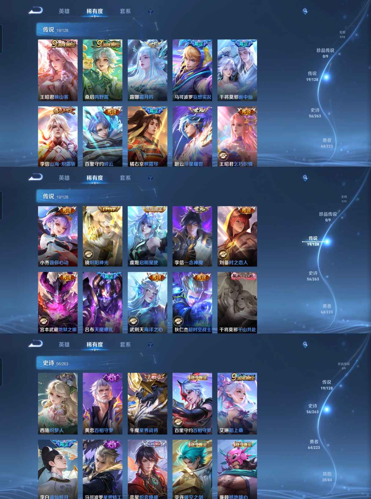 贵族等级:v8皮肤数:162荣耀典藏2 传说品质19 情人节限定2 无双1 生肖限定1 英雄数:124