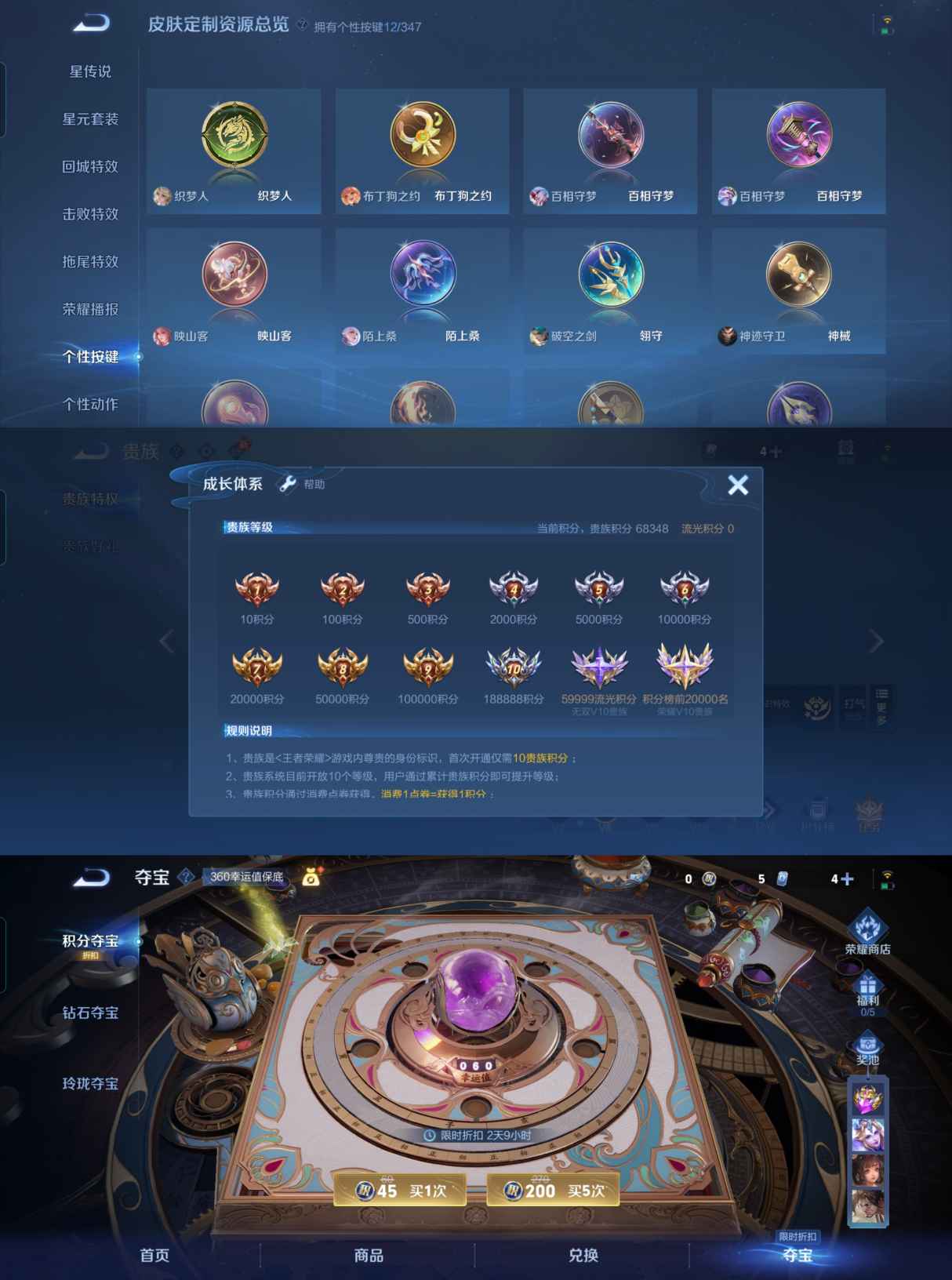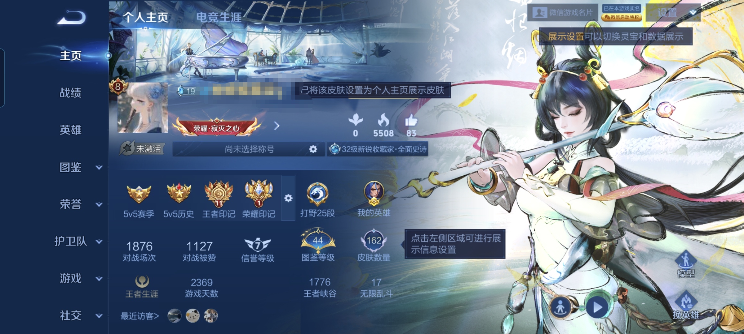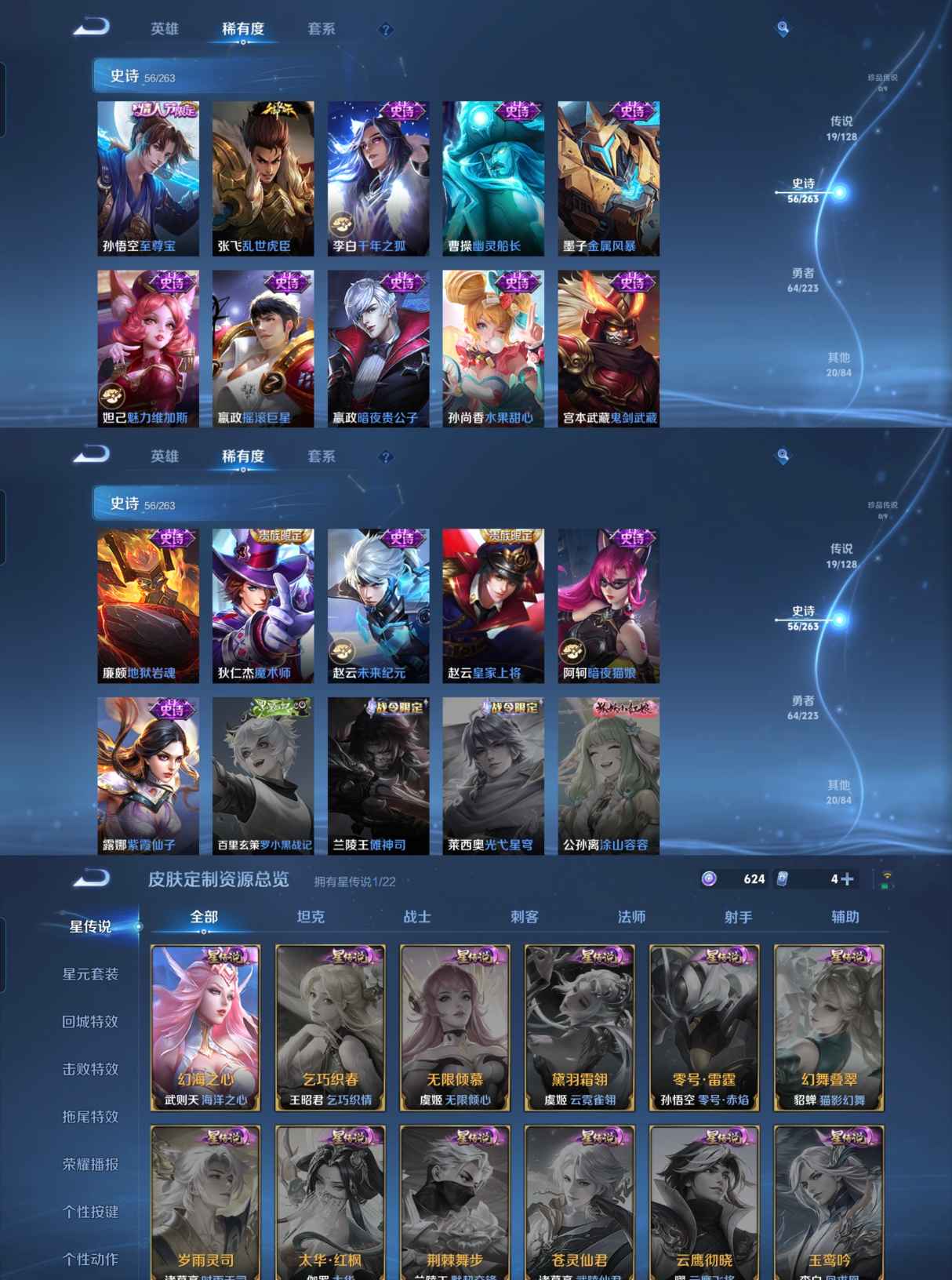 贵族等级:v8皮肤数:162荣耀典藏2 传说品质19 情人节限定2 无双1 生肖限定1 英雄数:124