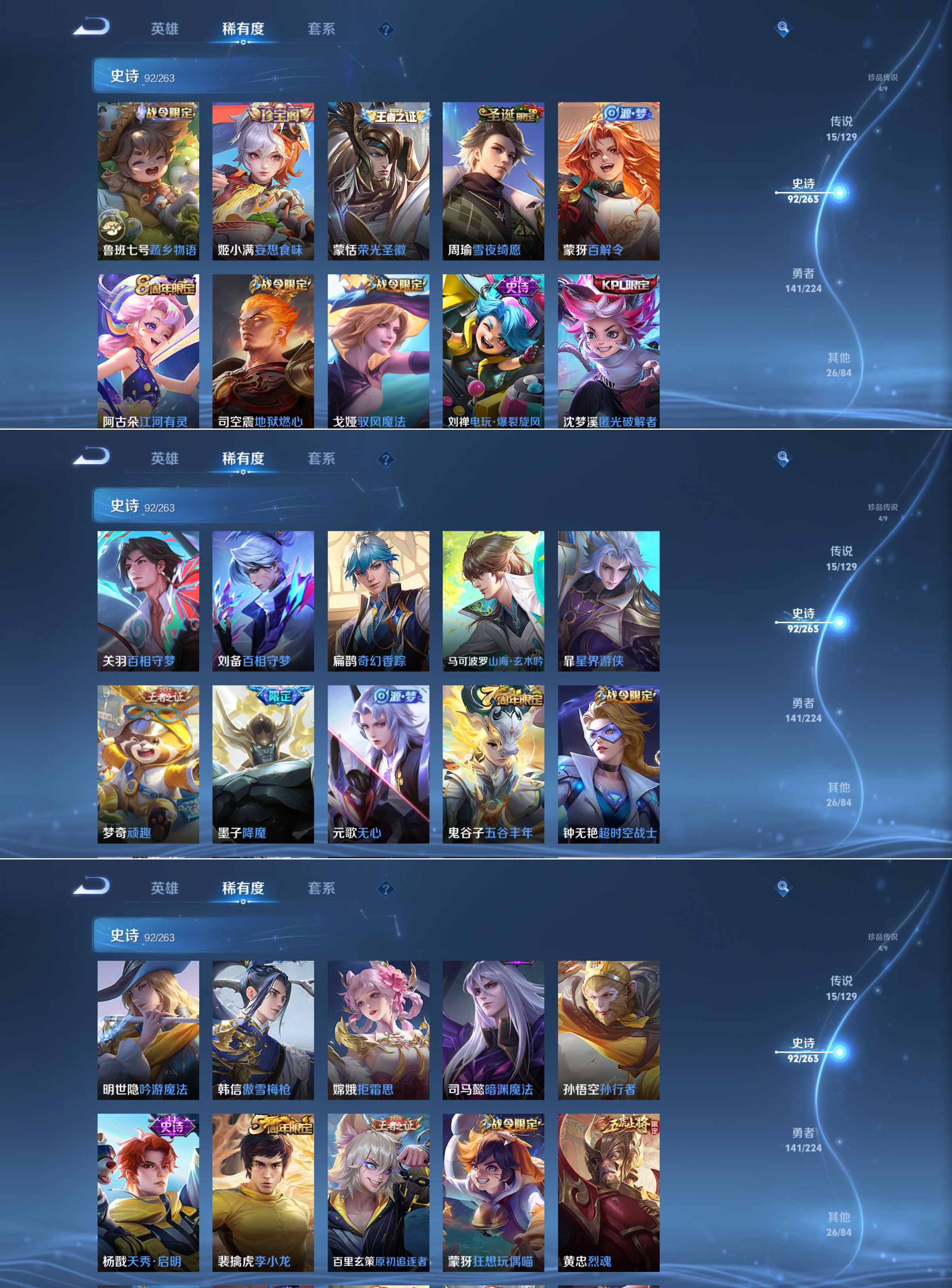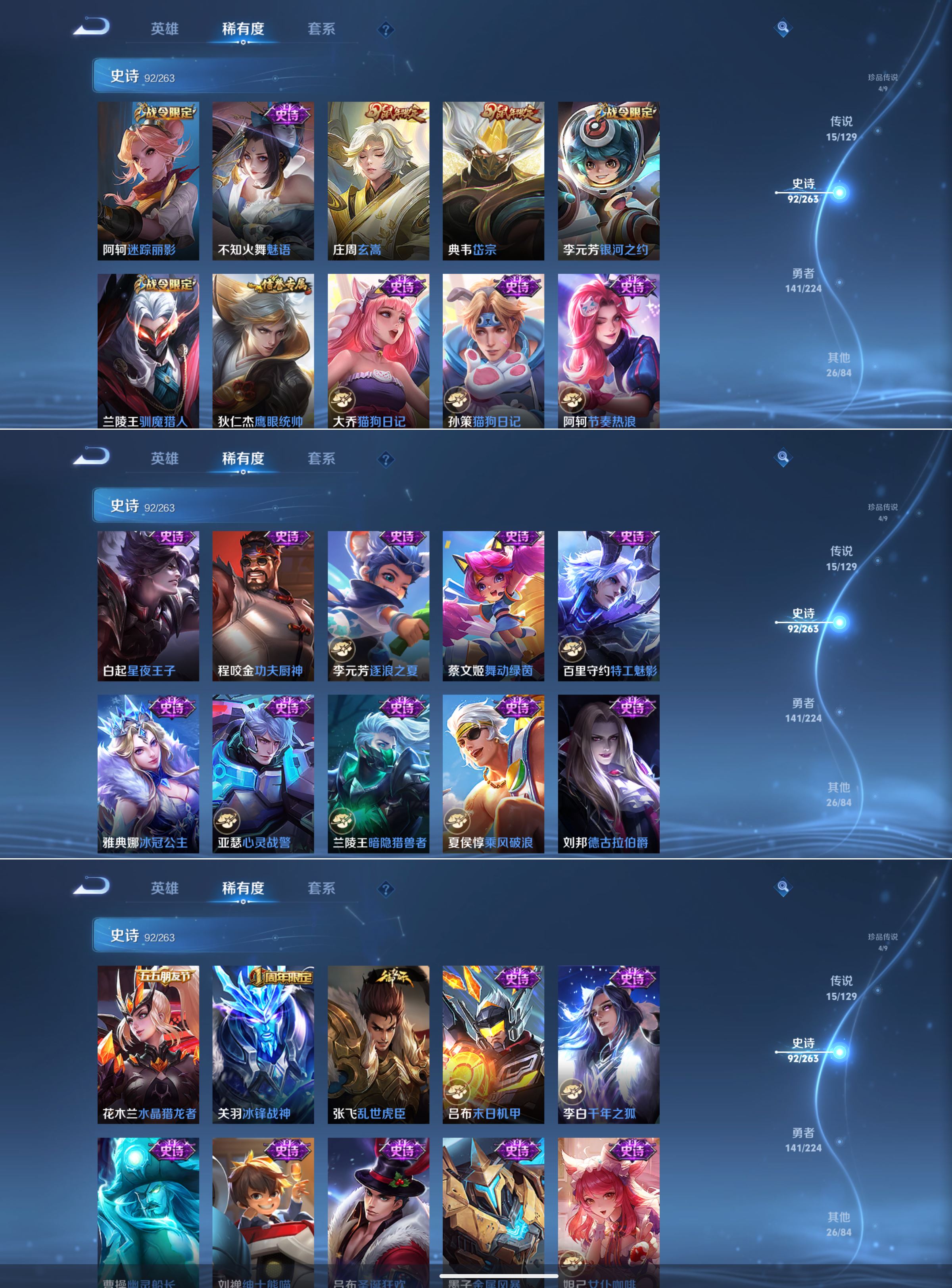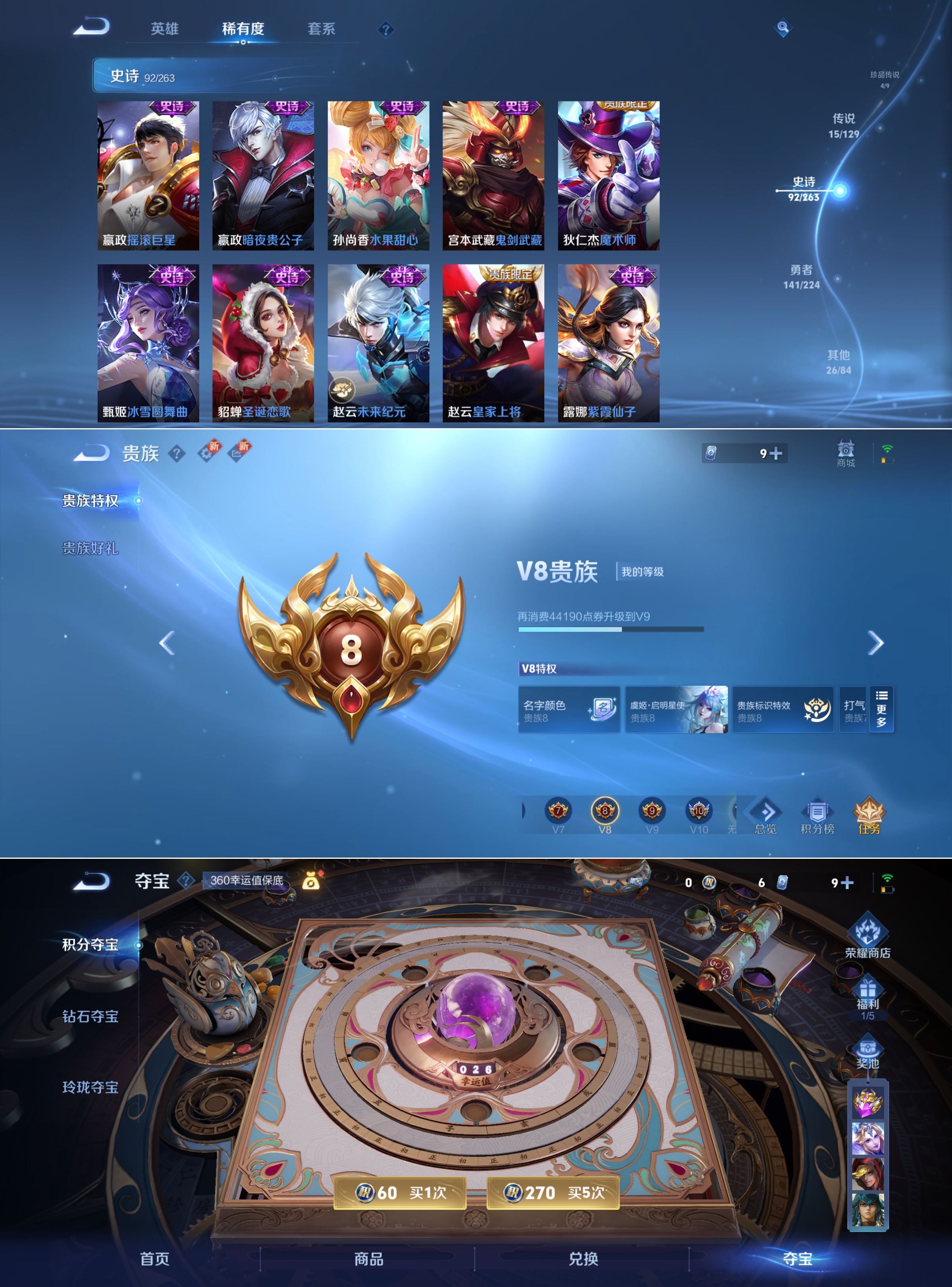 贵族等级:v8皮肤数:280传说品质15 生肖限定8 荣耀典藏2 珍品传说4 英雄数:124