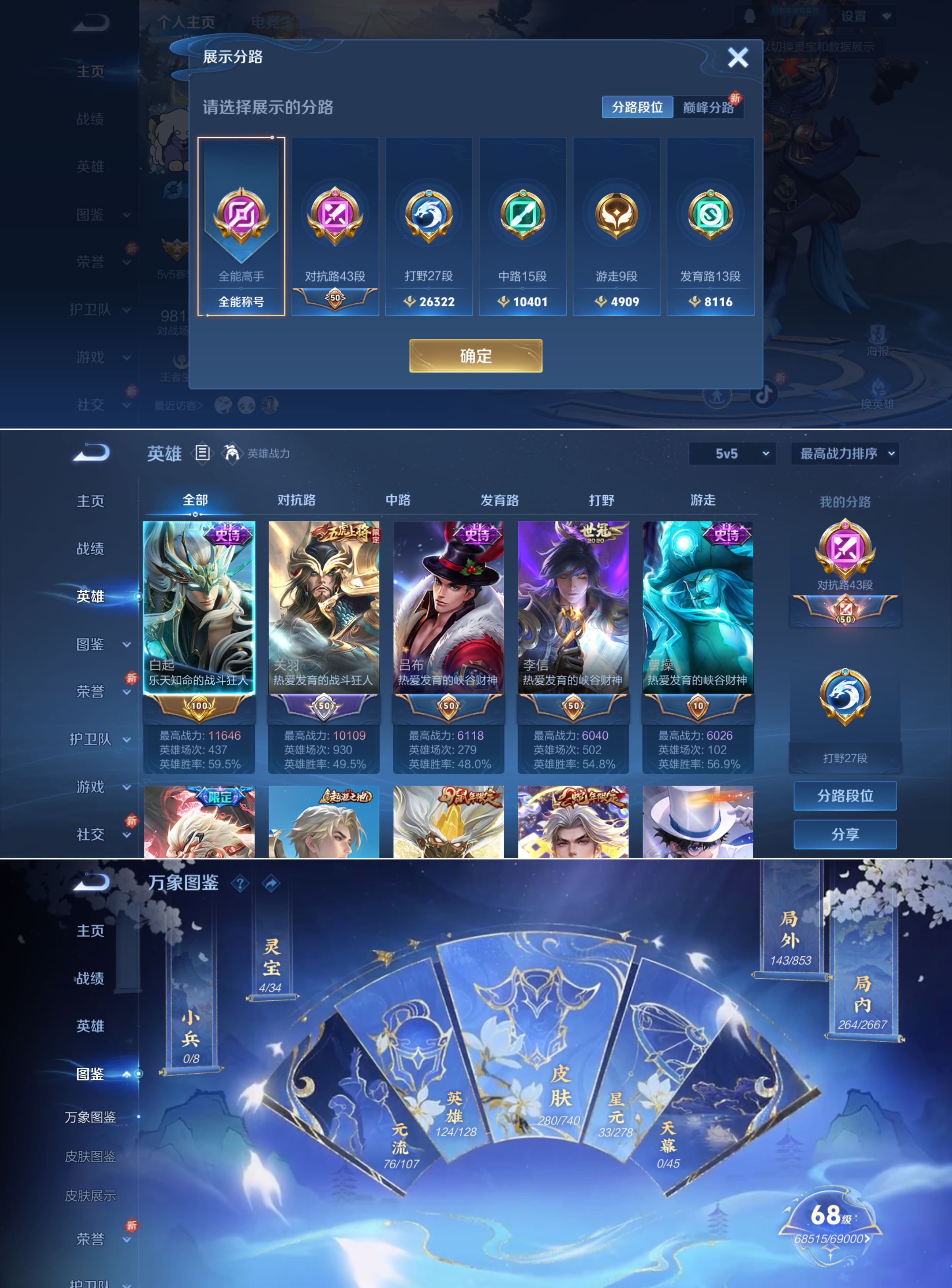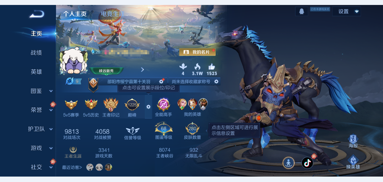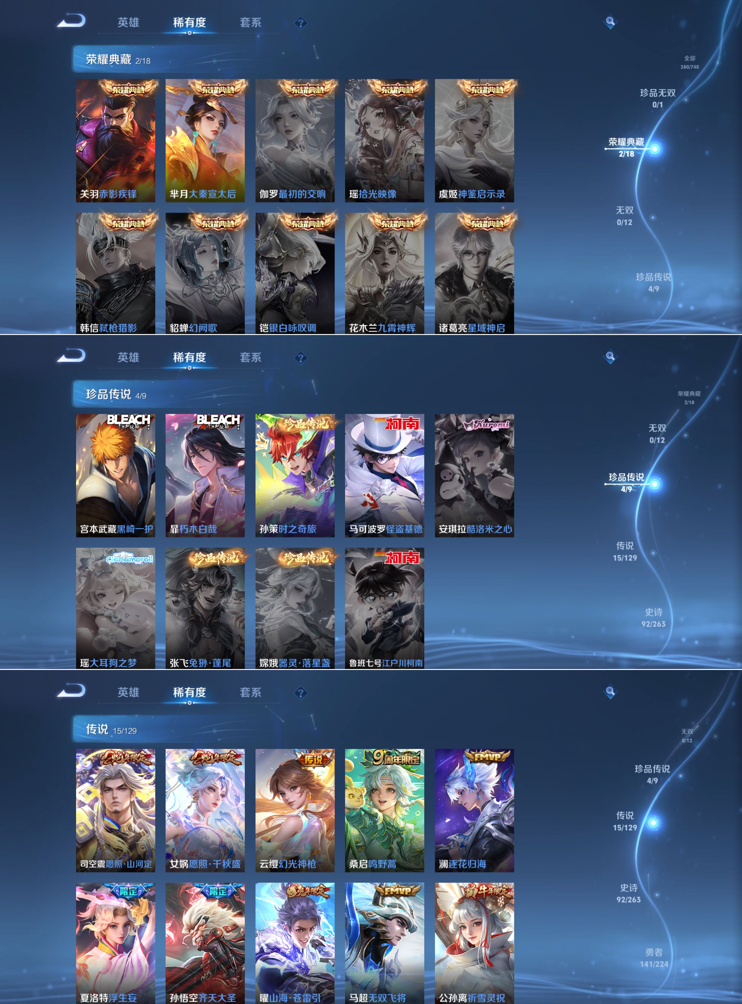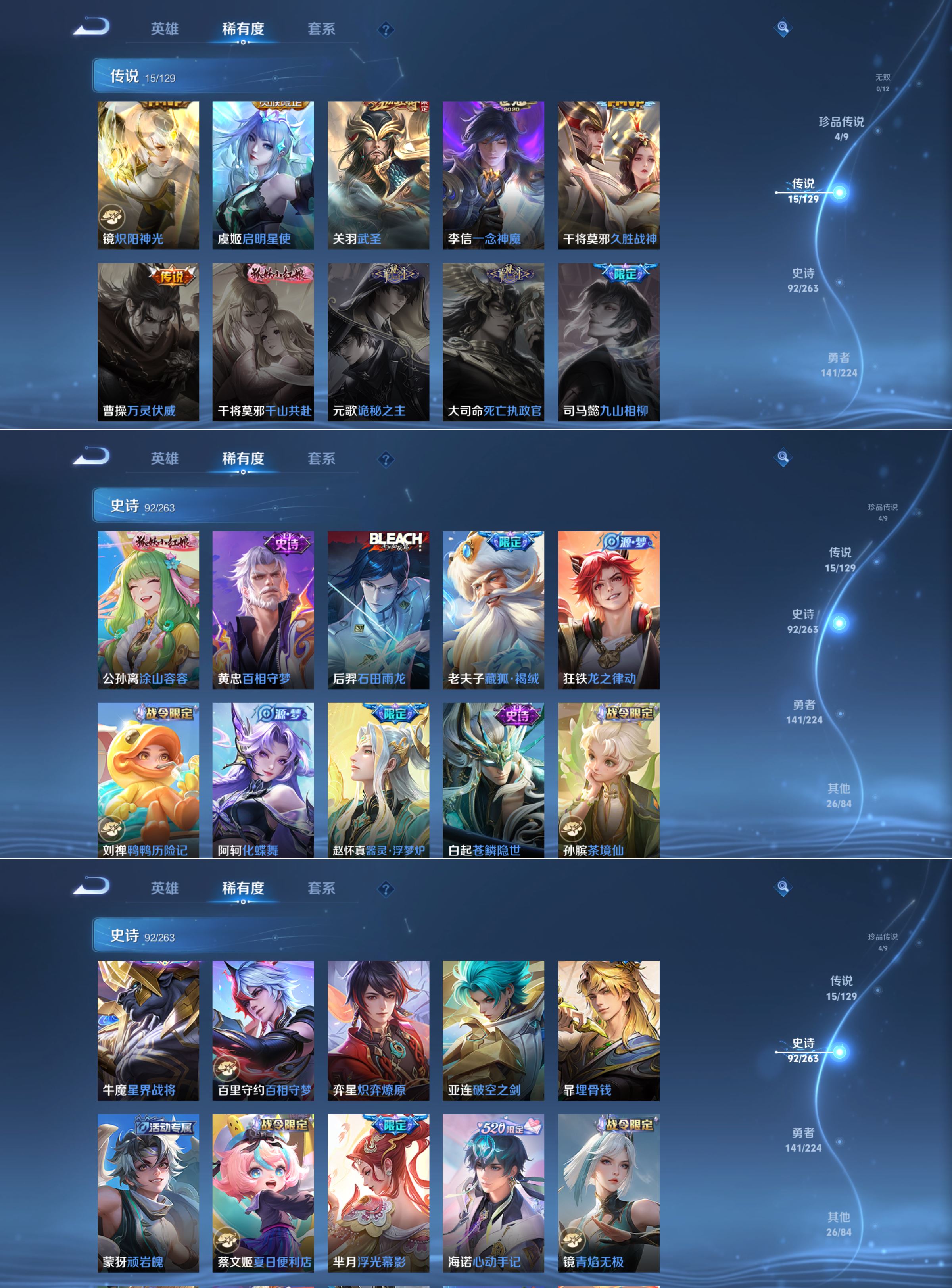 贵族等级:v8皮肤数:280传说品质15 生肖限定8 荣耀典藏2 珍品传说4 英雄数:124