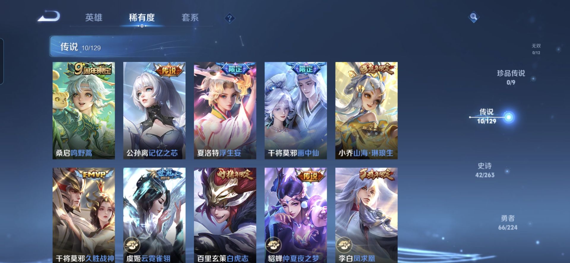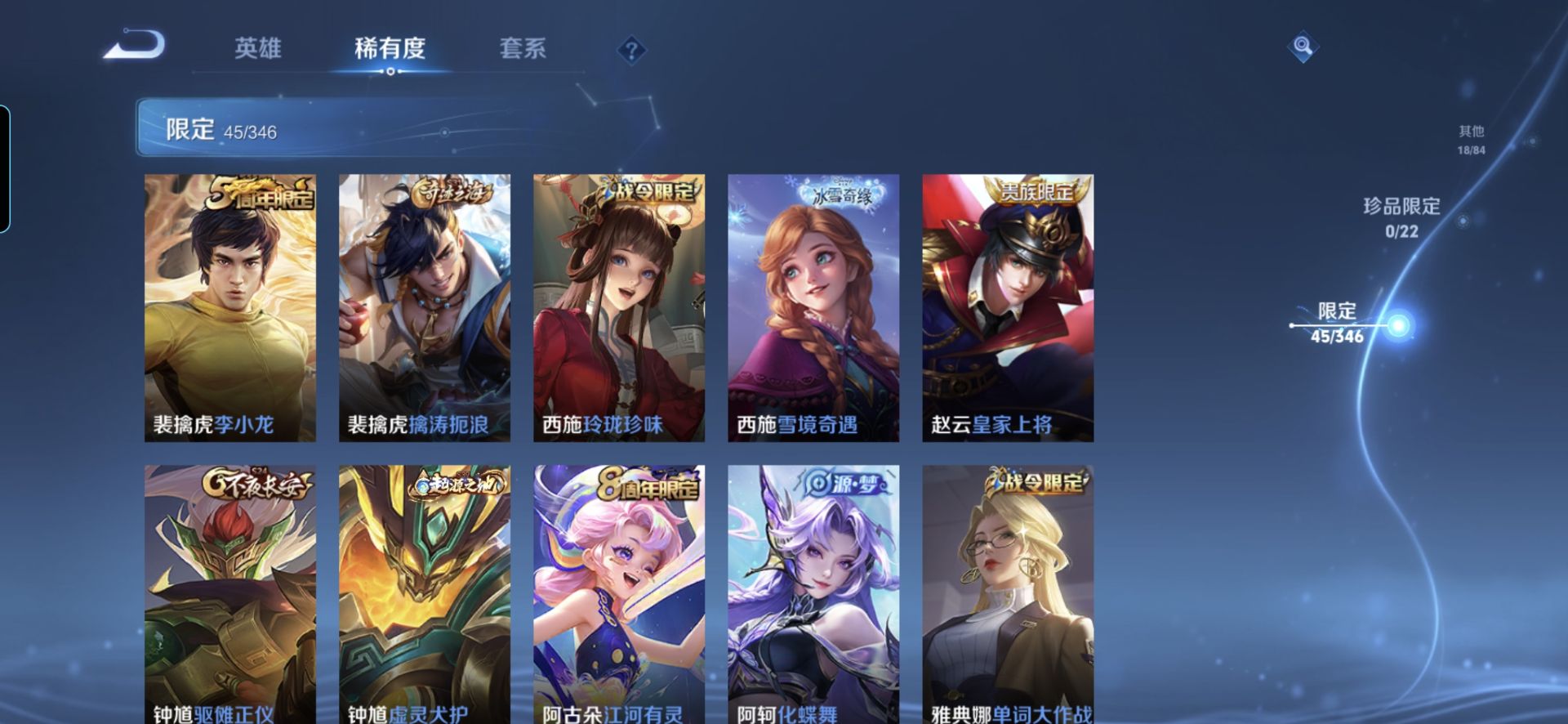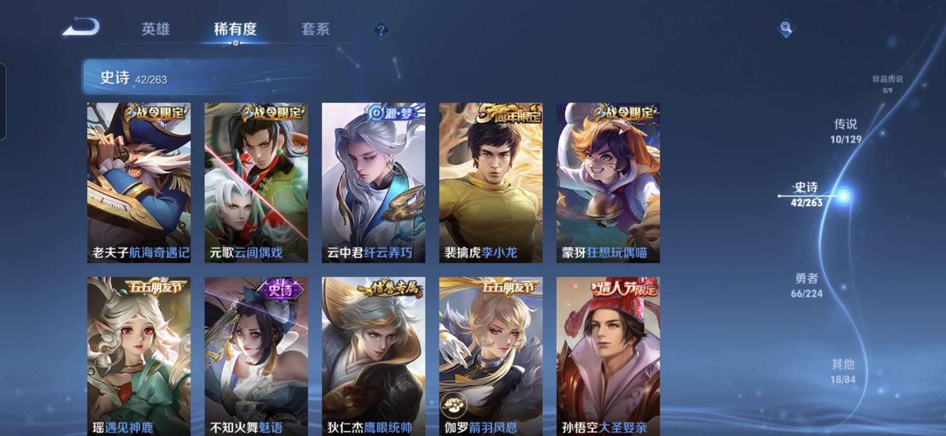 贵族等级:v7皮肤数:136生肖限定4 情人节限定1 传说品质10 英雄数:125