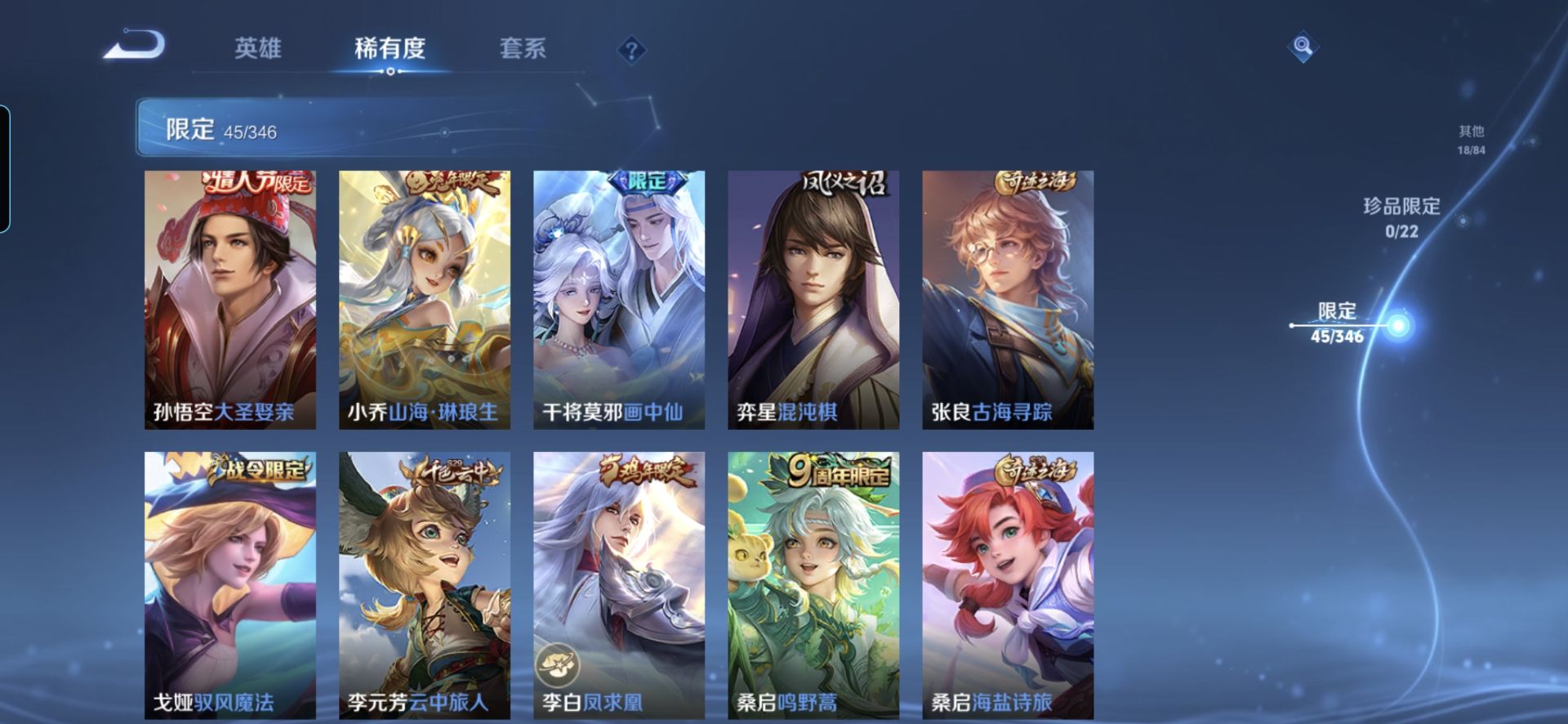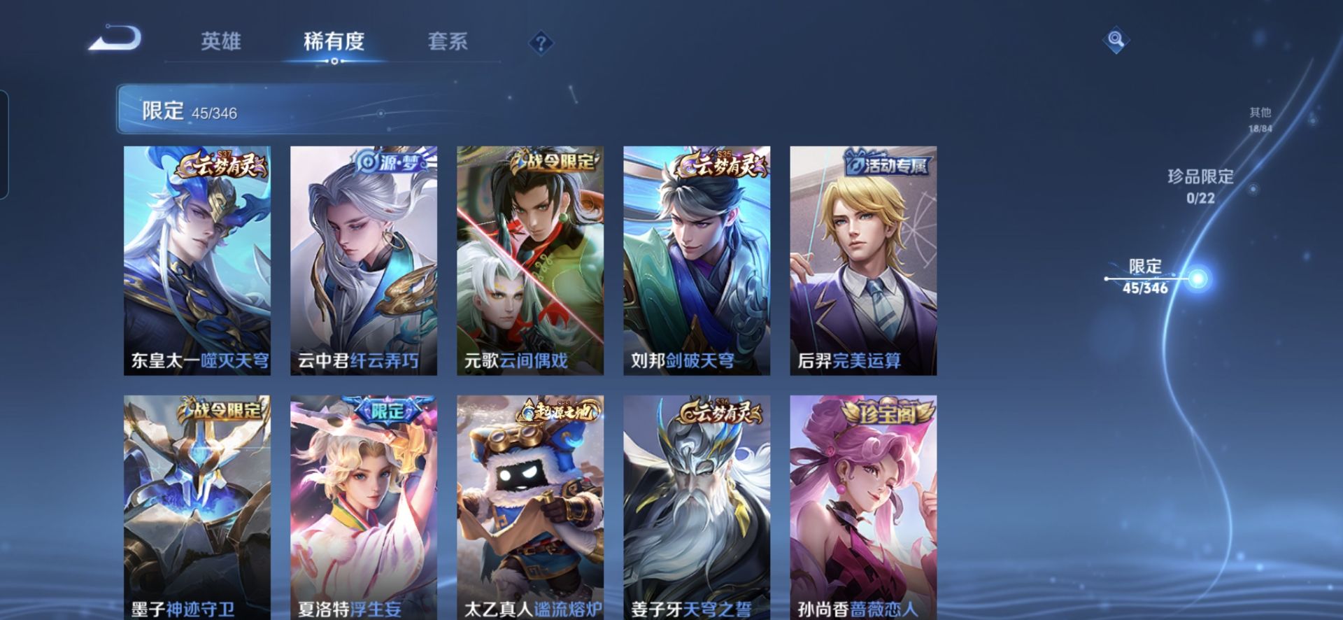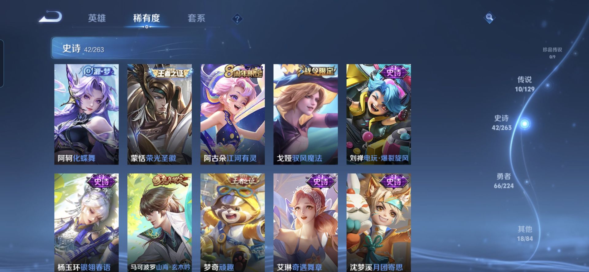 贵族等级:v7皮肤数:136生肖限定4 情人节限定1 传说品质10 英雄数:125