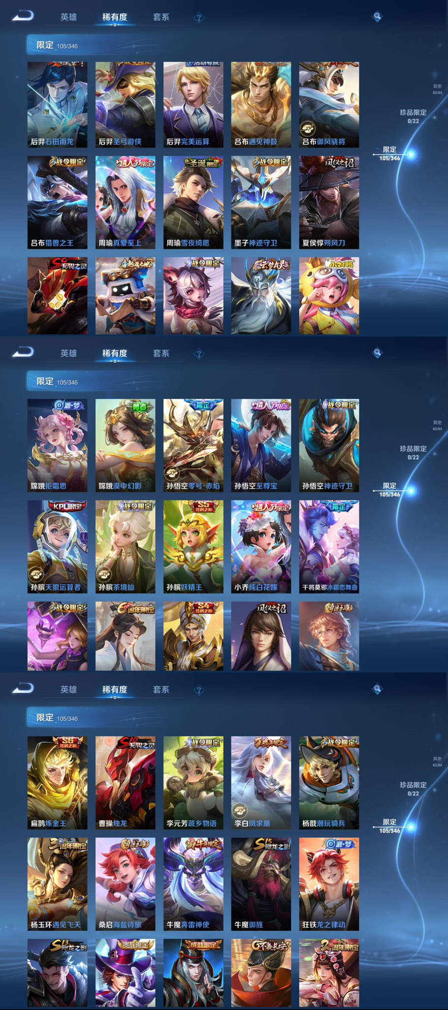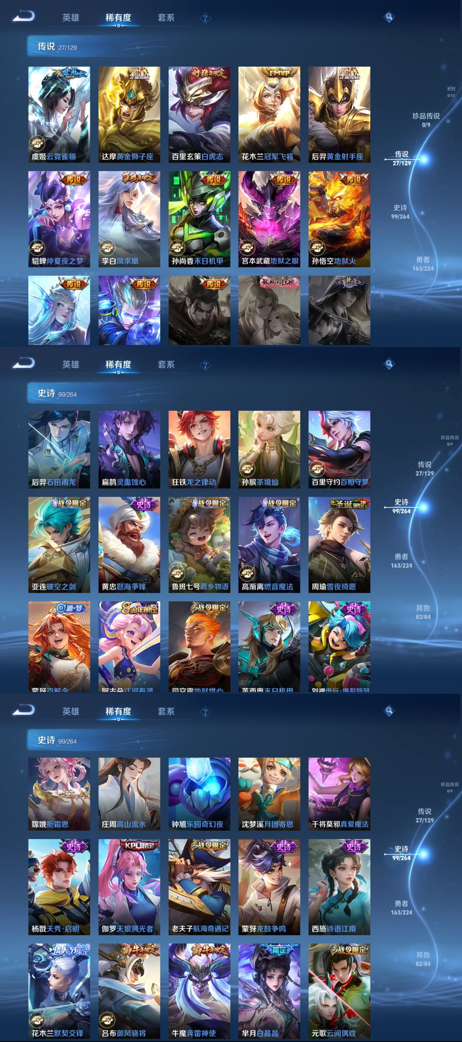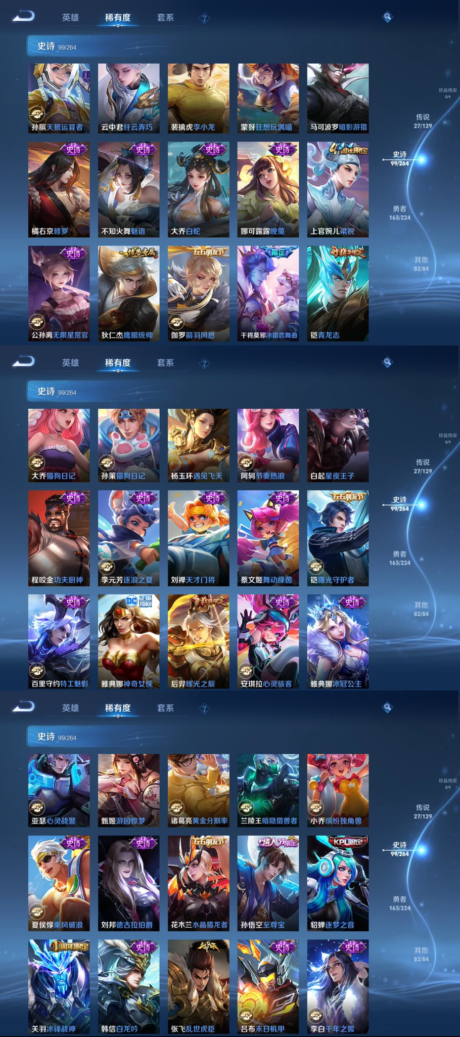 传说品质_后羿_黄金射手座传说品质_艾琳_觅芳踪传说品质_关羽_武圣传说品质_诸葛亮_时雨天司传说品质_兰陵王_默契交锋传说品质_吕布_遇见神鼓传说品质_孙悟空_地狱火传说品质_孙悟空_零号·赤焰传说品质_云缨_幻光神枪传说品质_李白_凤求凰传说品质_武则天_海洋之心传说品质_孙膑_小动物乐团传说品质_干将莫邪_久胜战神传说品质_宫本武藏_地狱之眼传说品质_花木兰_冠军飞将传说品质_镜_炽阳神光传说品质_公孙离_祈雪灵祝传说品质_貂蝉_仲夏夜之梦传说品质_李信_一念神魔传说品质_孙尚香_末日机甲传说品质_曜_云鹰飞将传说品质_达摩_黄金狮子座传说品质_狄仁杰_超时空战士传说品质_虞姬_云霓雀翎传说品质_虞姬_启明星使传说品质_百里玄策_白虎志传说品质_赵云_淬星耀世