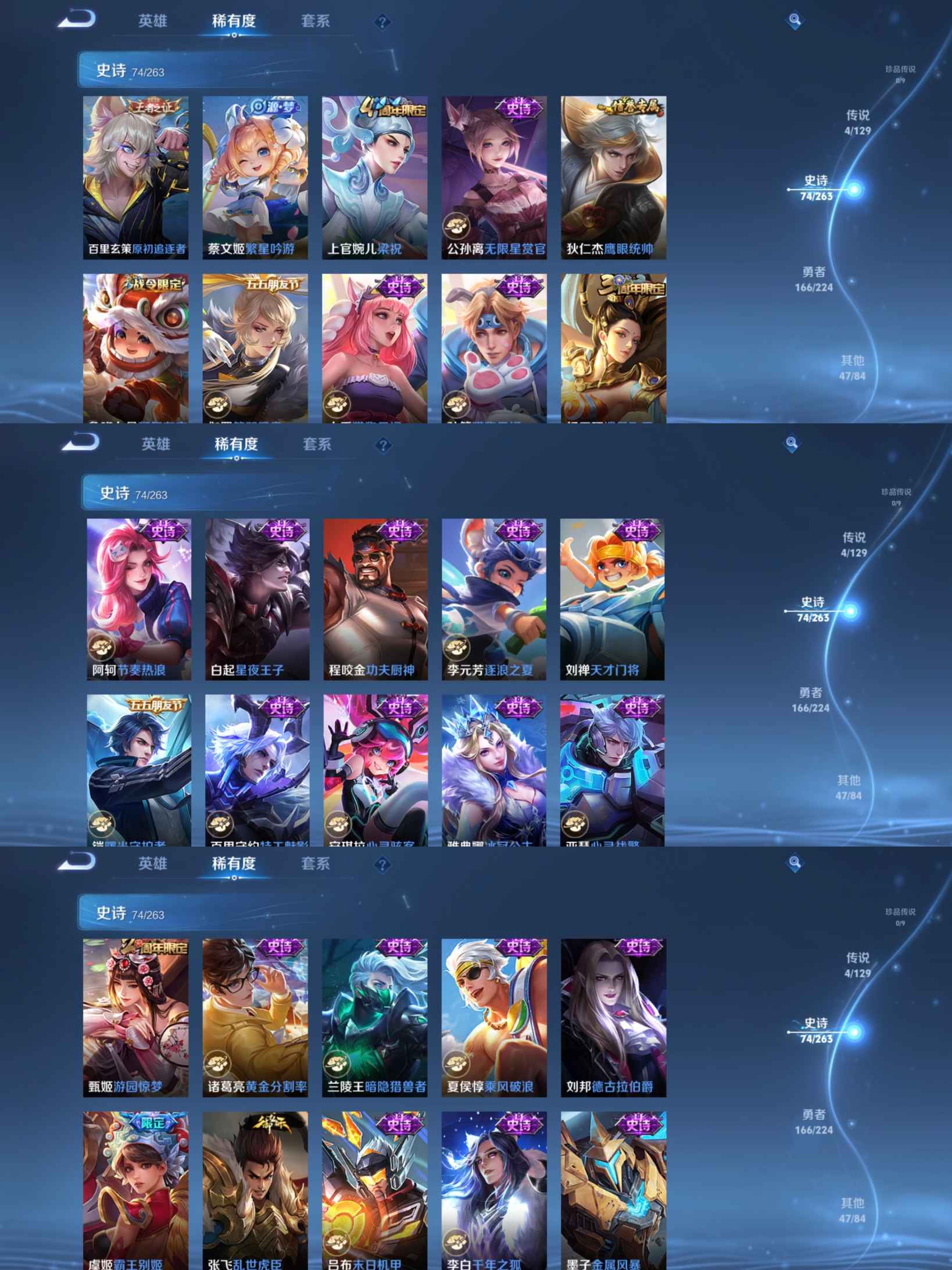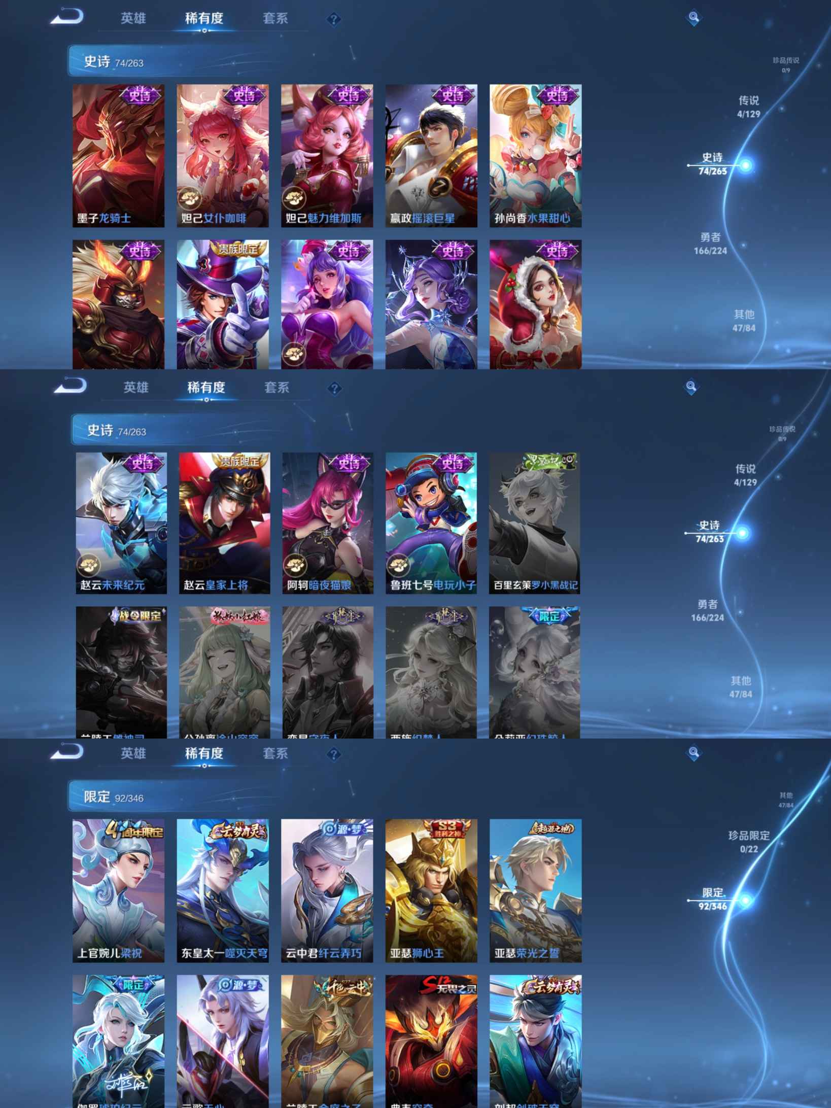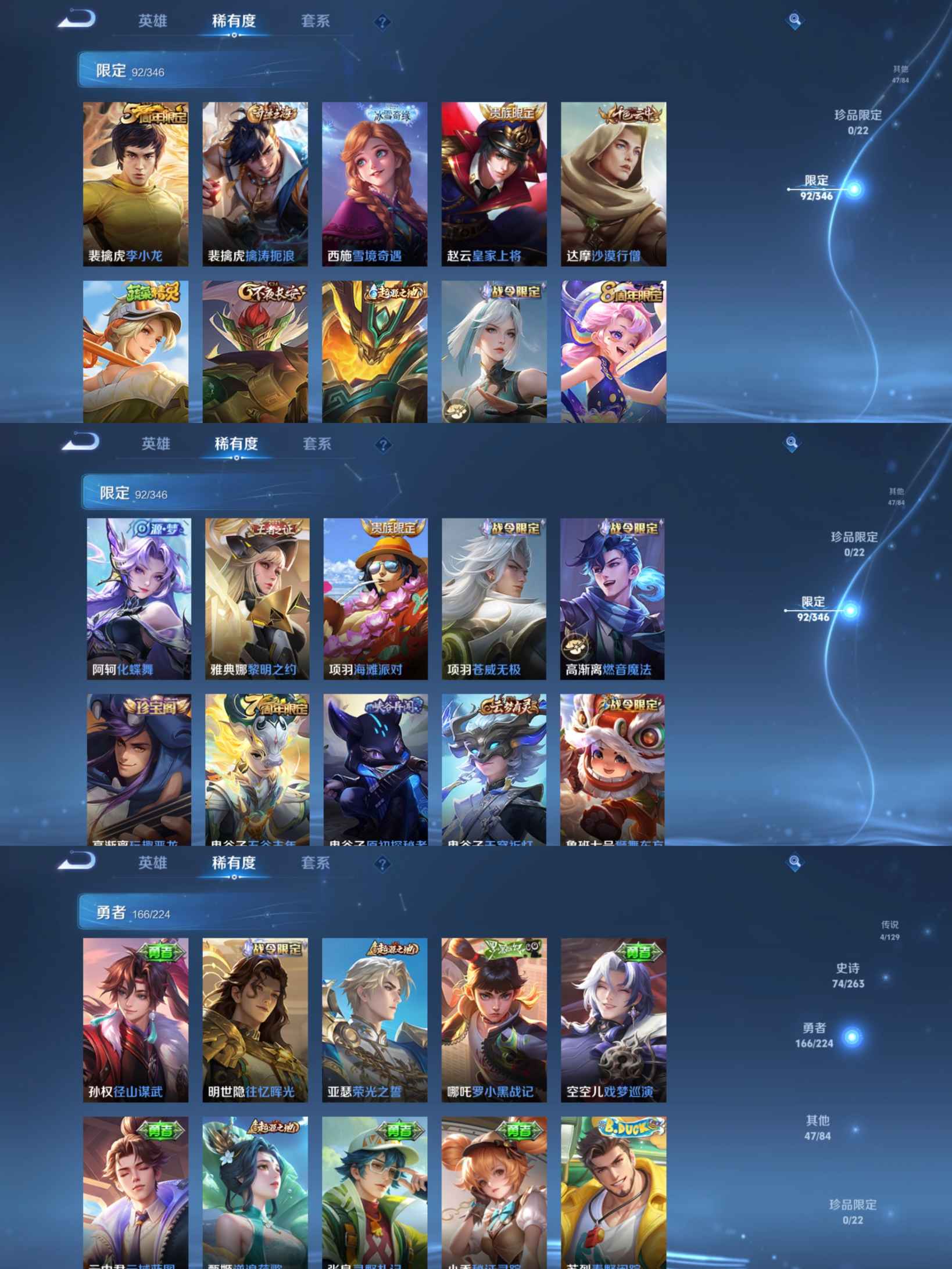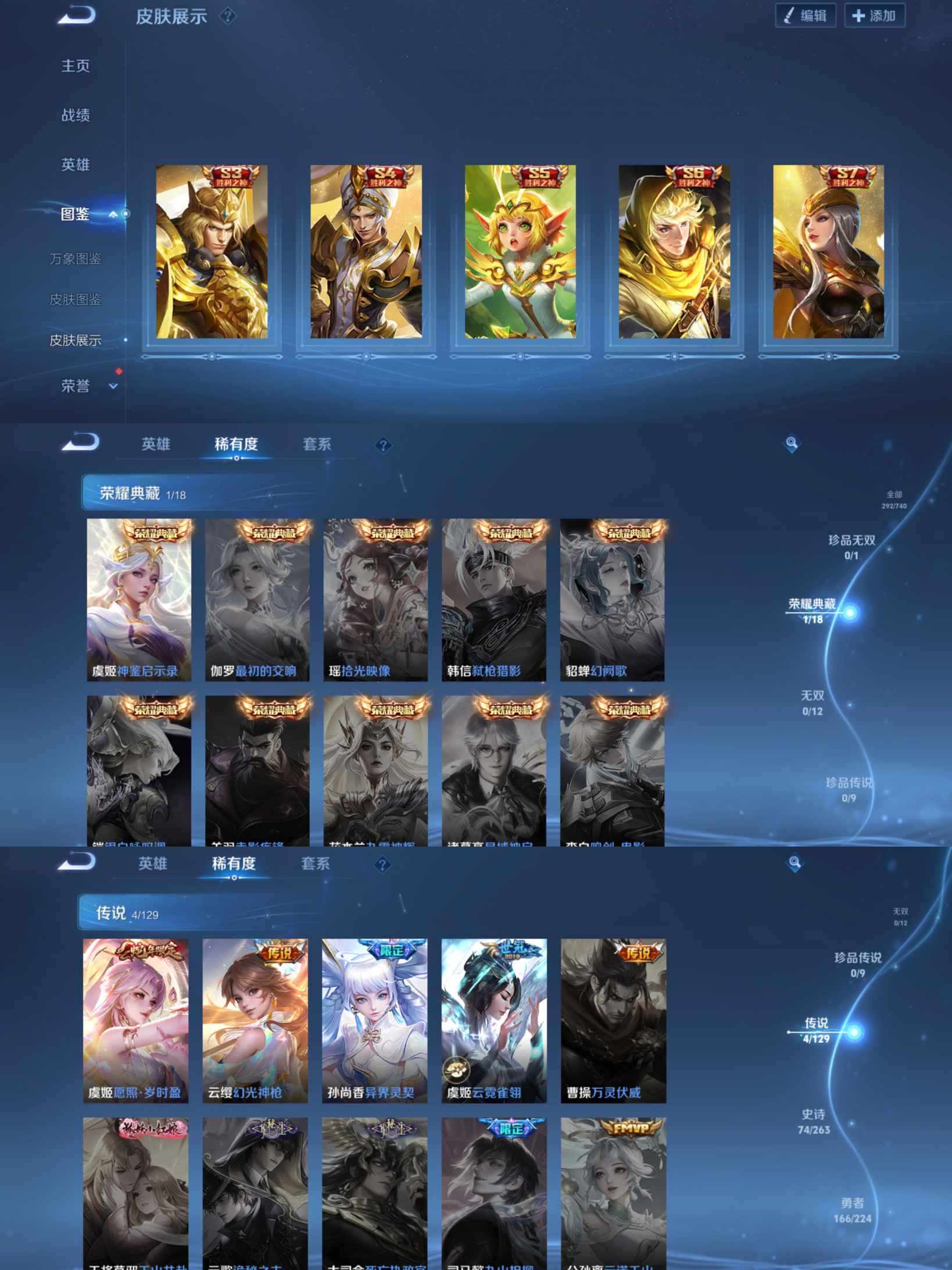 贵族等级:v7皮肤数:293传说品质4 荣耀典藏1 生肖限定1 英雄数:127