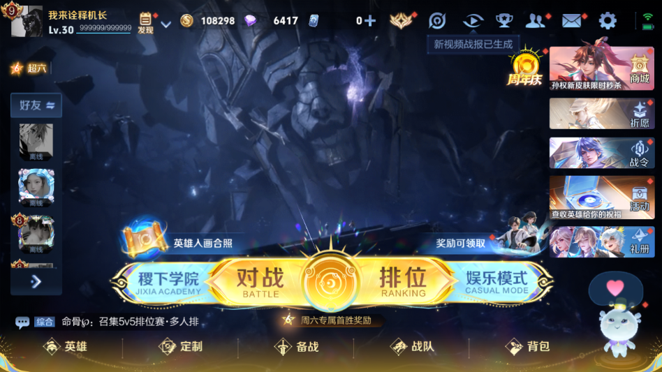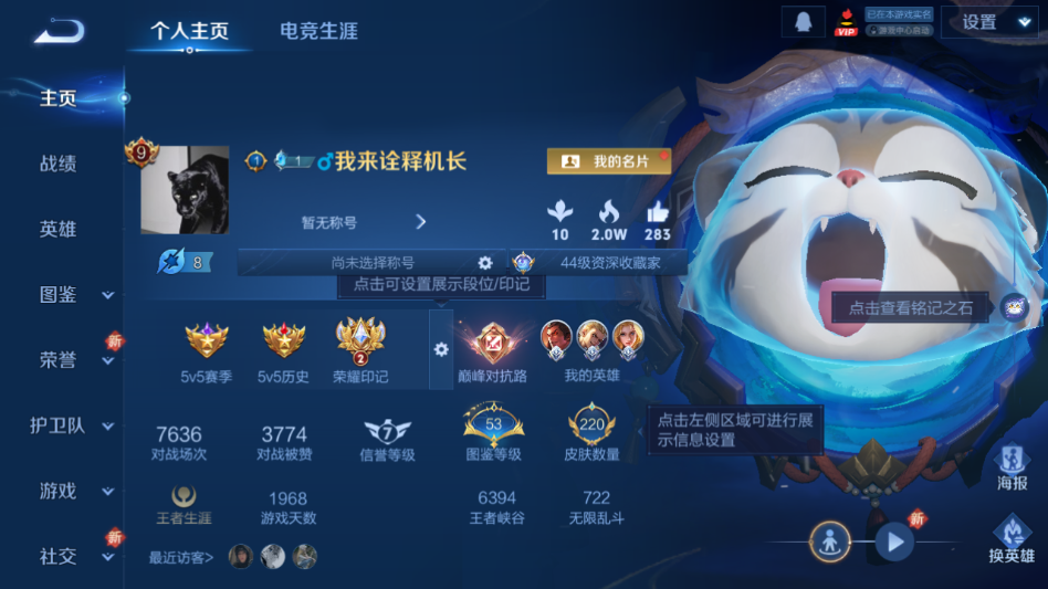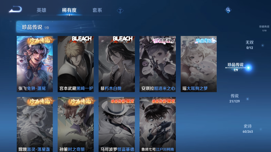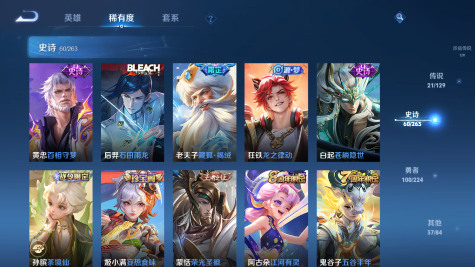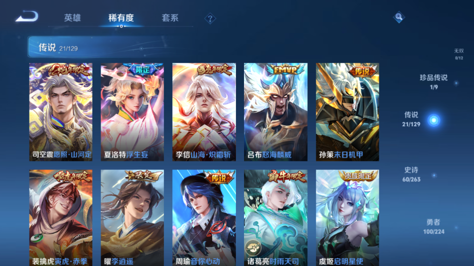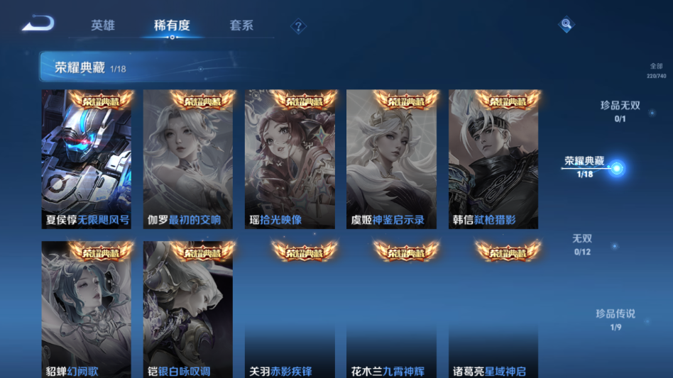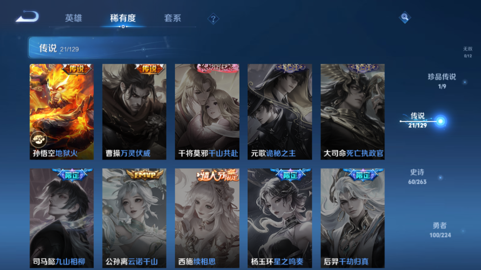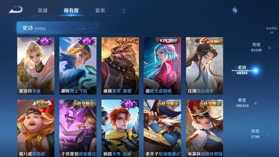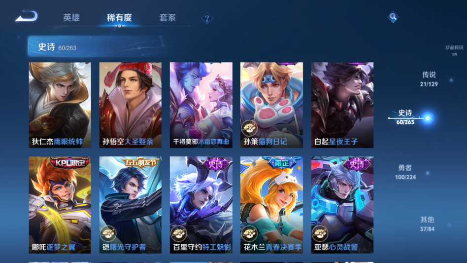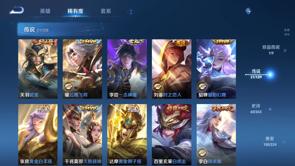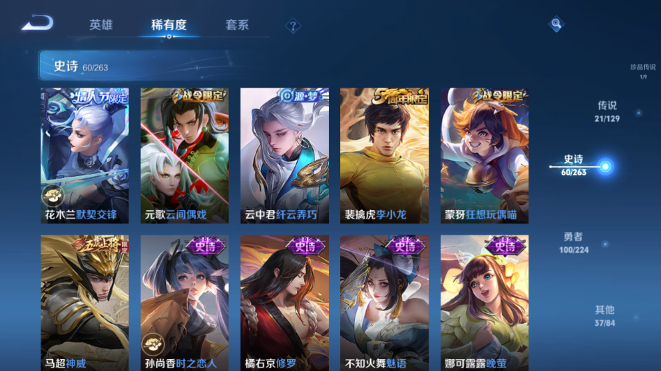 贵族等级:v9皮肤数:220传说品质21 生肖限定7 情人节限定2 珍品传说1 荣耀典藏1 英雄数:125