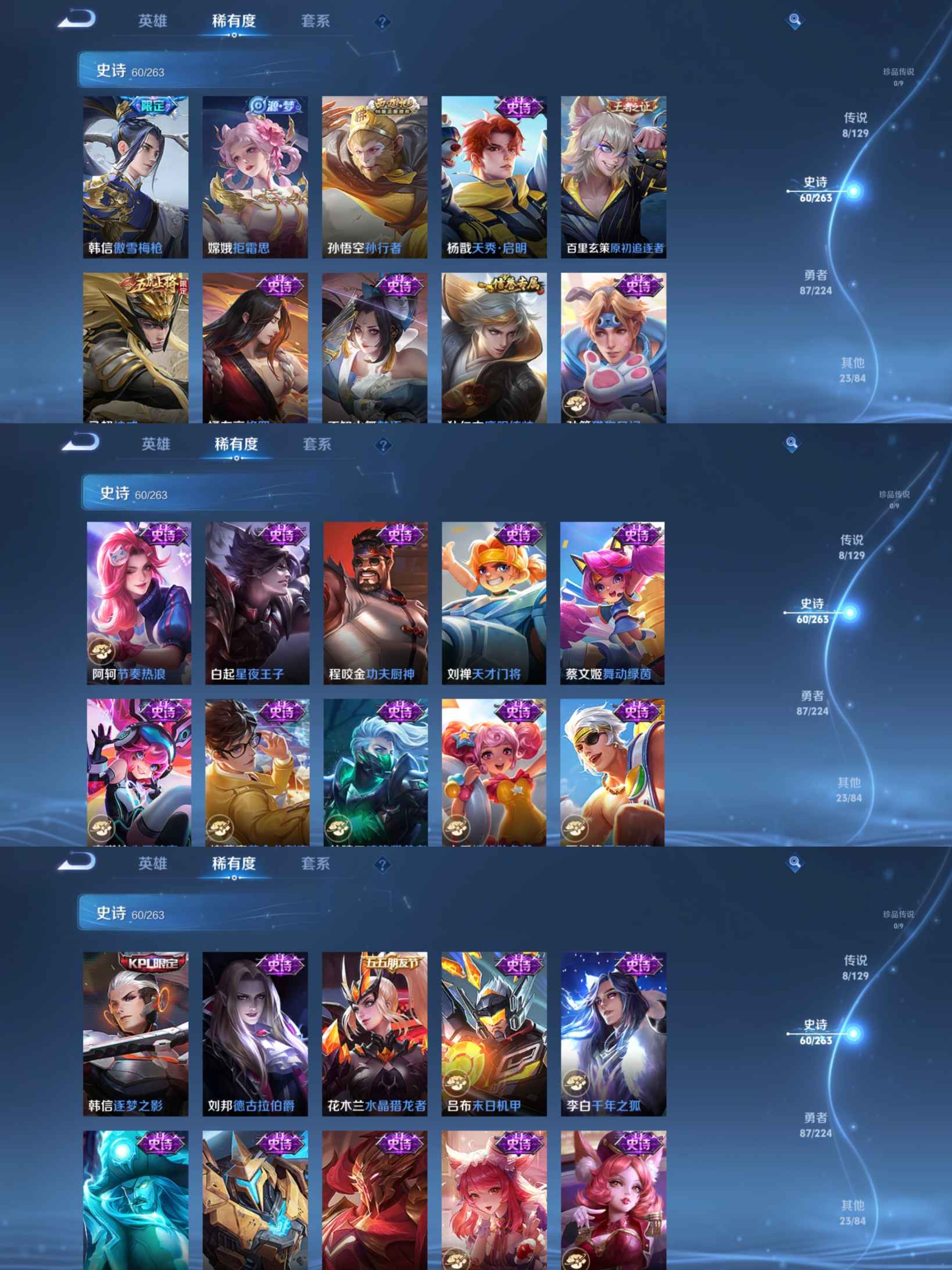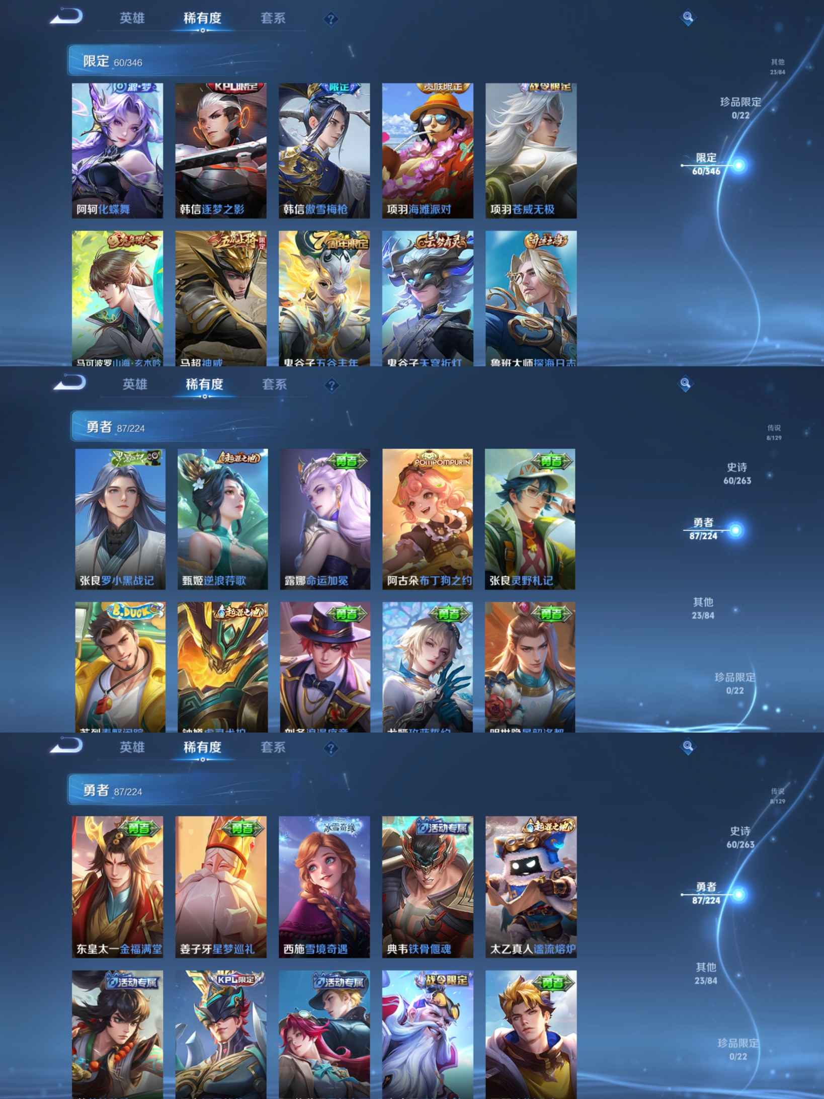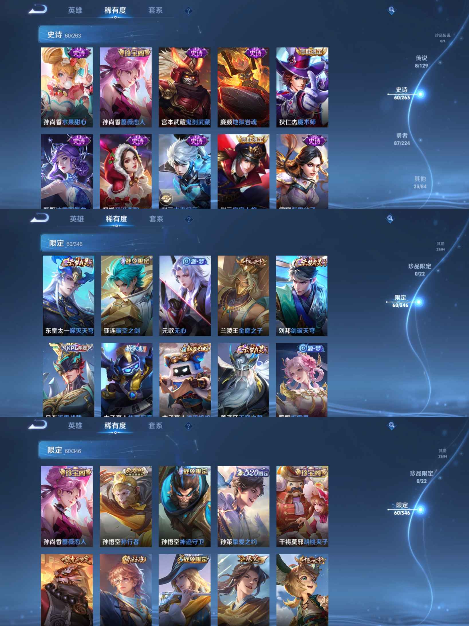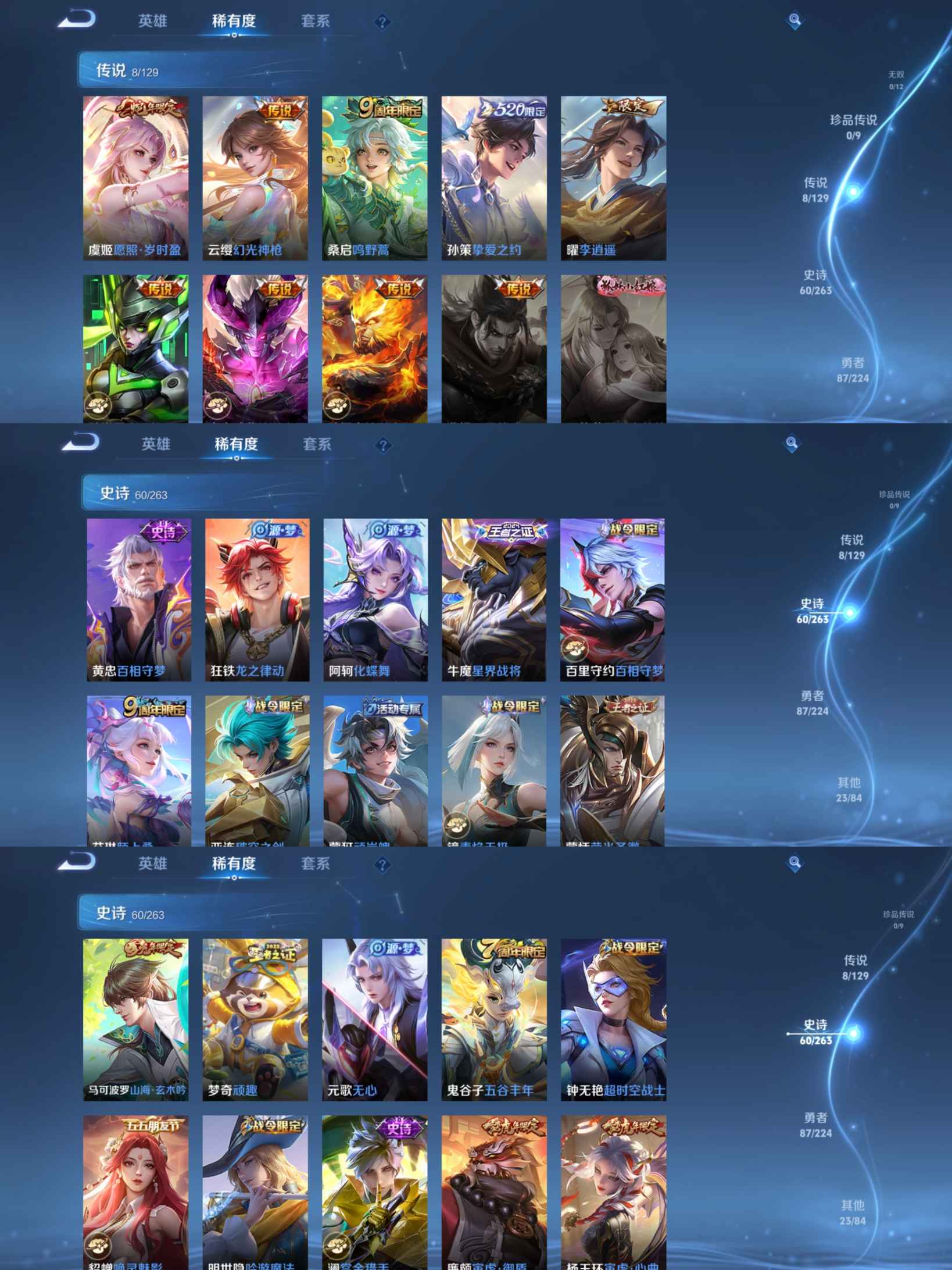贵族等级:v7皮肤数:179生肖限定4 传说品质8 荣耀典藏1 英雄数:124