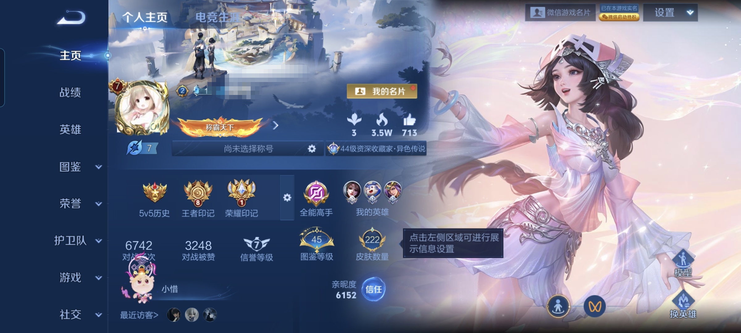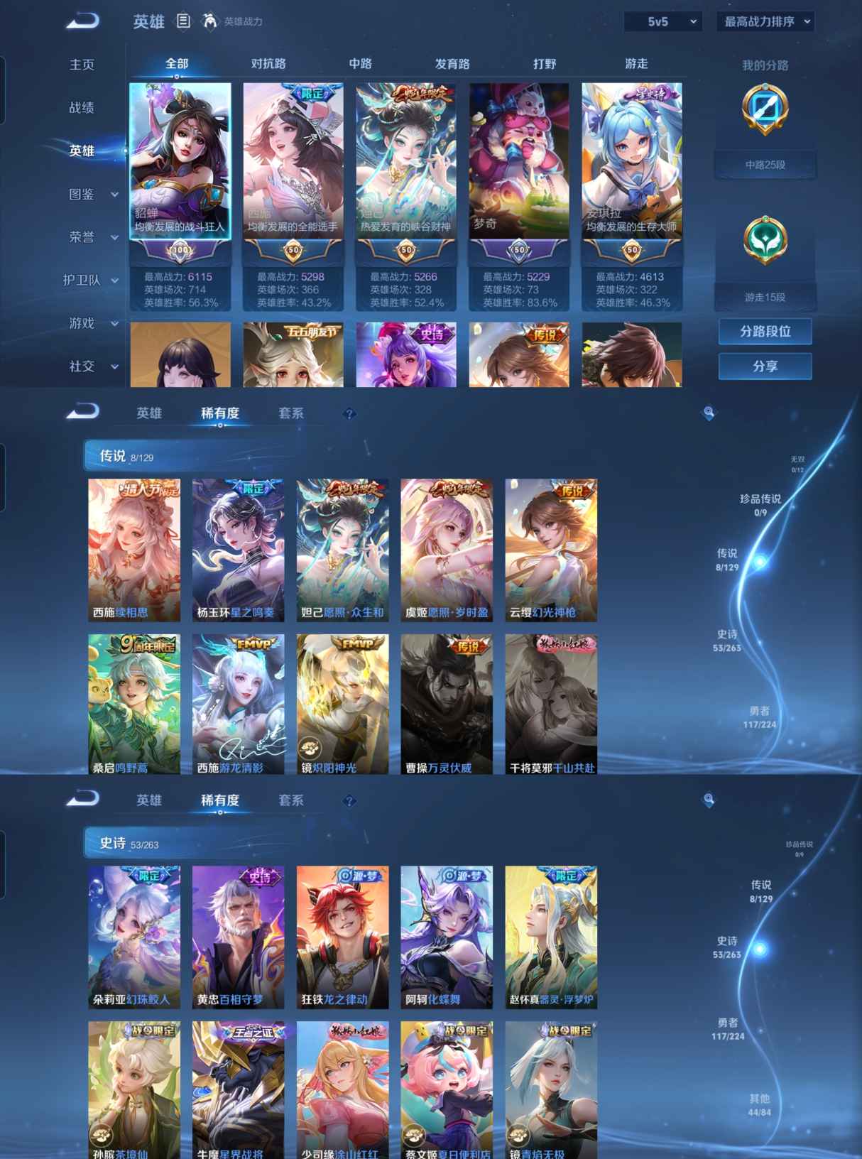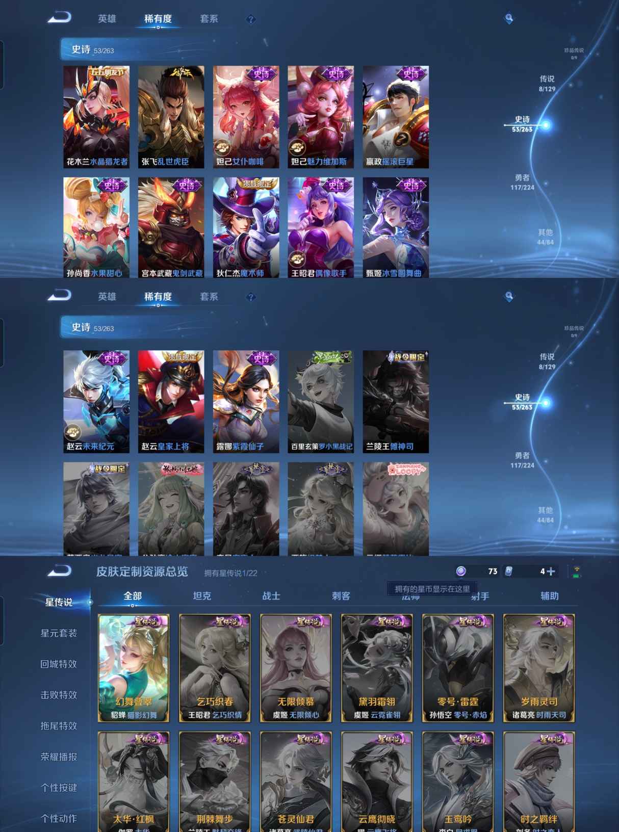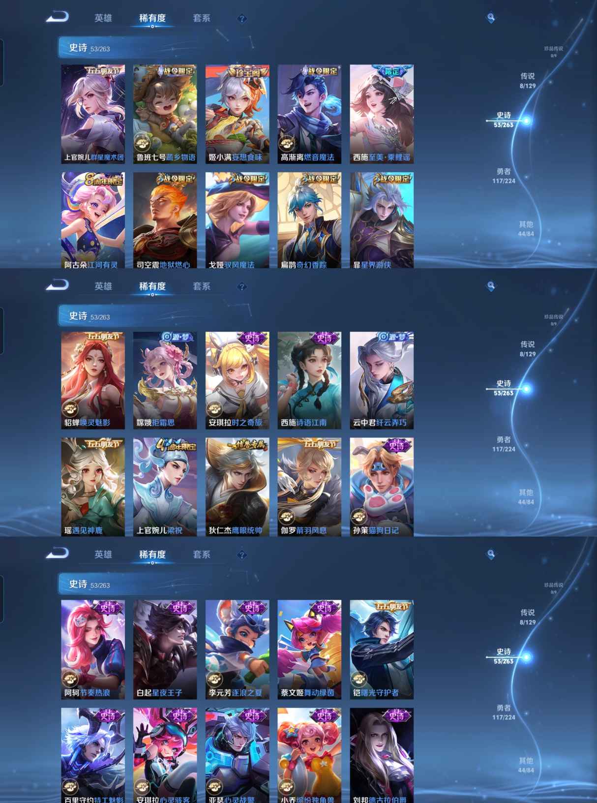 贵族等级:v7皮肤数:222传说品质8 生肖限定2 情人节限定1 英雄数:123