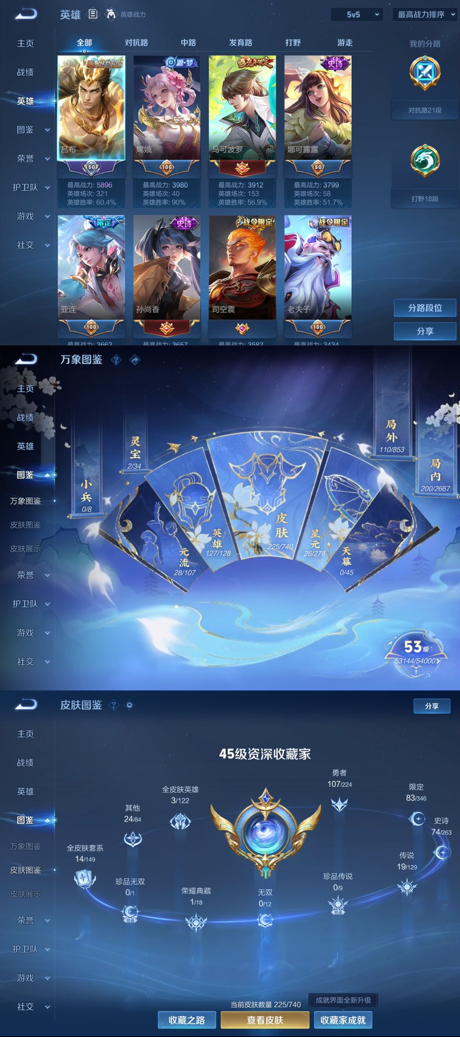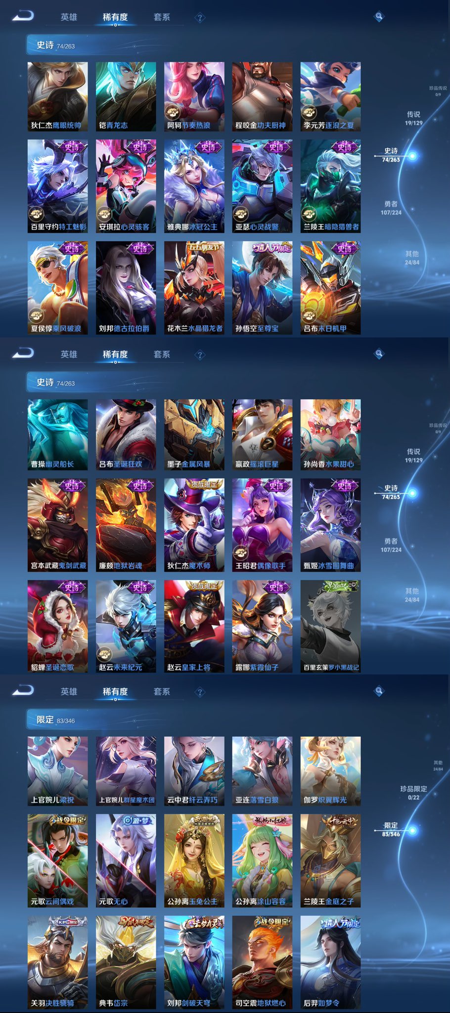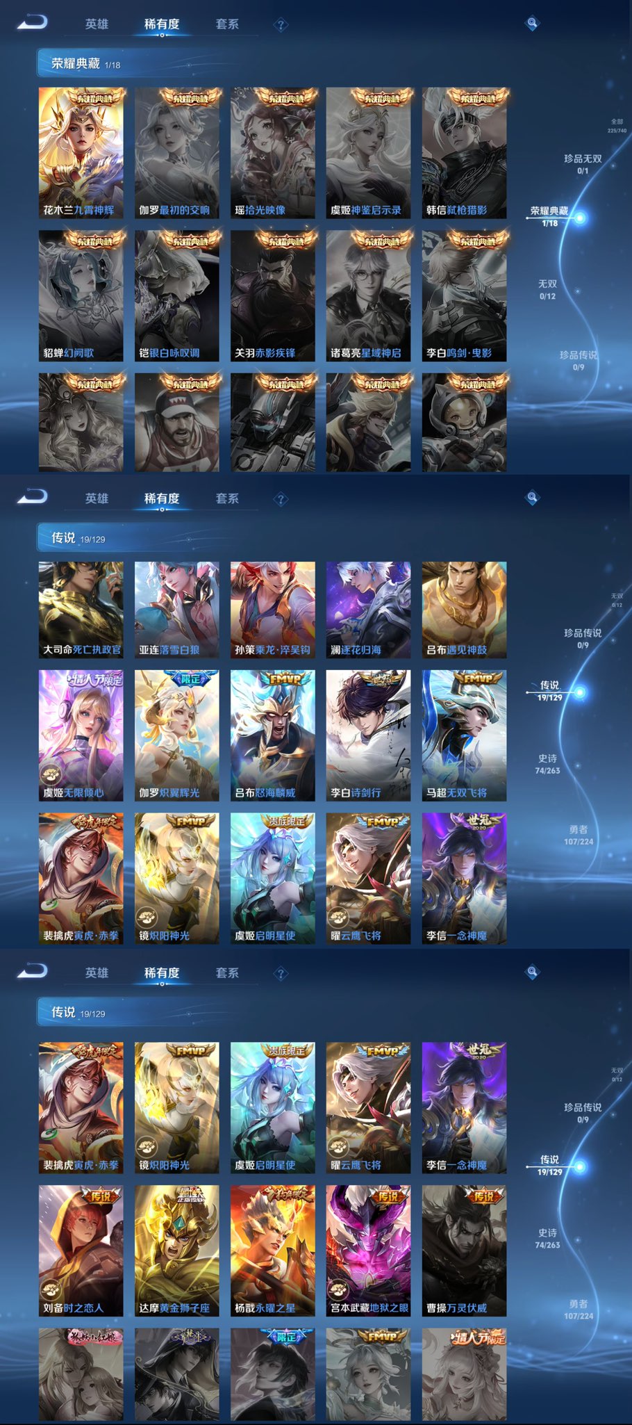 贵族等级:v8皮肤数:225情人节限定3 传说品质19 生肖限定6 荣耀典藏1 英雄数:127