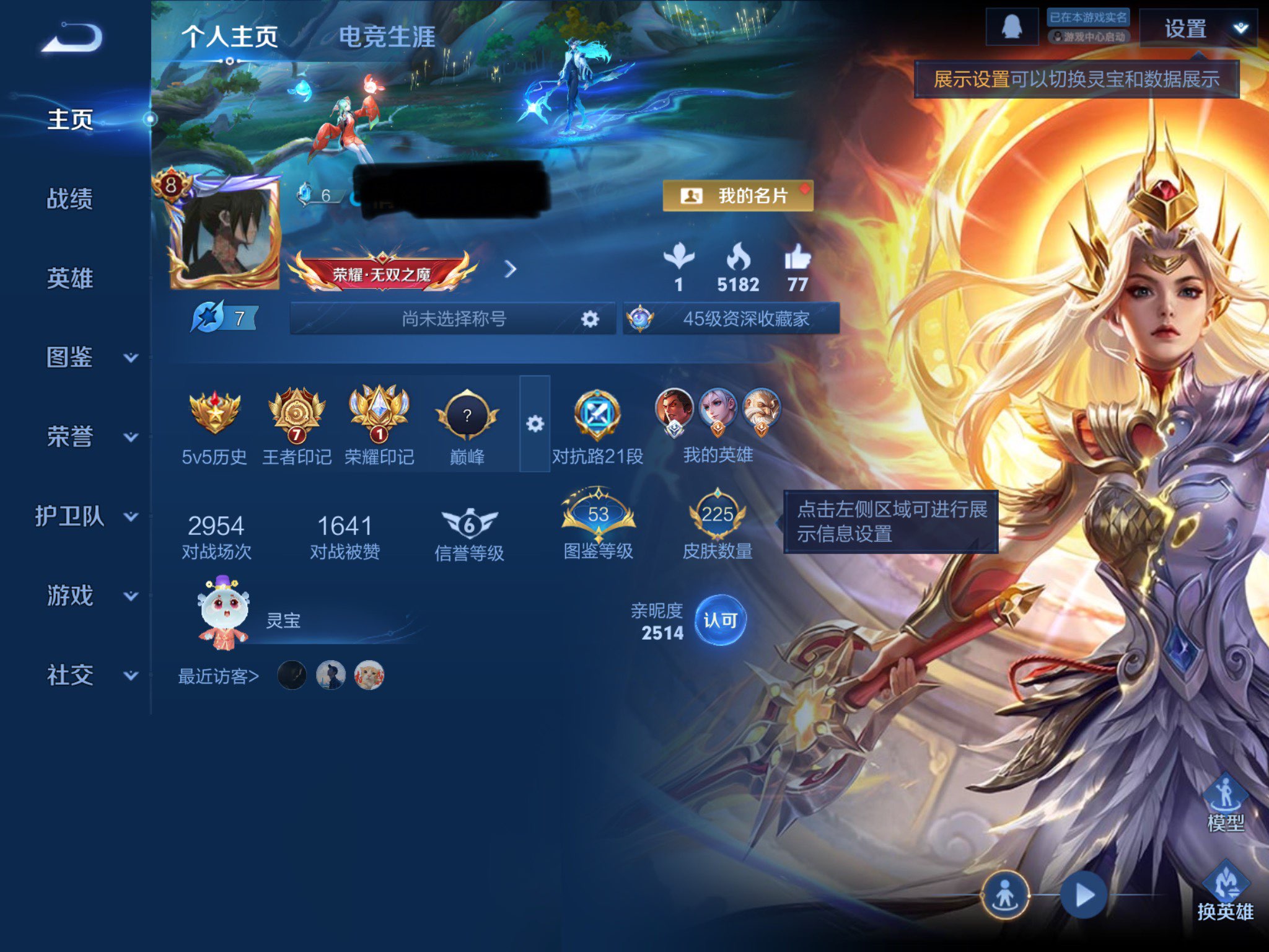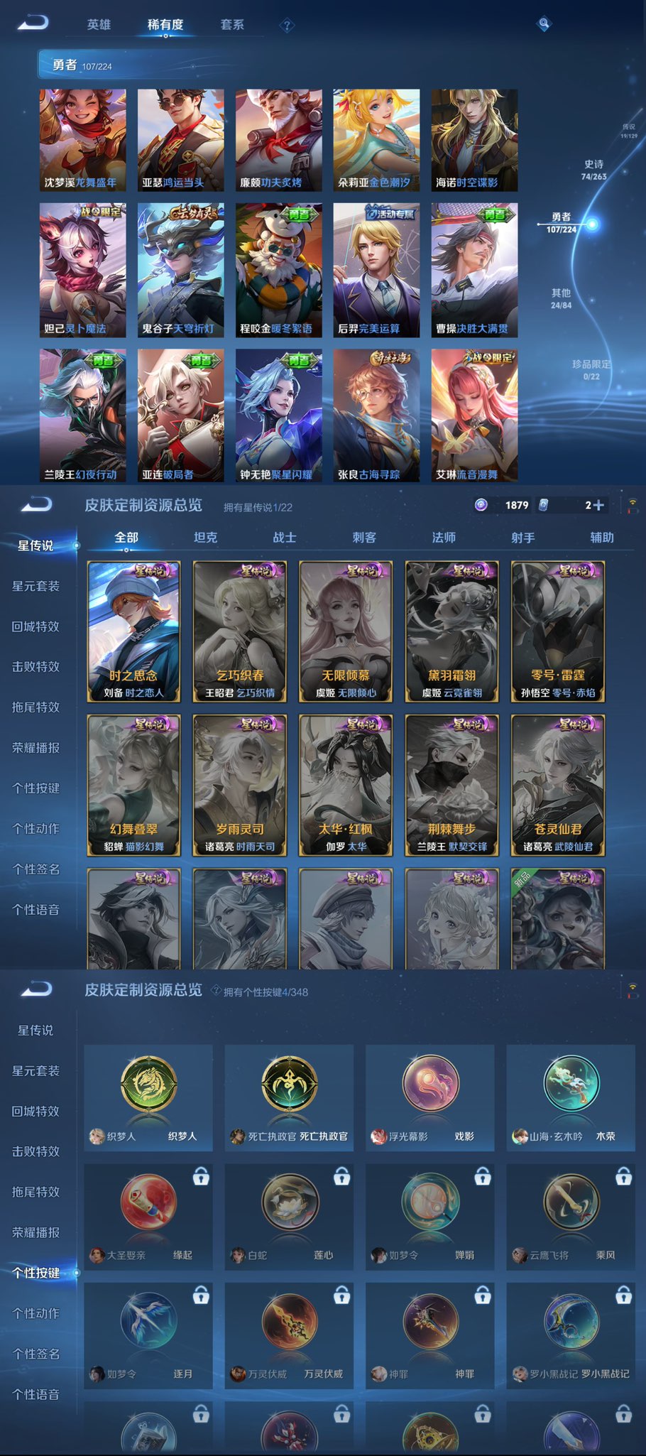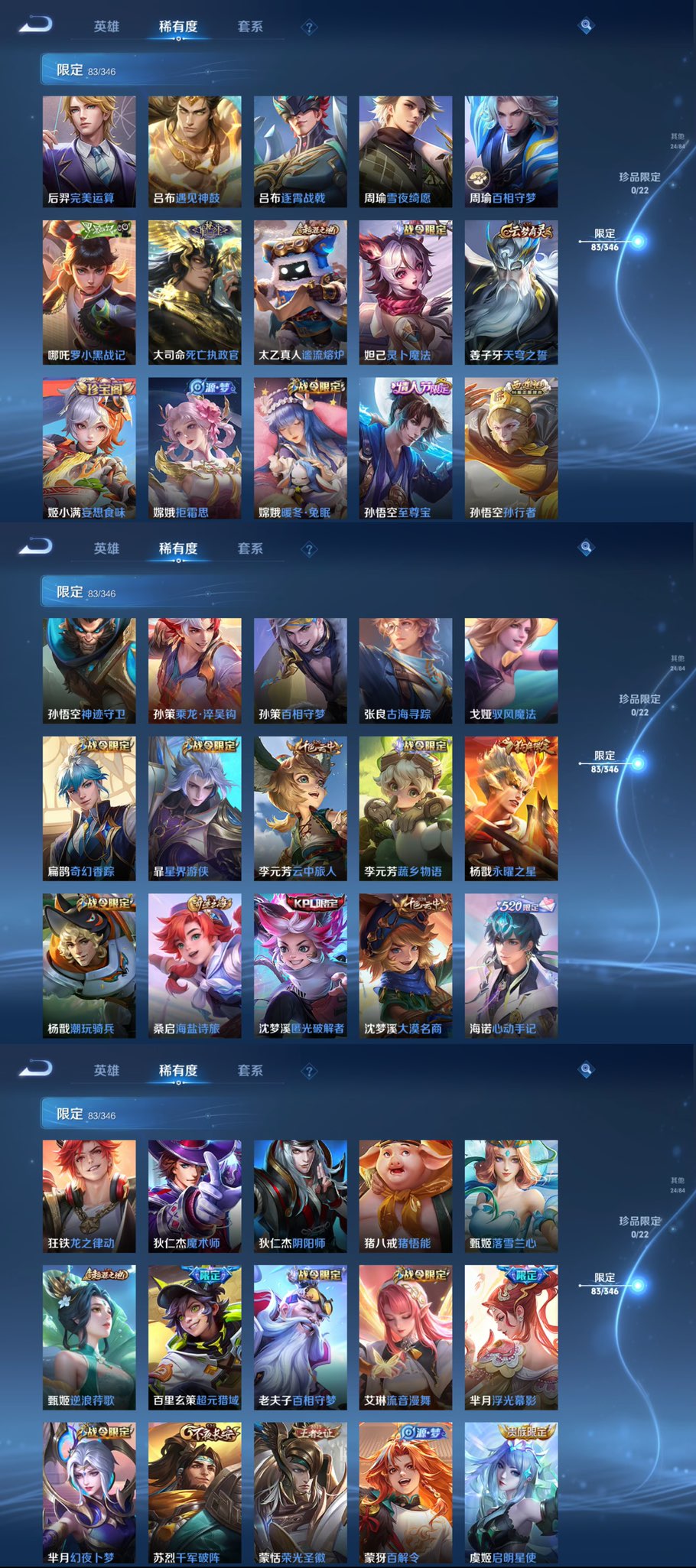 贵族等级:v8皮肤数:225情人节限定3 传说品质19 生肖限定6 荣耀典藏1 英雄数:127