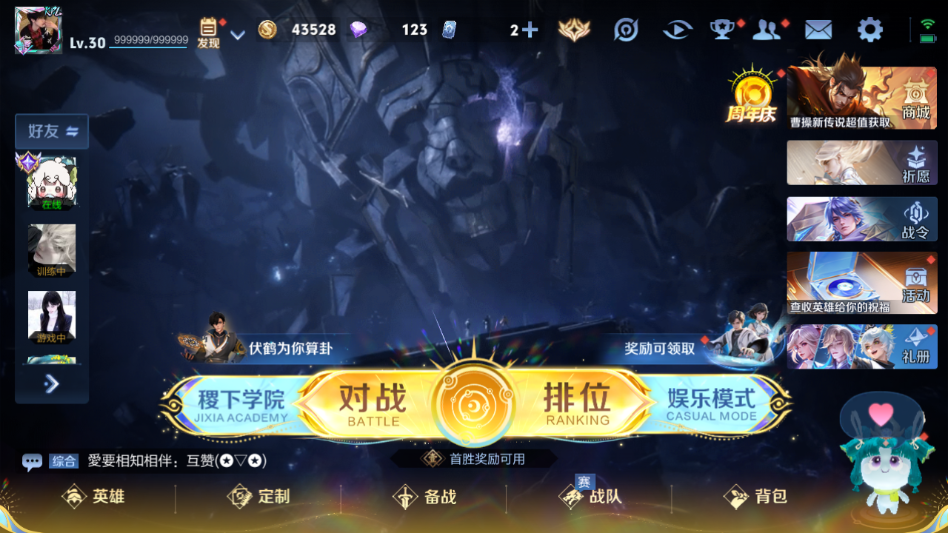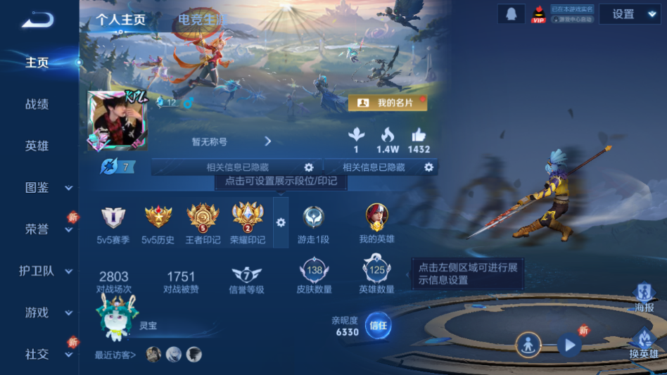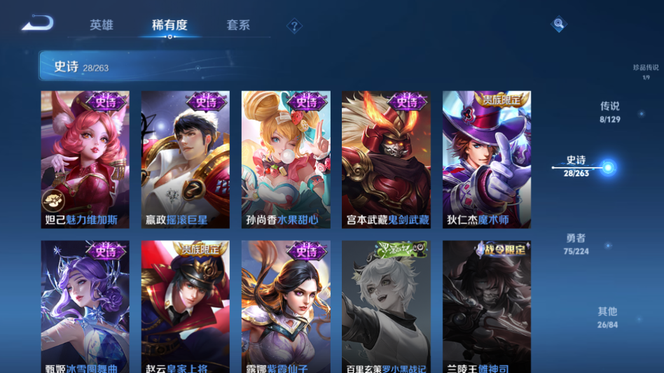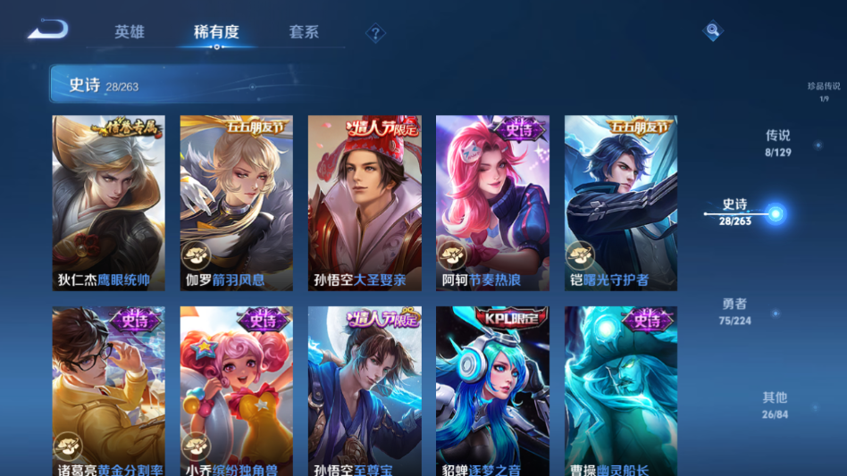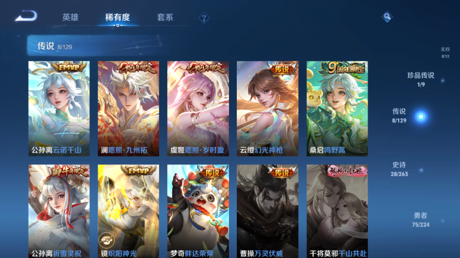 贵族等级:v7皮肤数:138传说品质8 生肖限定3 珍品传说1 情人节限定2 英雄数:125