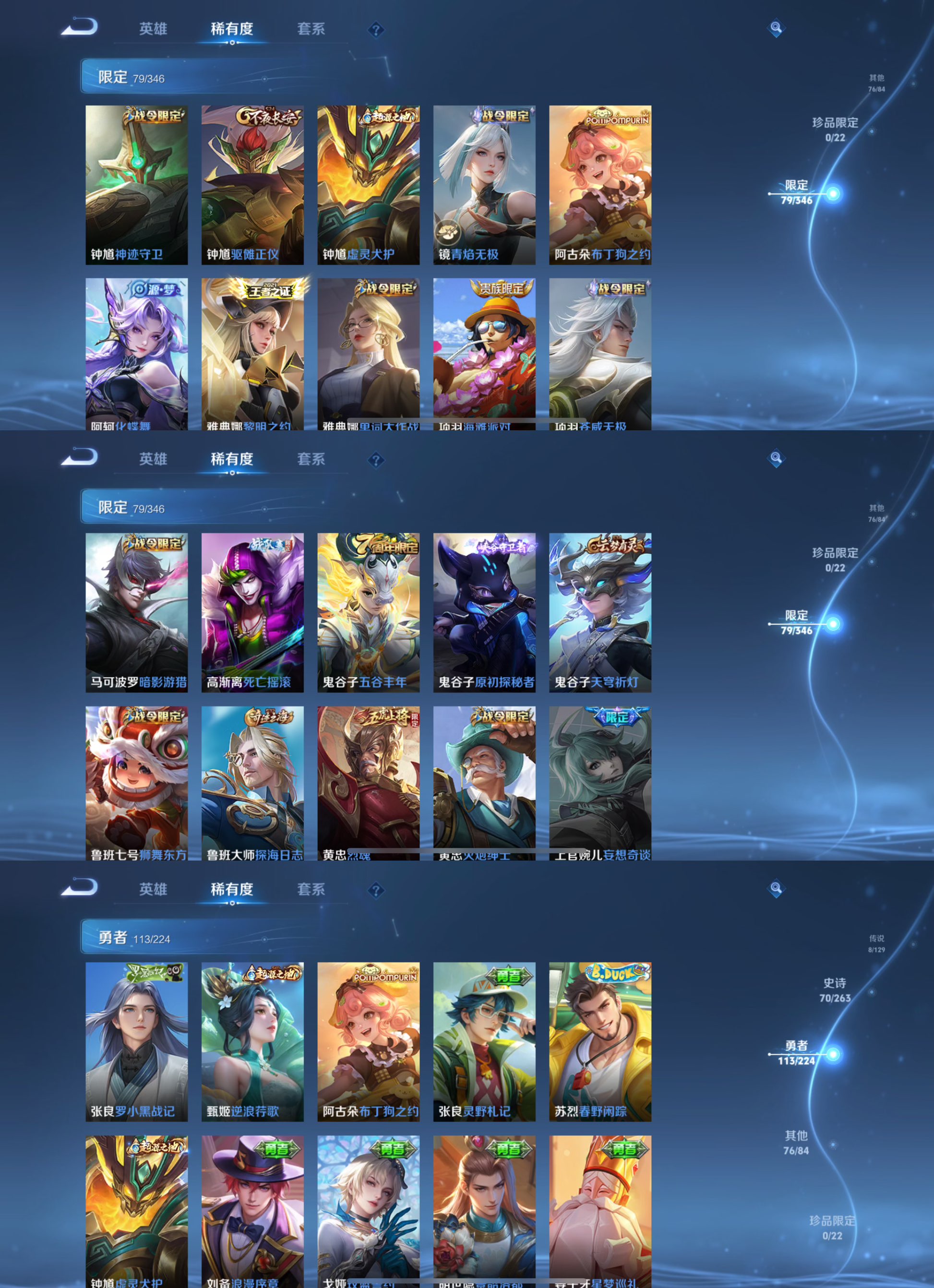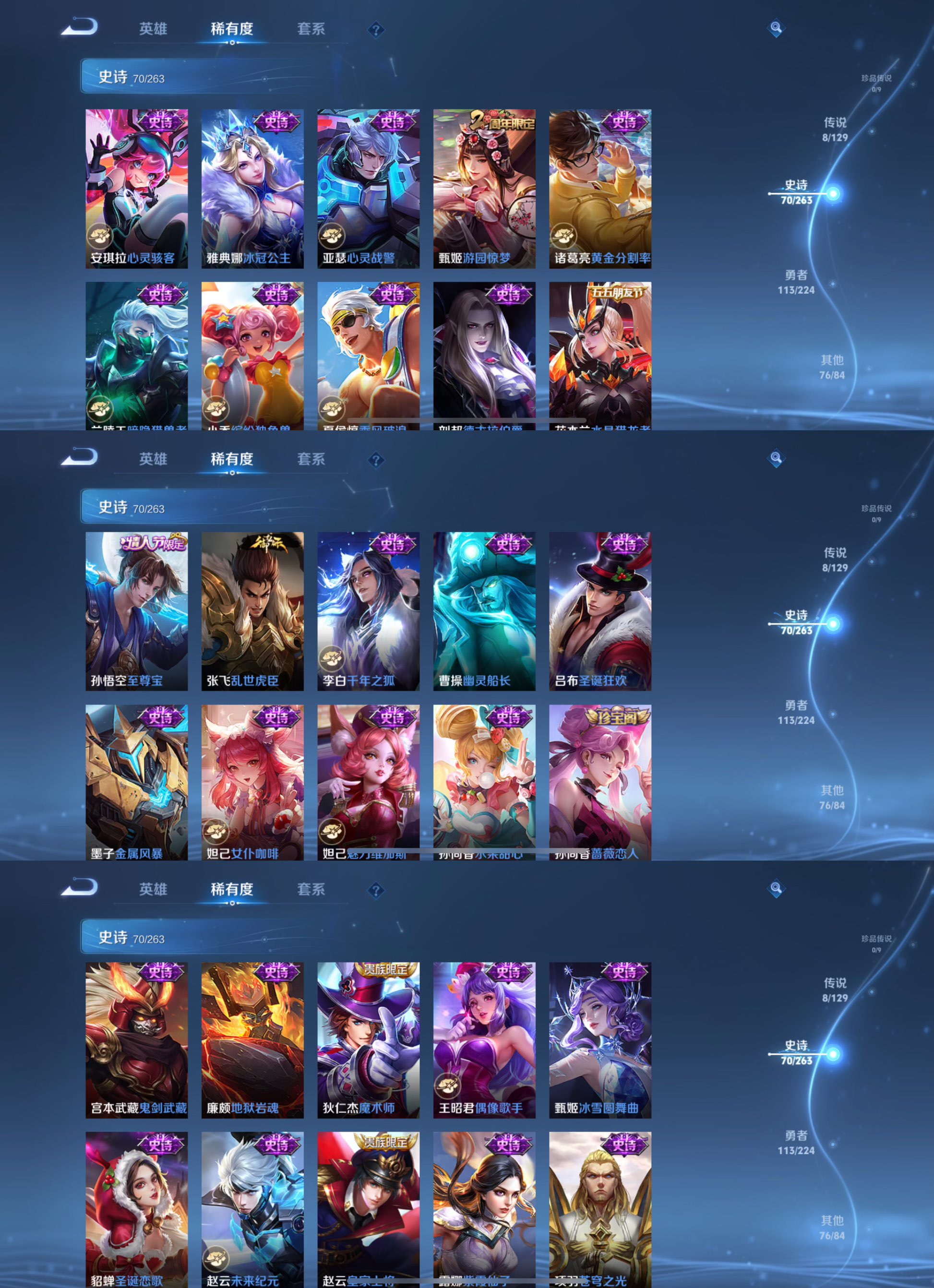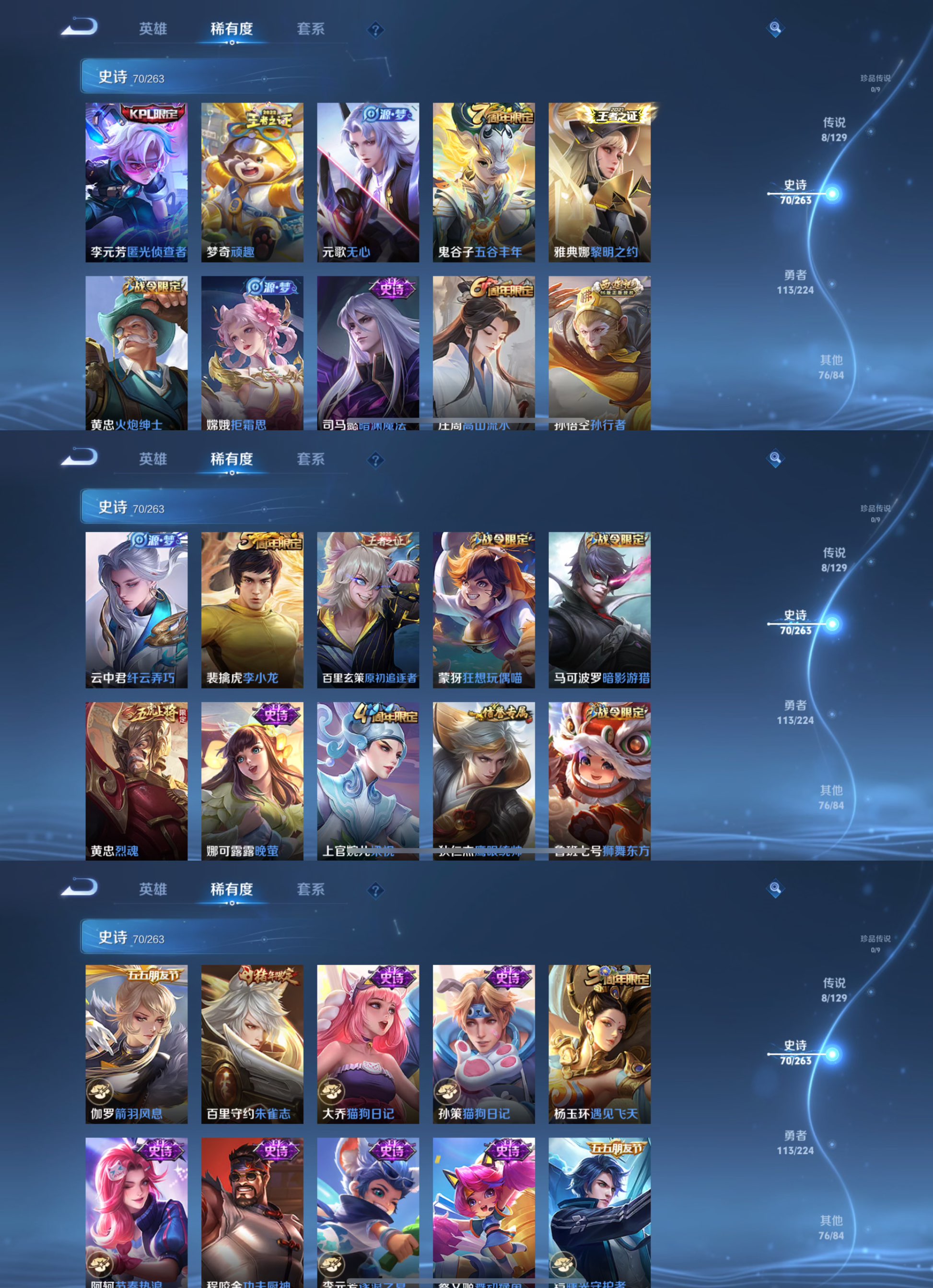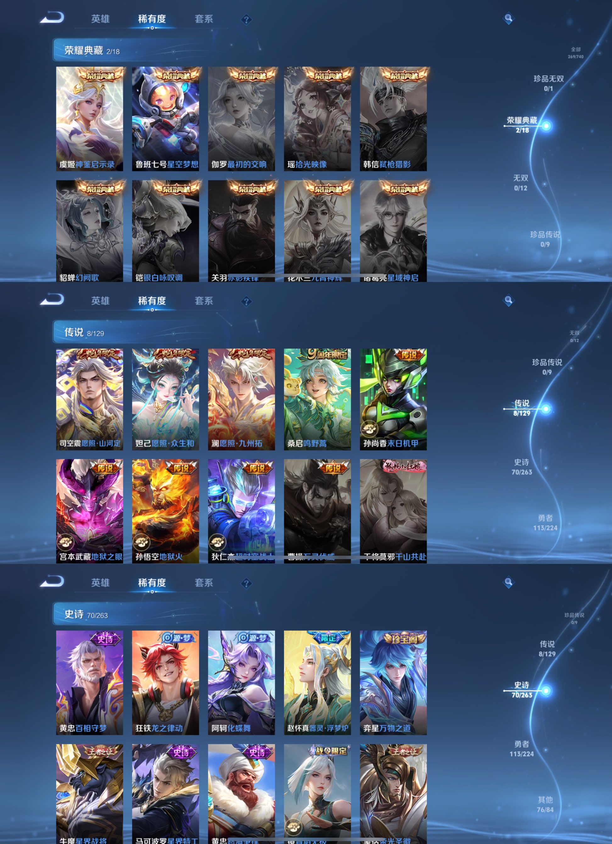 贵族等级:v7皮肤数:269传说品质8 生肖限定4 情人节限定1 荣耀典藏2 英雄数:127