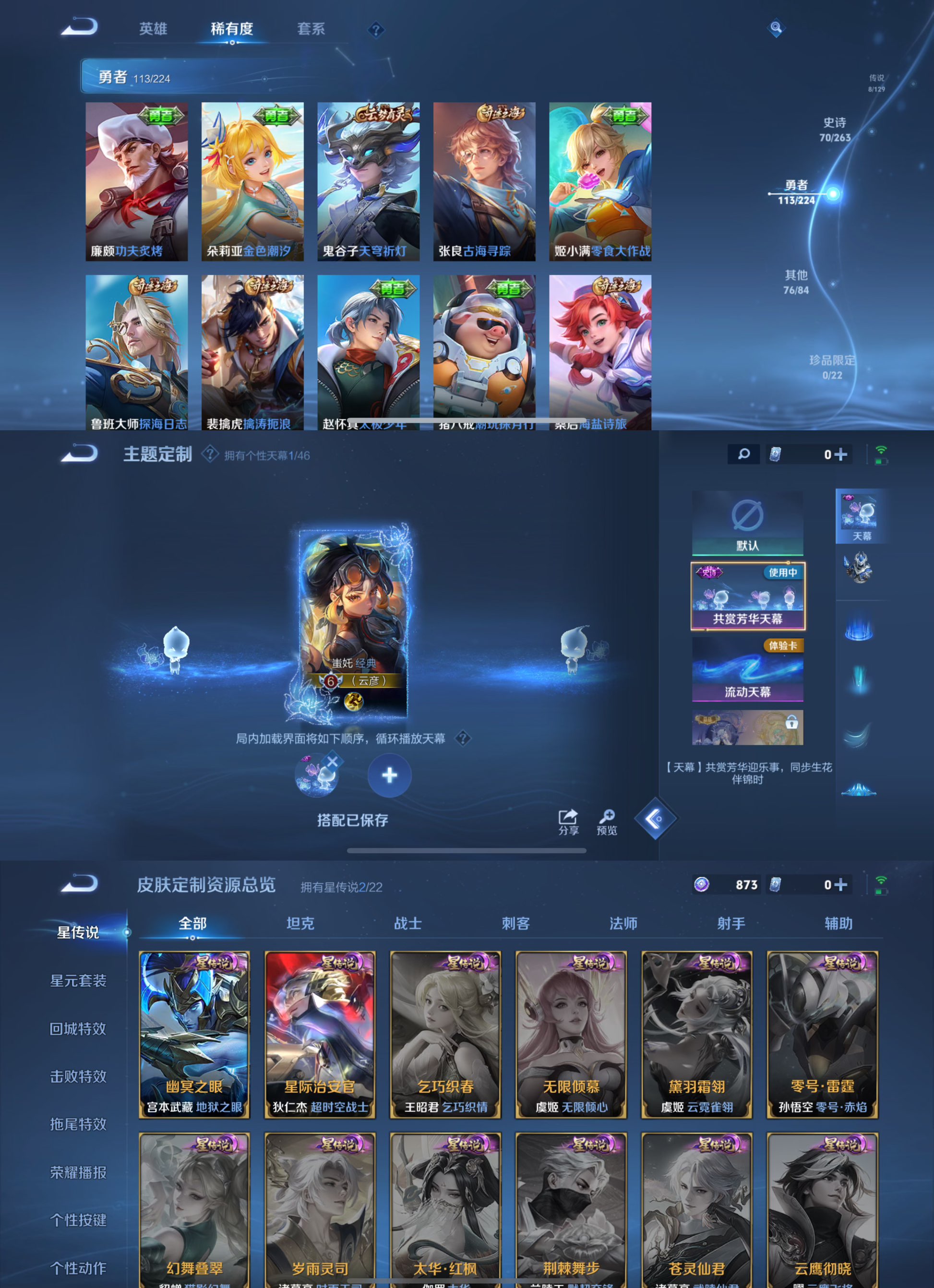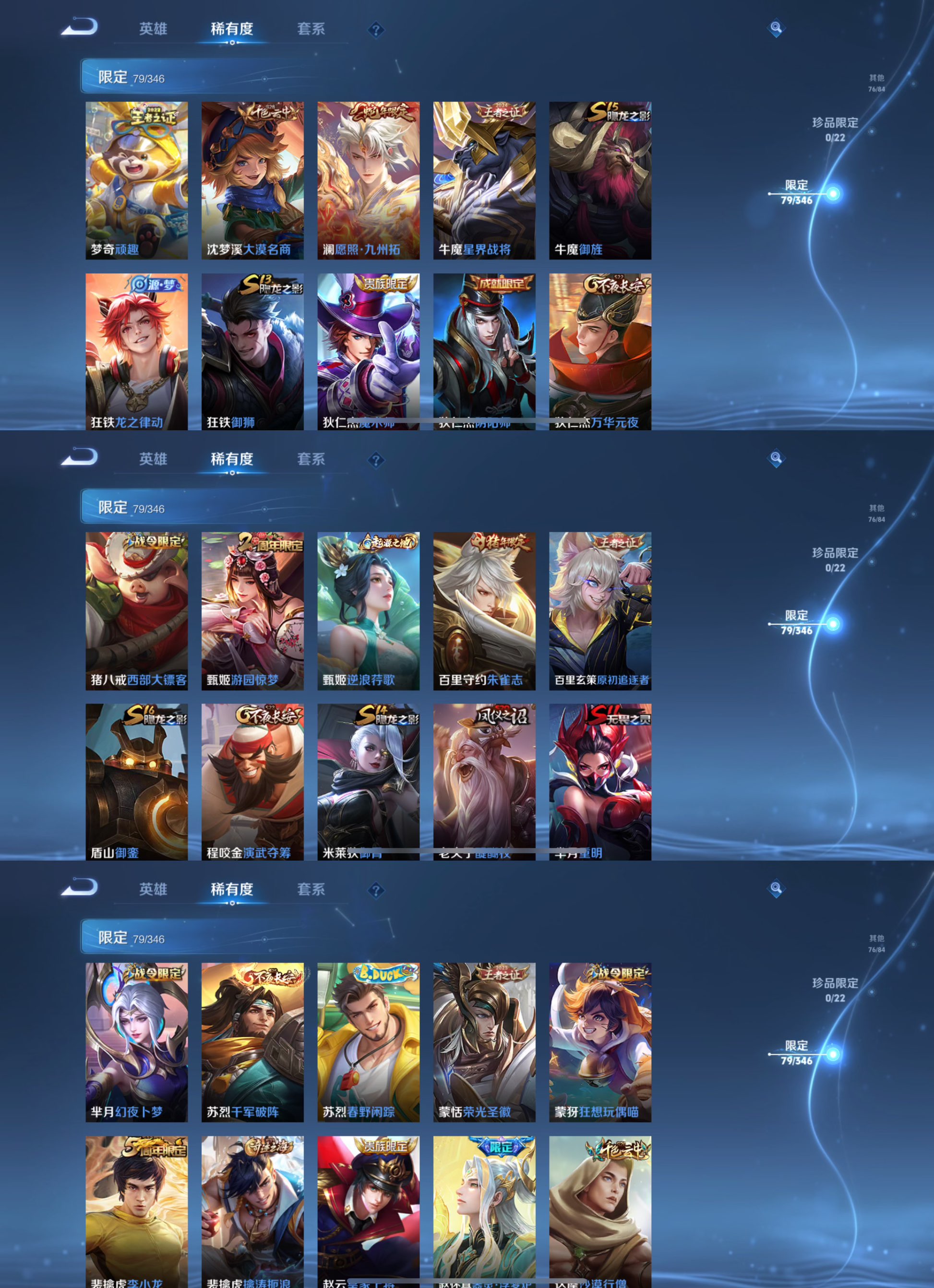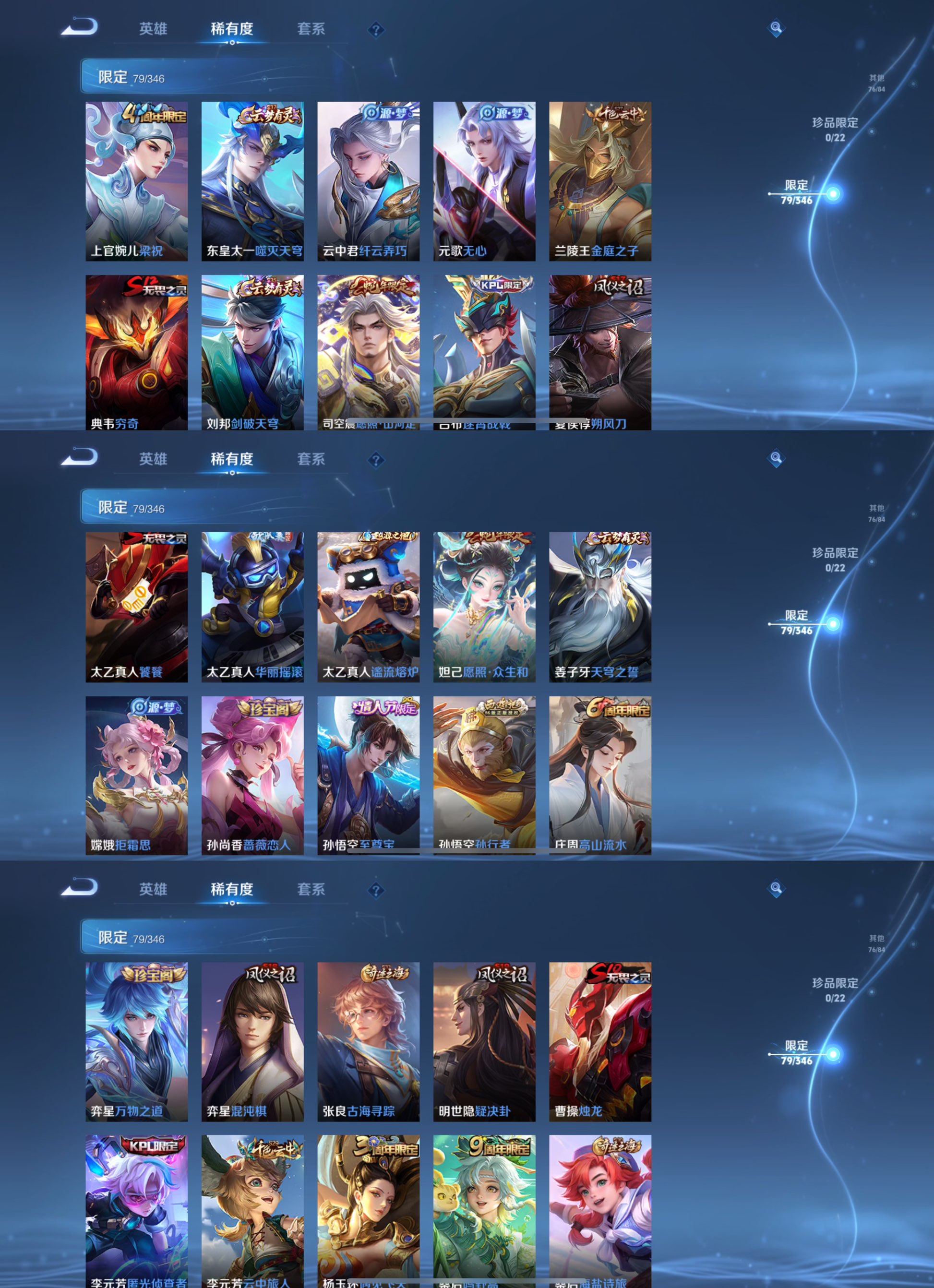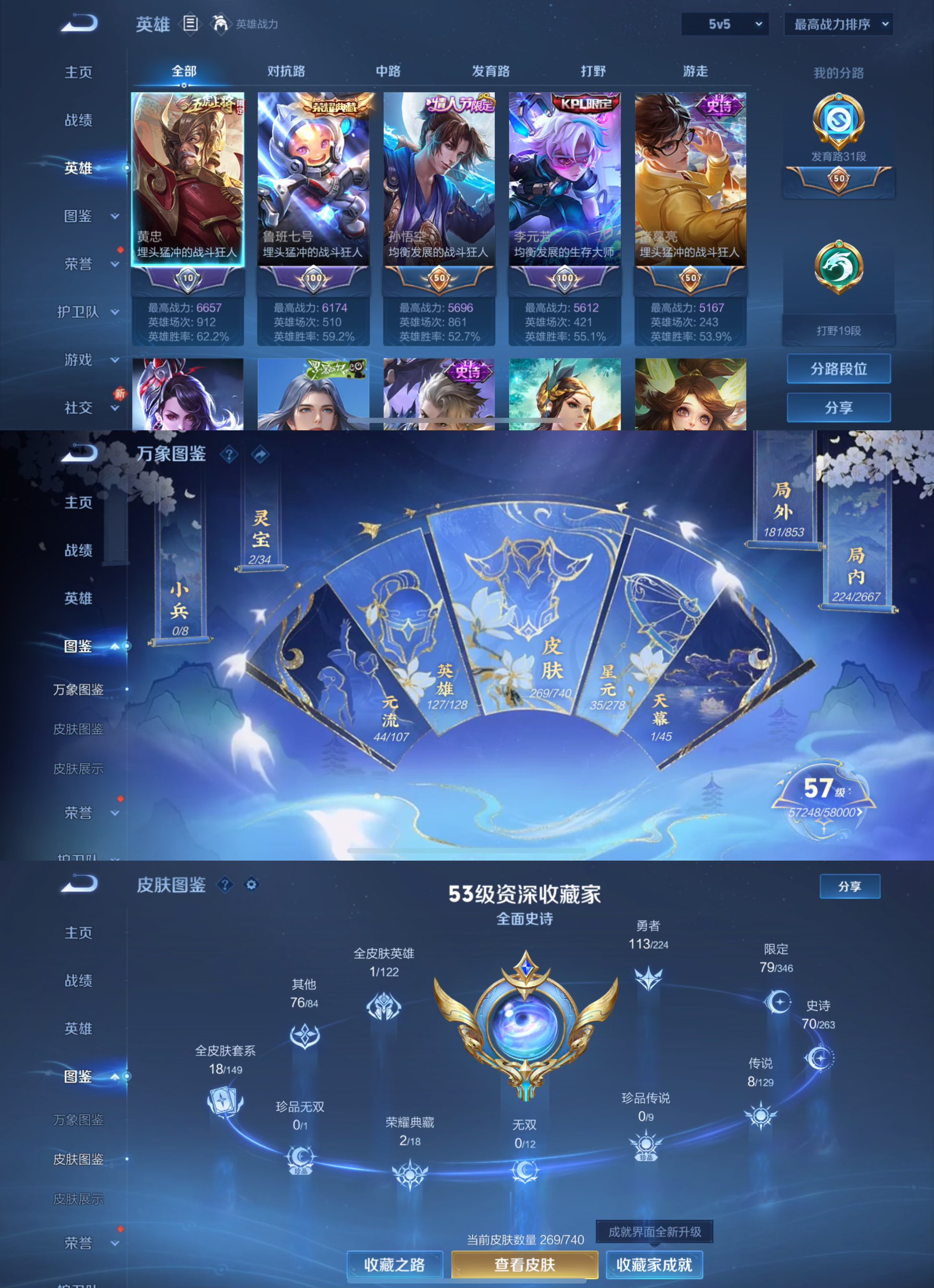 贵族等级:v7皮肤数:269传说品质8 生肖限定4 情人节限定1 荣耀典藏2 英雄数:127