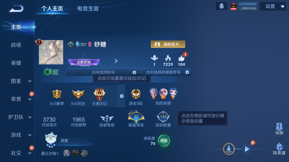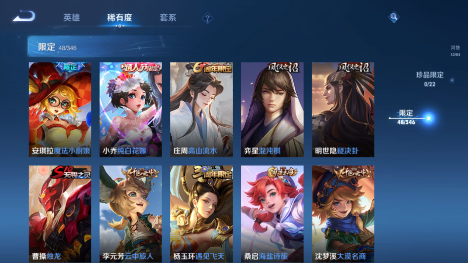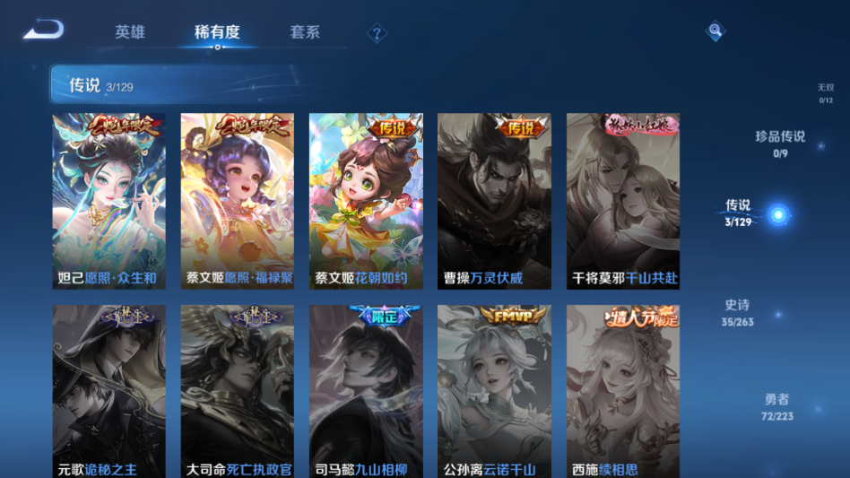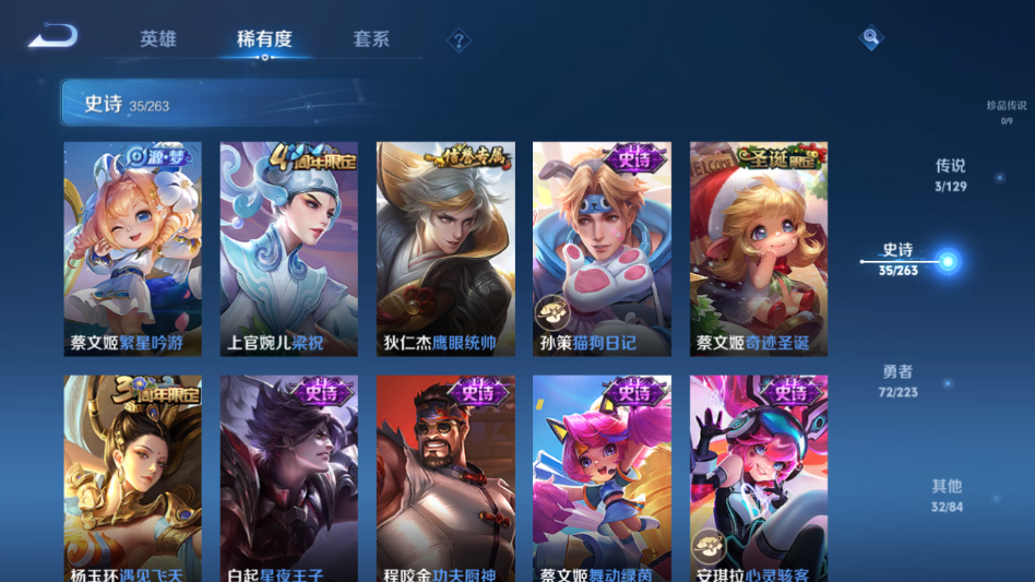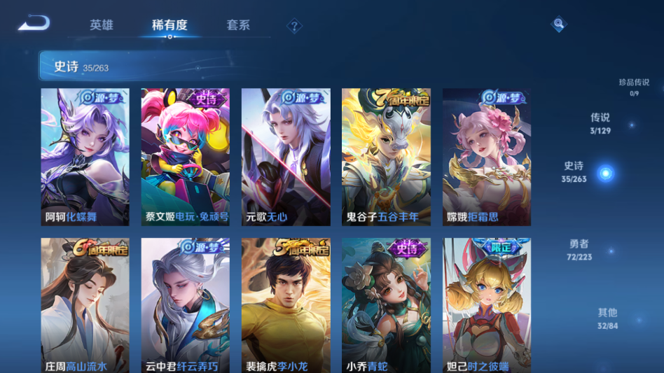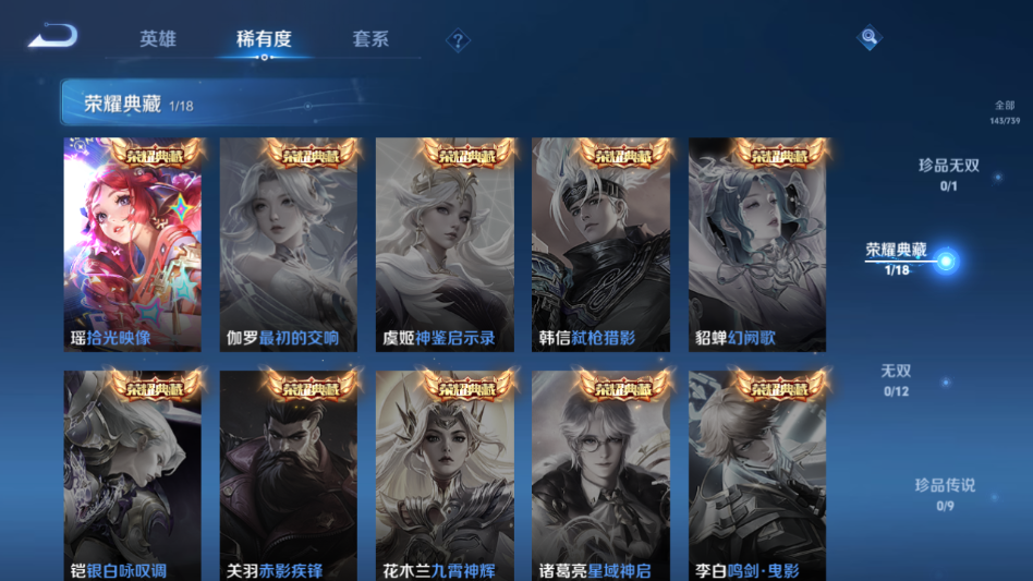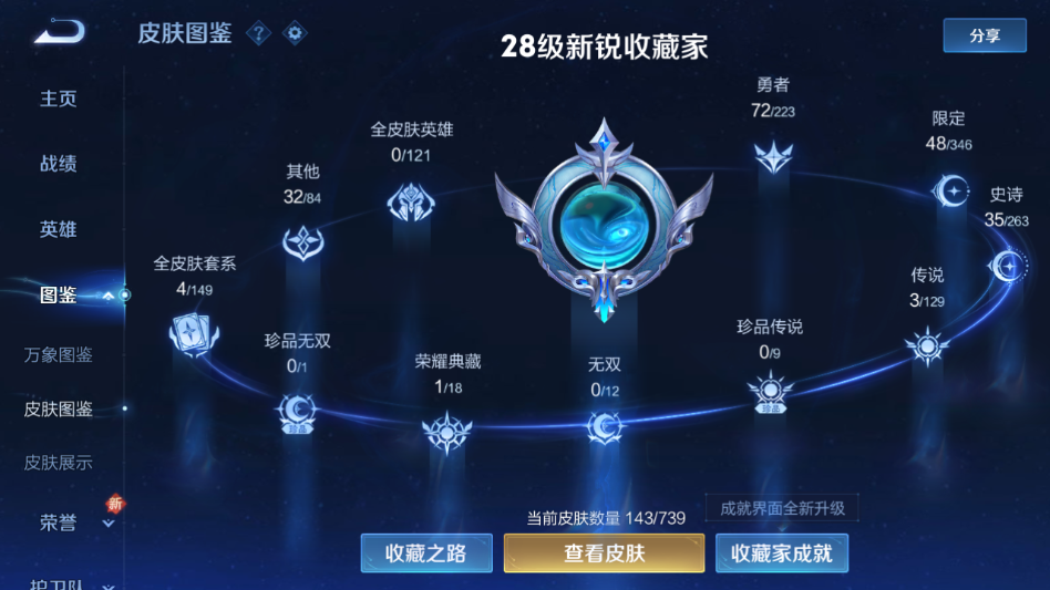 贵族等级:v7皮肤数:143传说品质3 生肖限定3 荣耀典藏1 情人节限定1 英雄数:123