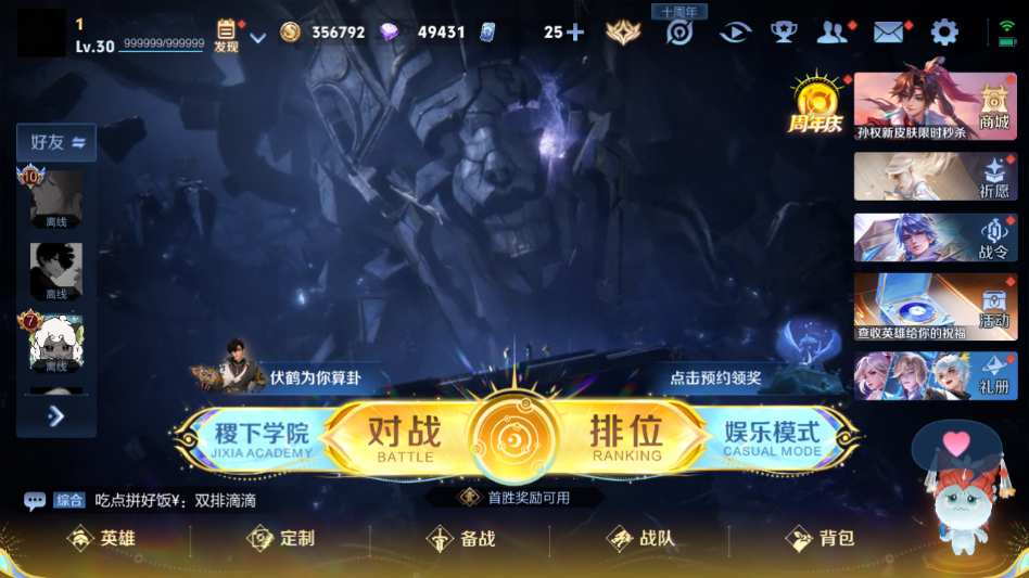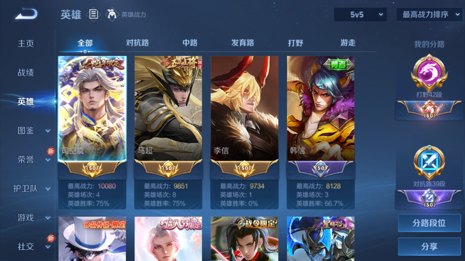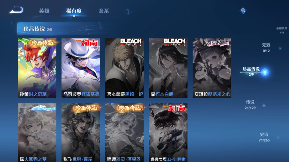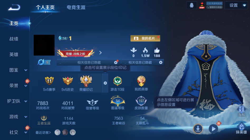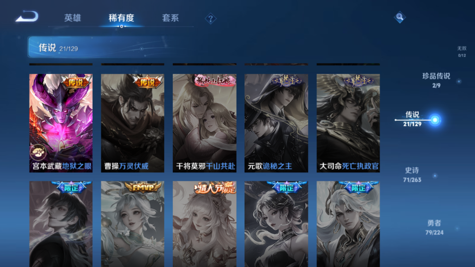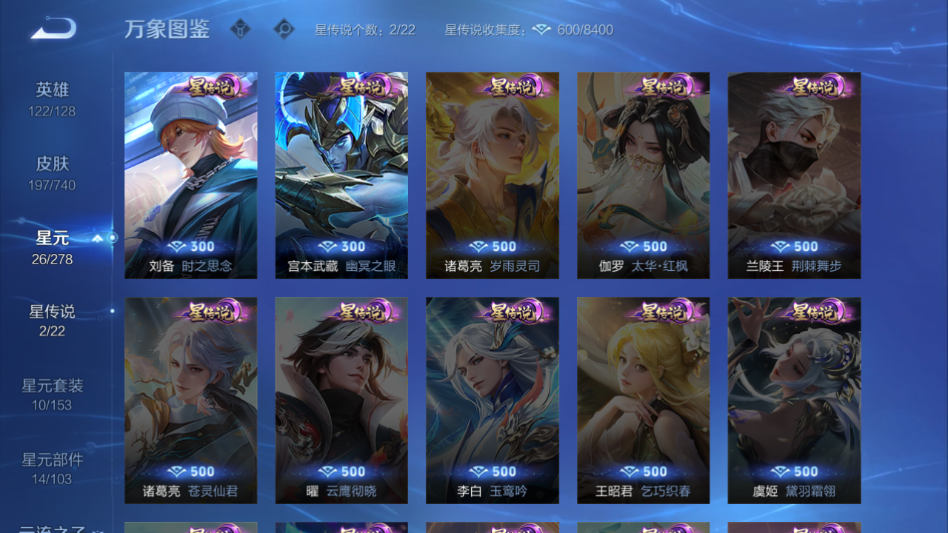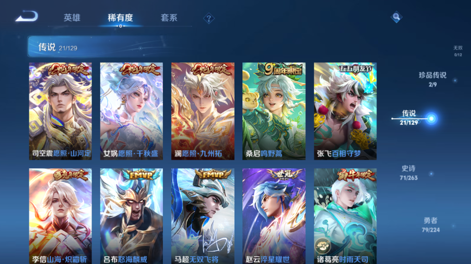 贵族等级:v8皮肤数:198传说品质21 生肖限定6 情人节限定1 珍品传说2 荣耀典藏1 英雄数:122