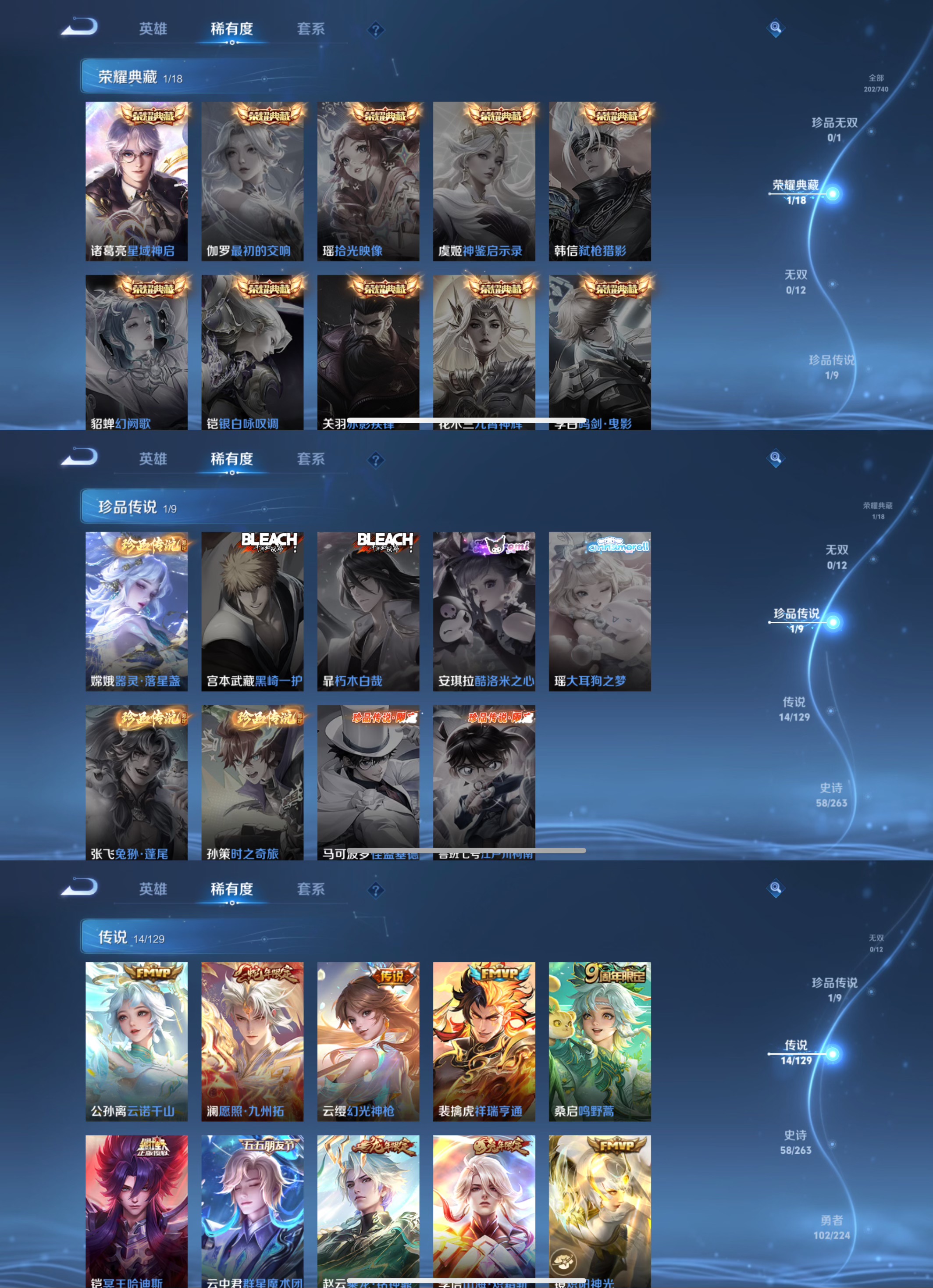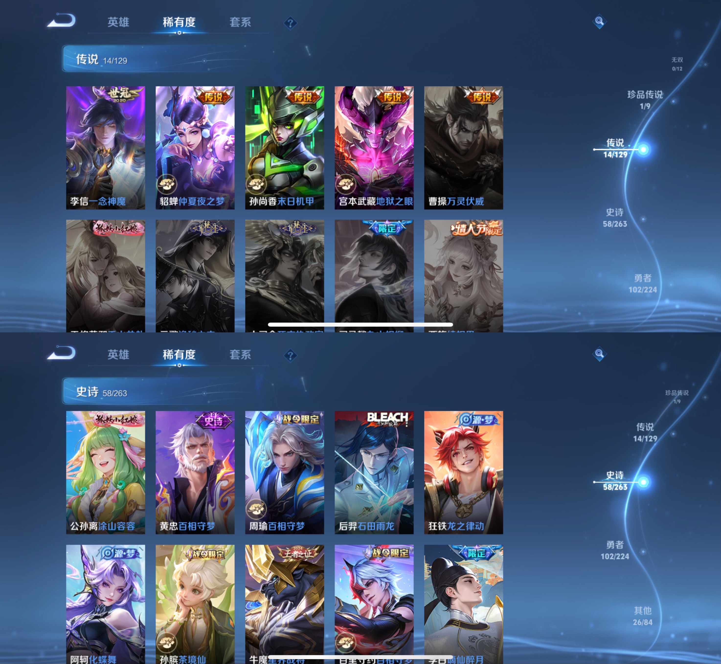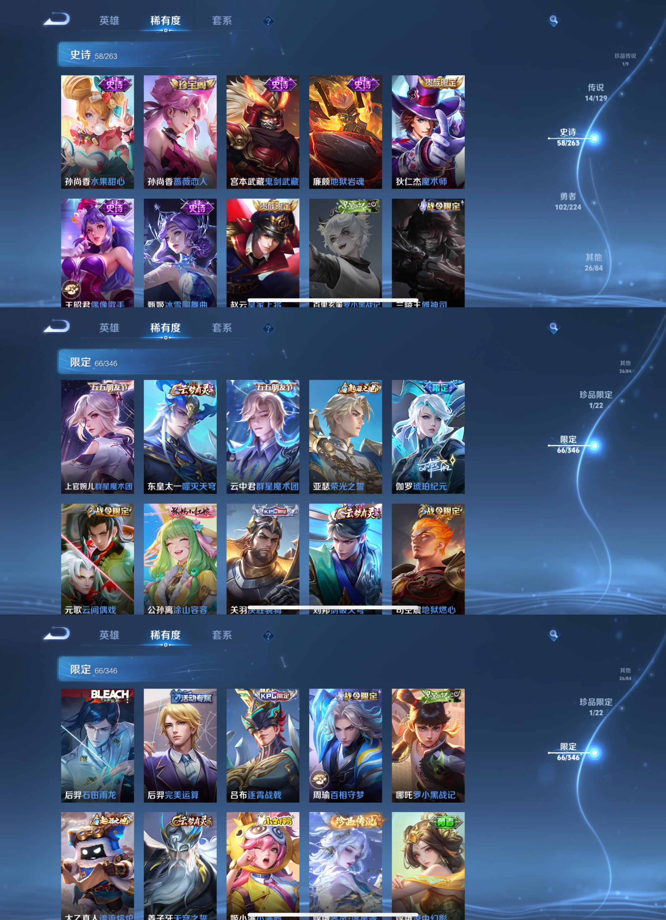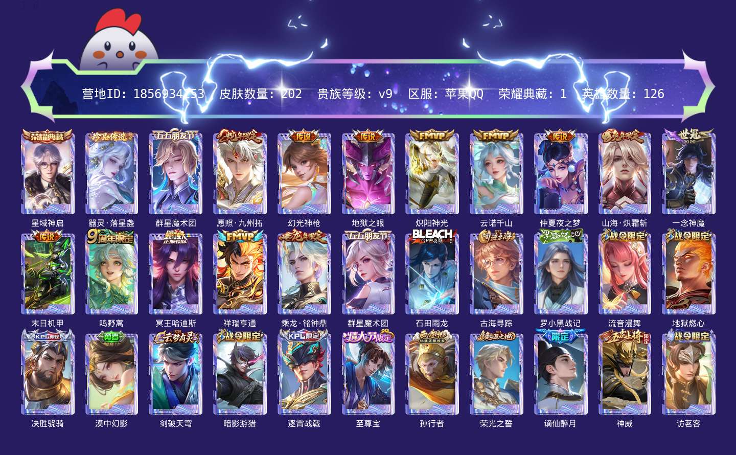 贵族等级:v9皮肤数:202传说品质14 生肖限定4 珍品传说1 荣耀典藏1 情人节限定1 英雄数:126
