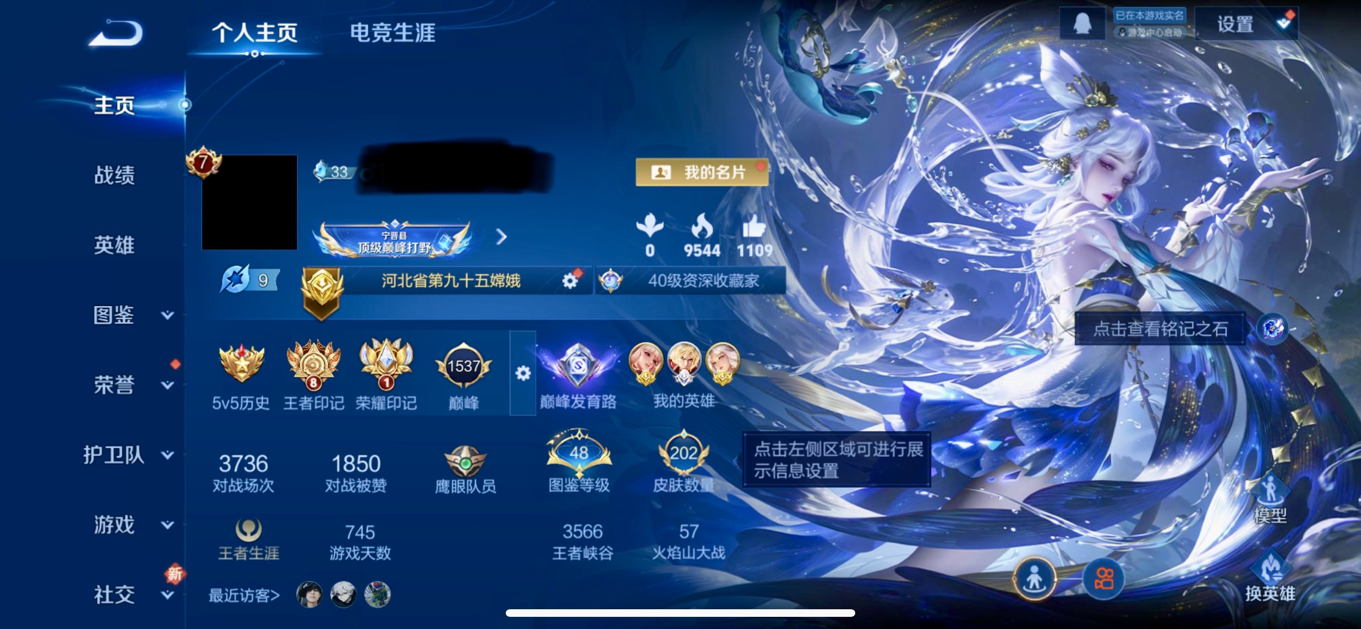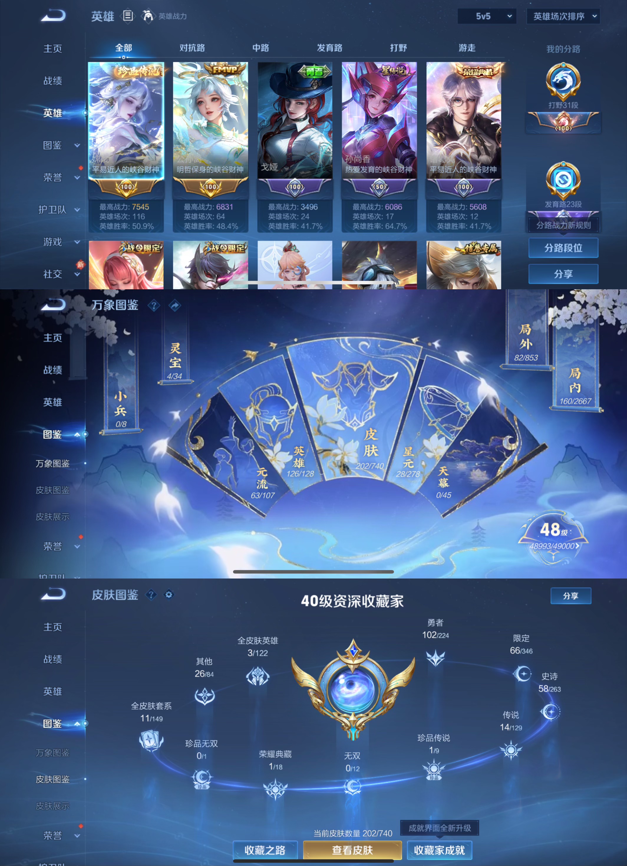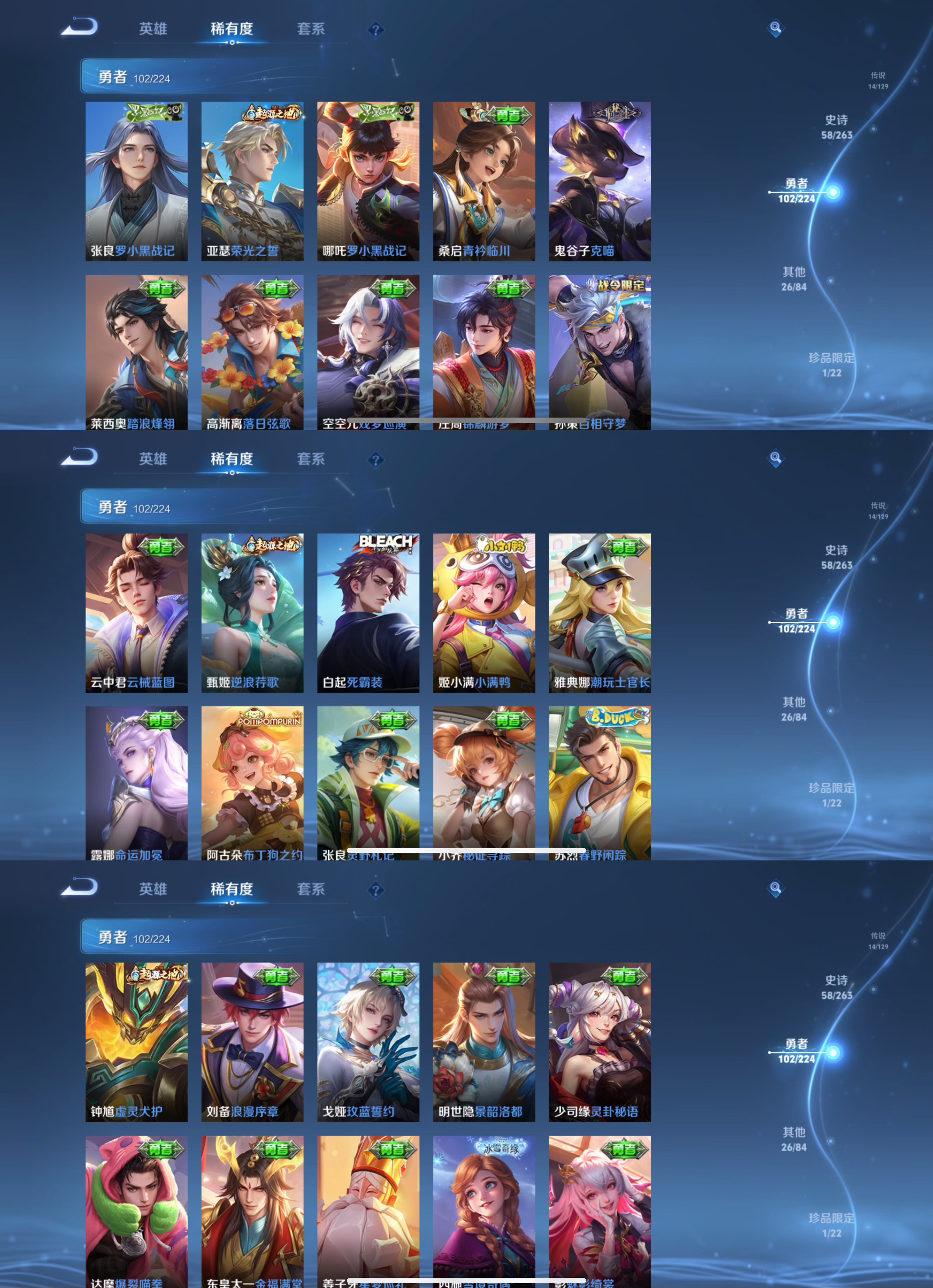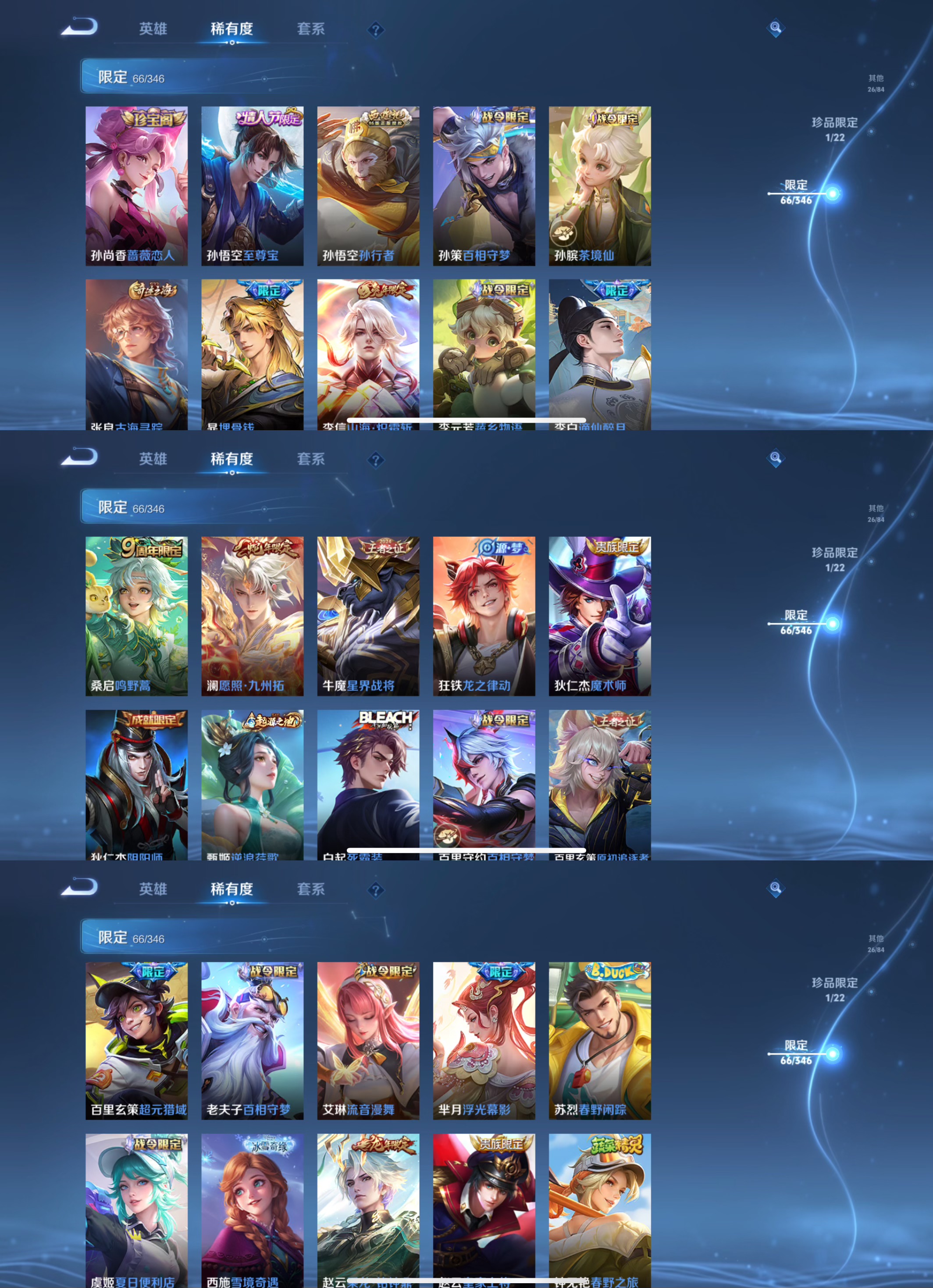 贵族等级:v9皮肤数:202传说品质14 生肖限定4 珍品传说1 荣耀典藏1 情人节限定1 英雄数:126