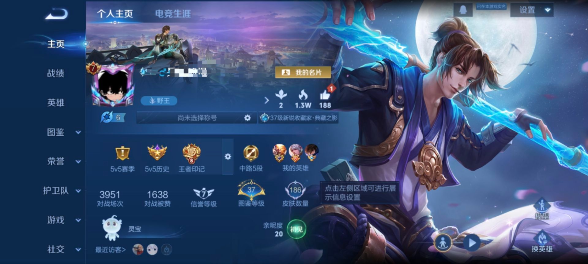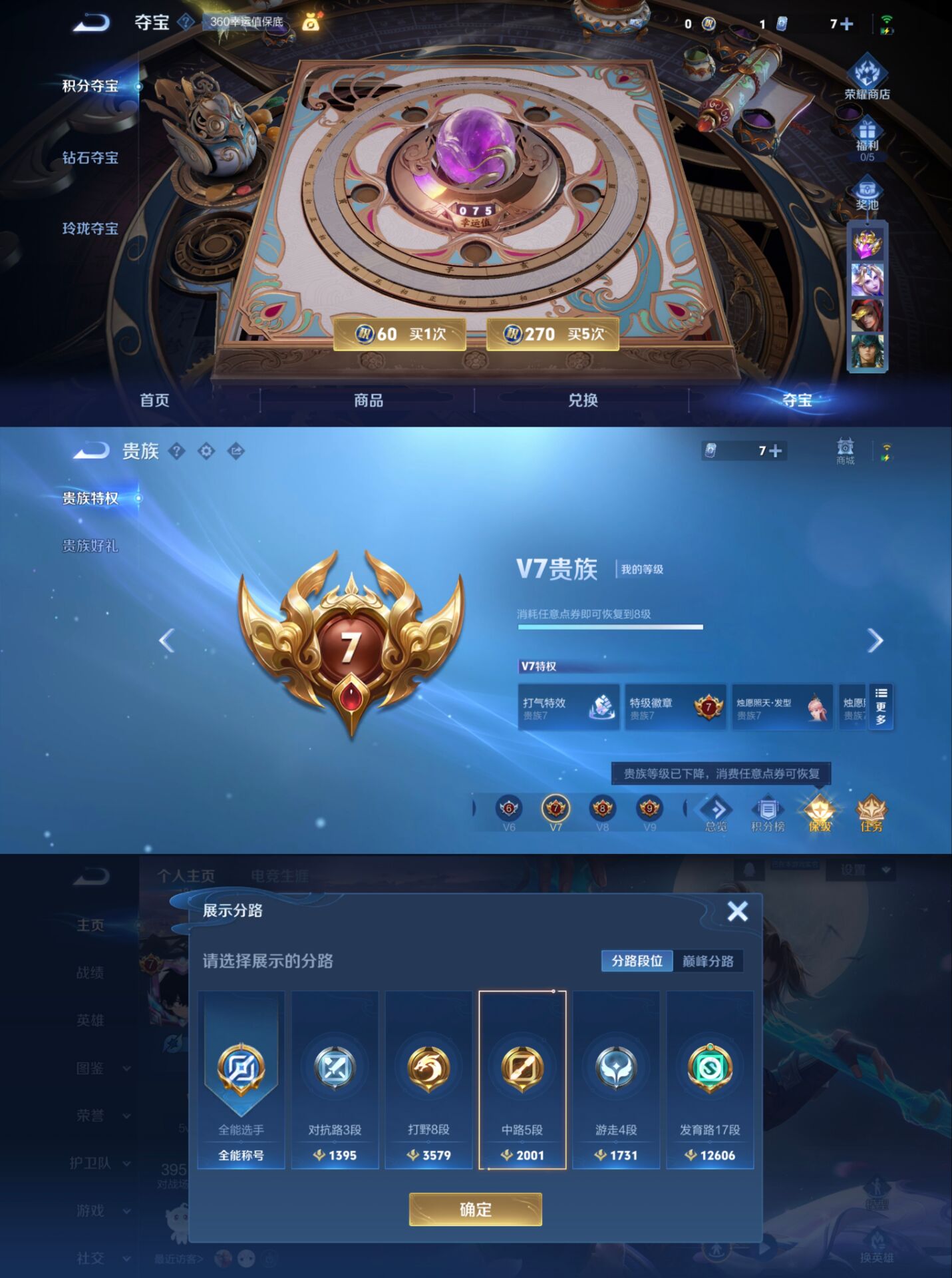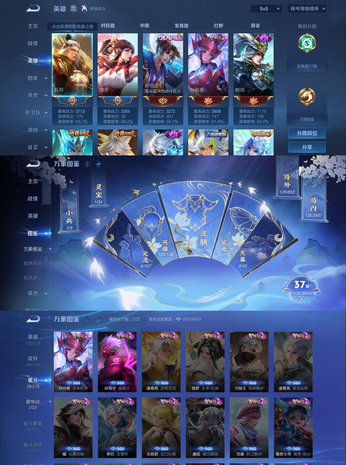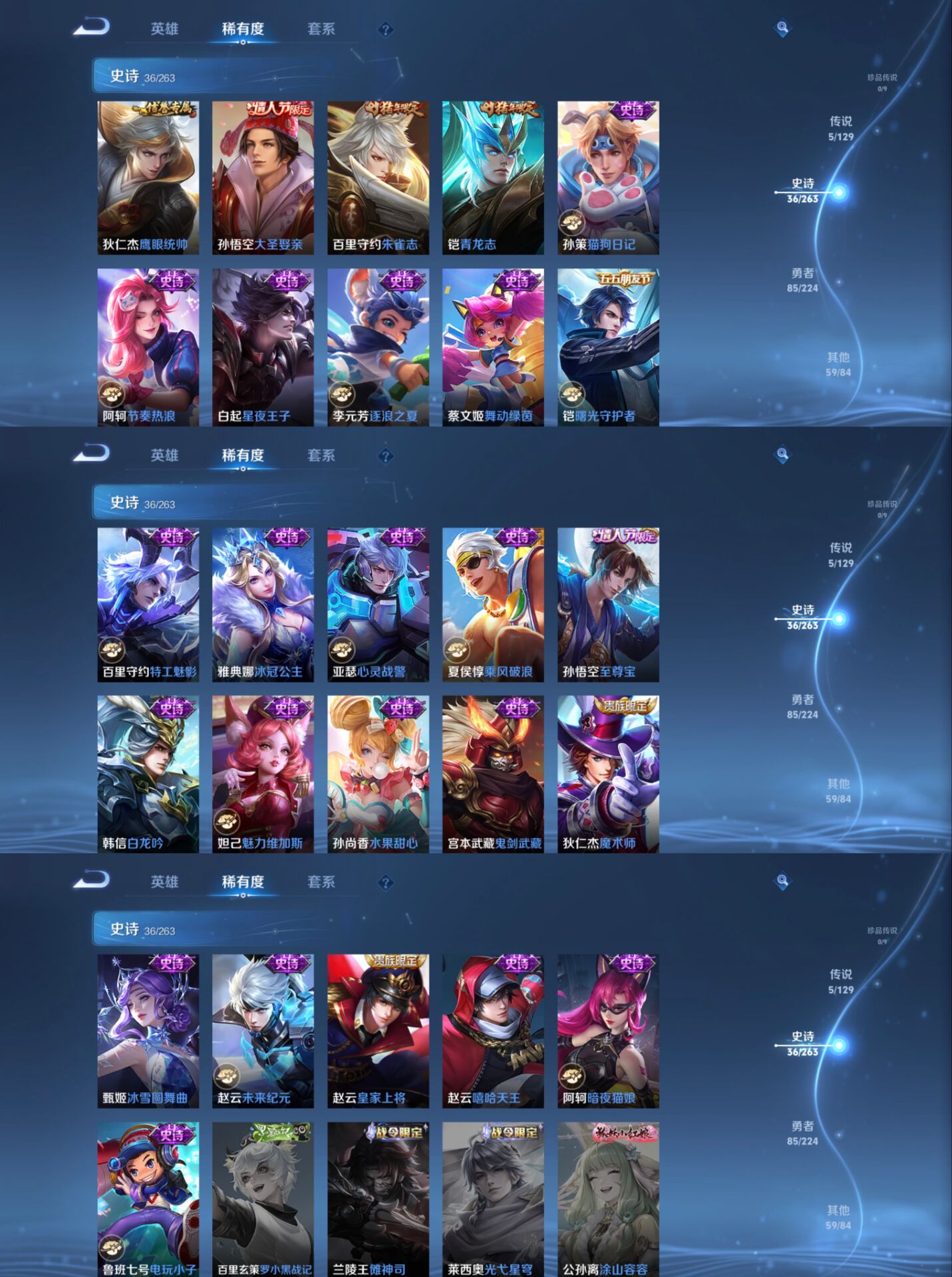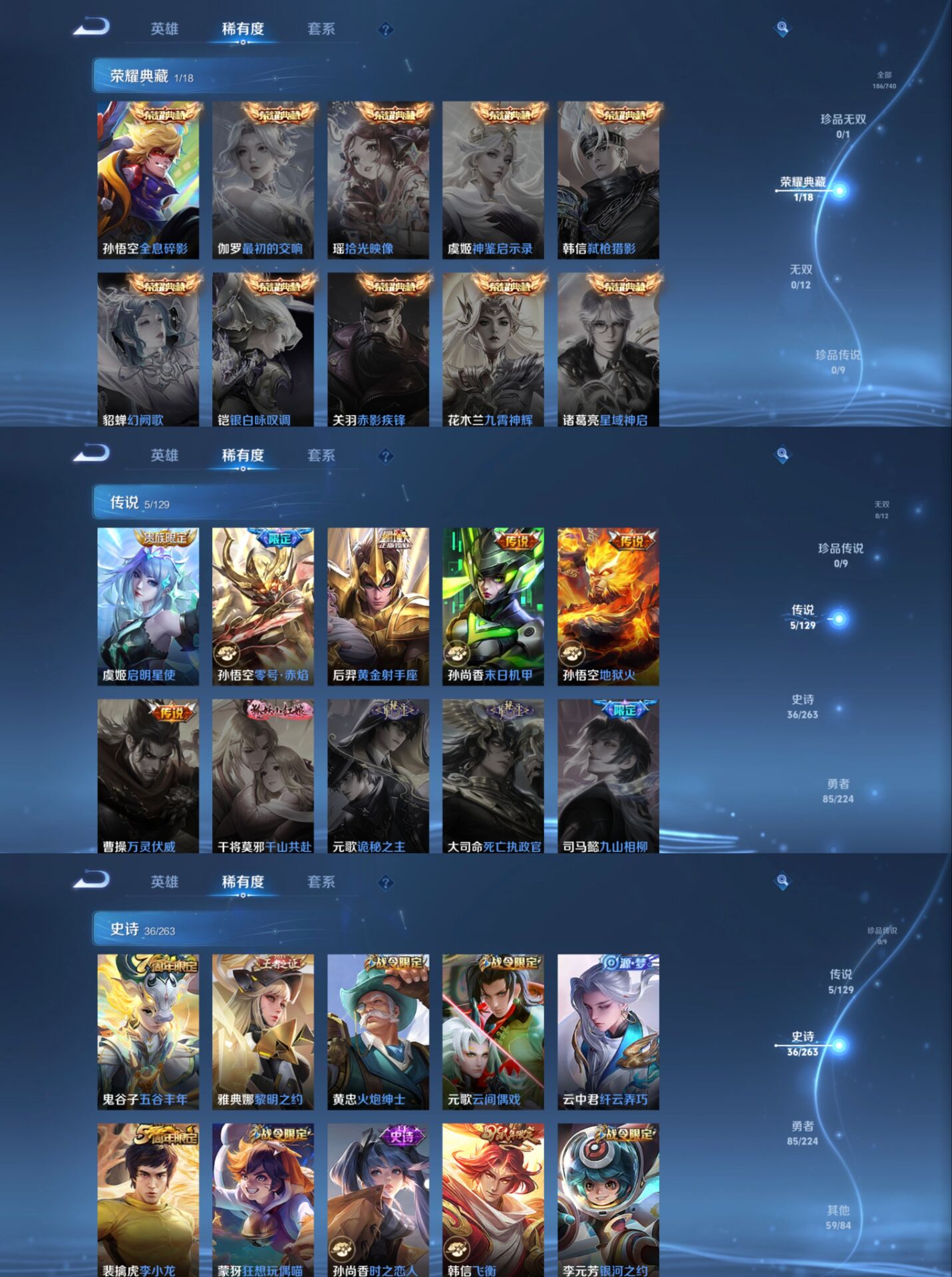 贵族等级:v8皮肤数:186传说品质5 情人节限定2 荣耀典藏1 生肖限定3 英雄数:125