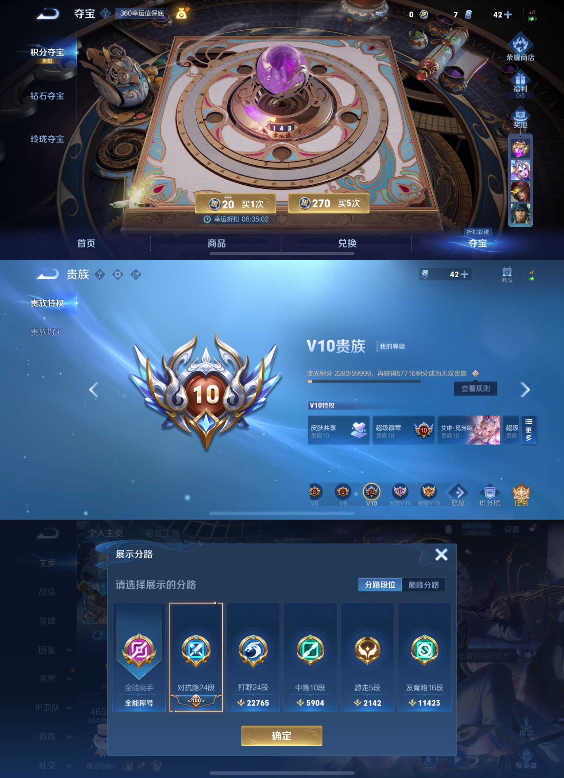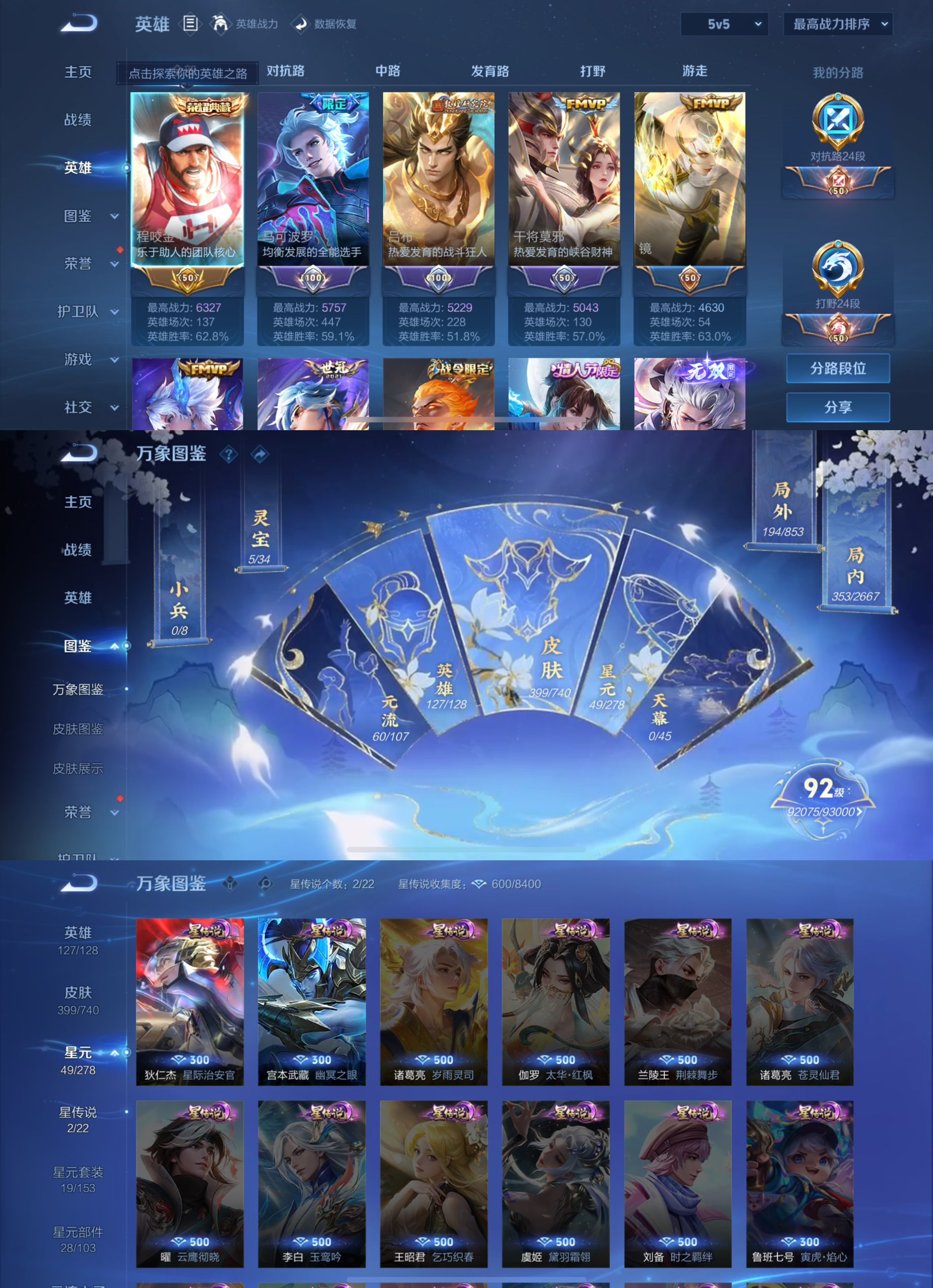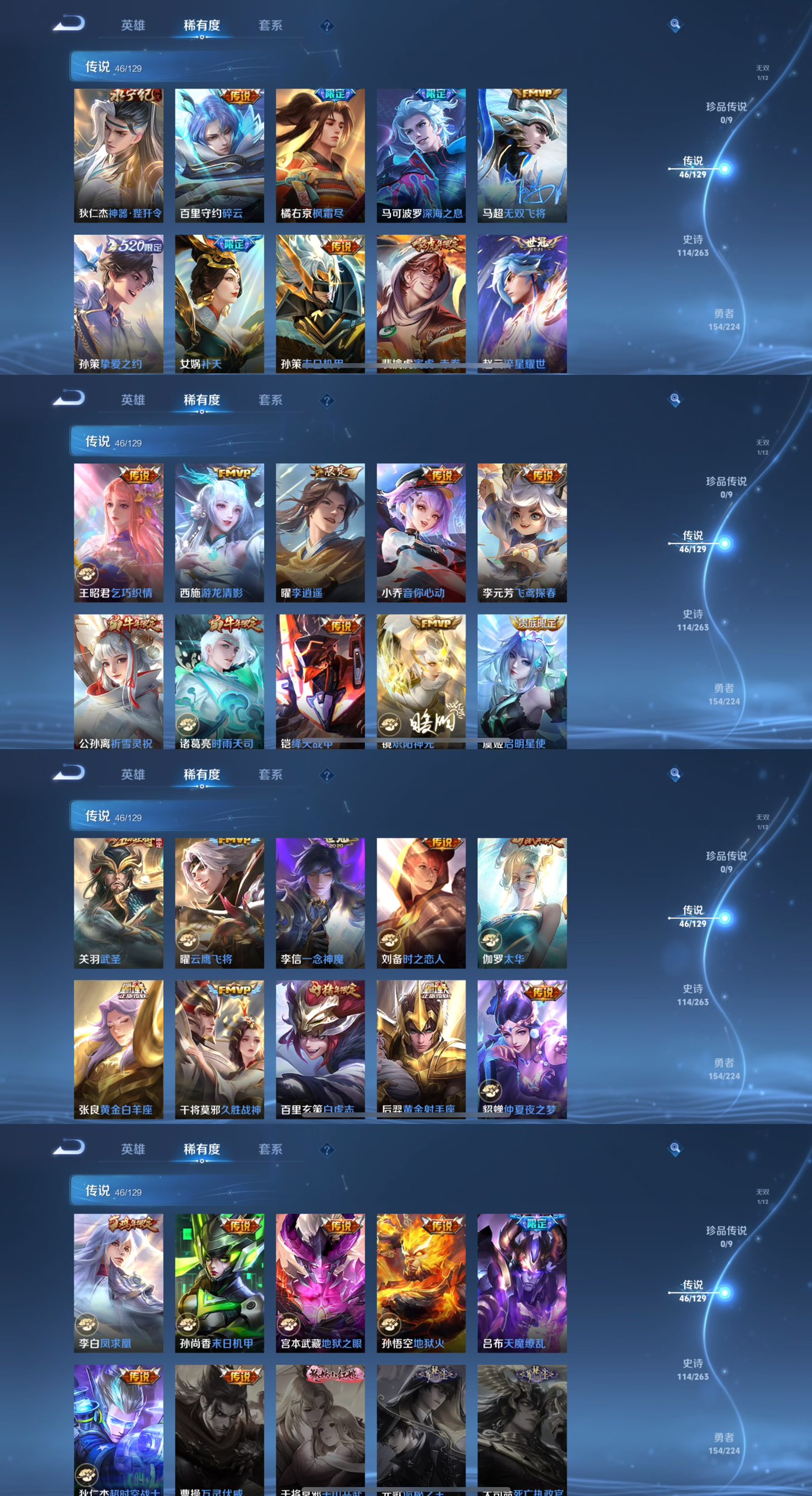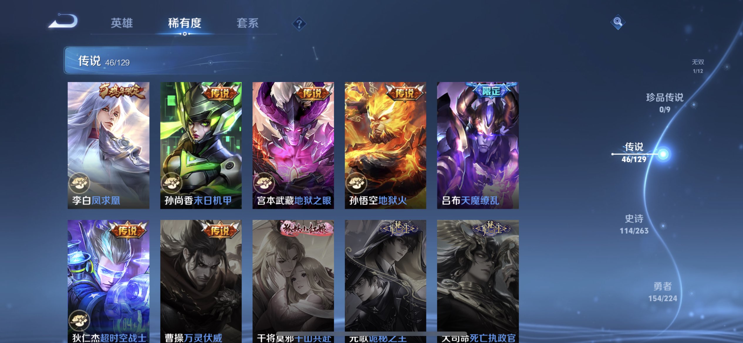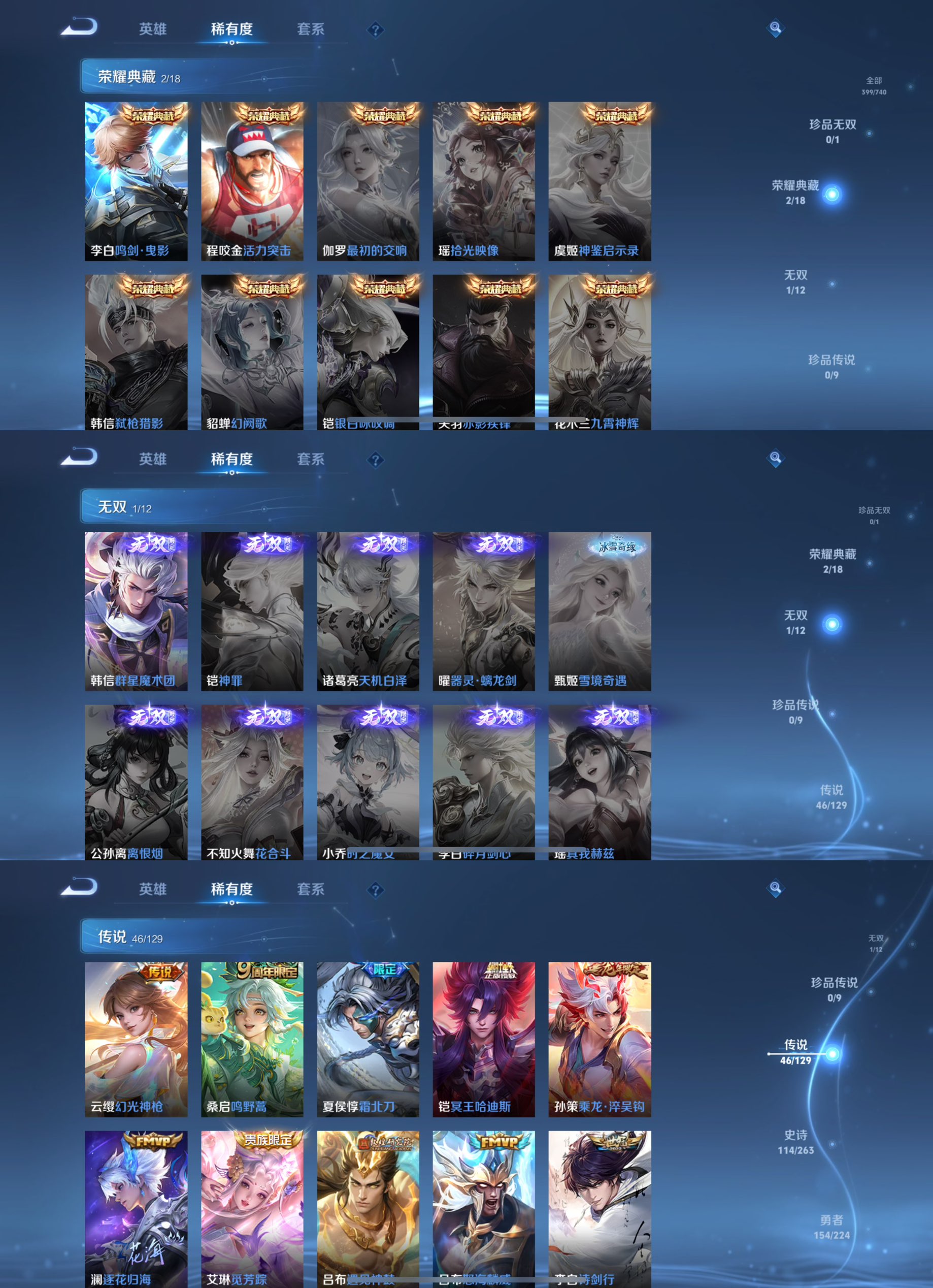 贵族等级:v10皮肤数:399传说品质46 情人节限定3 生肖限定12 荣耀典藏2 无双1 英雄数:127
